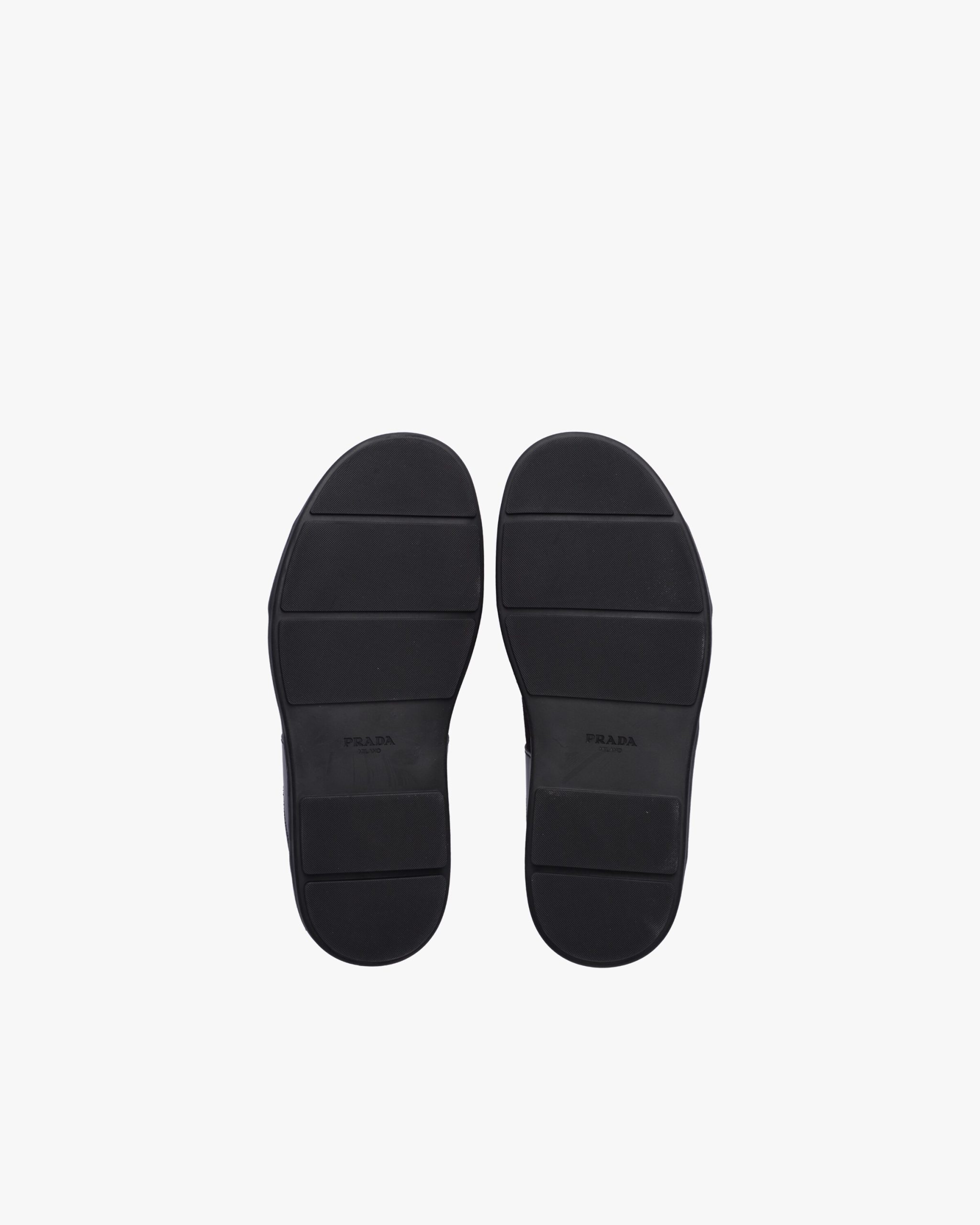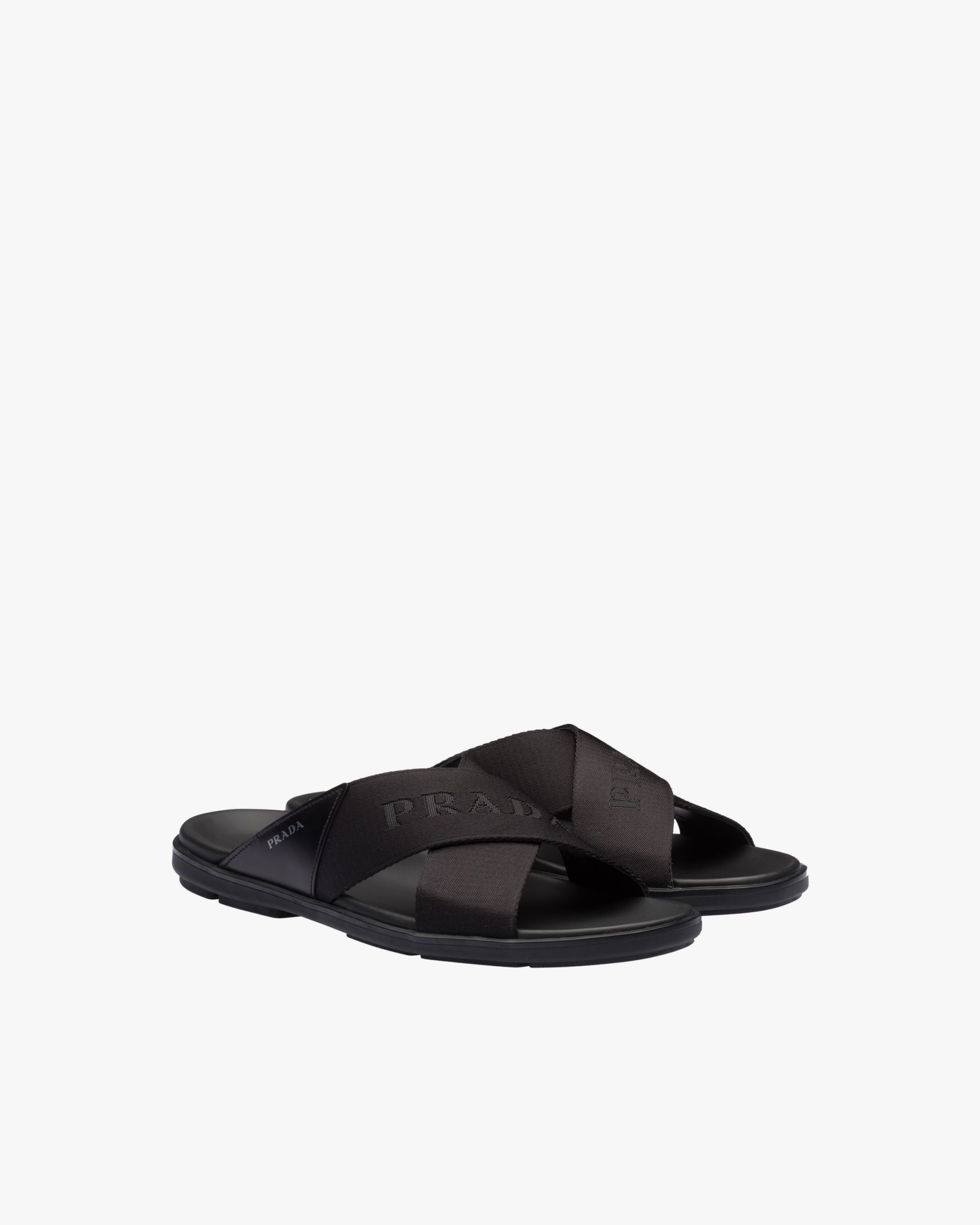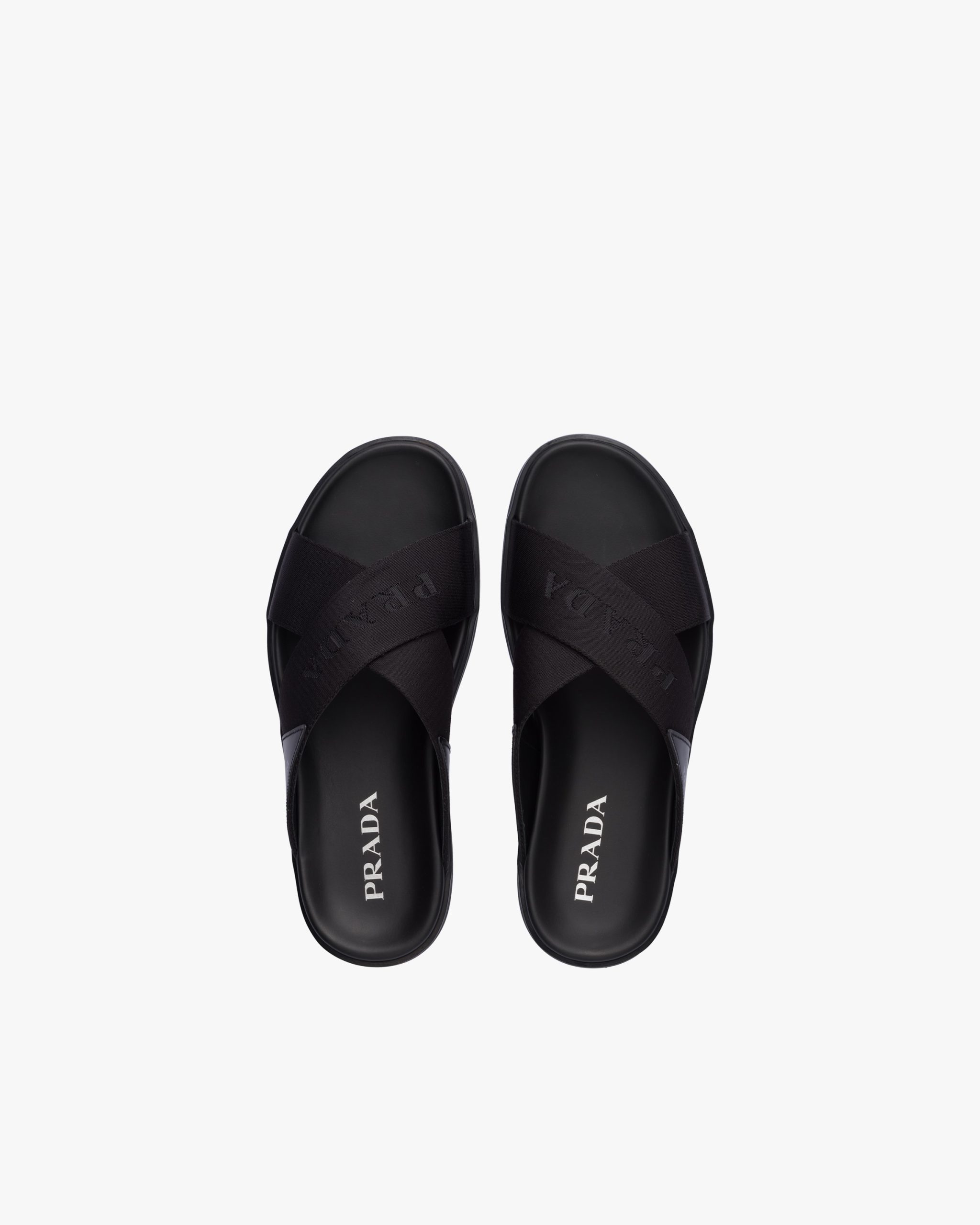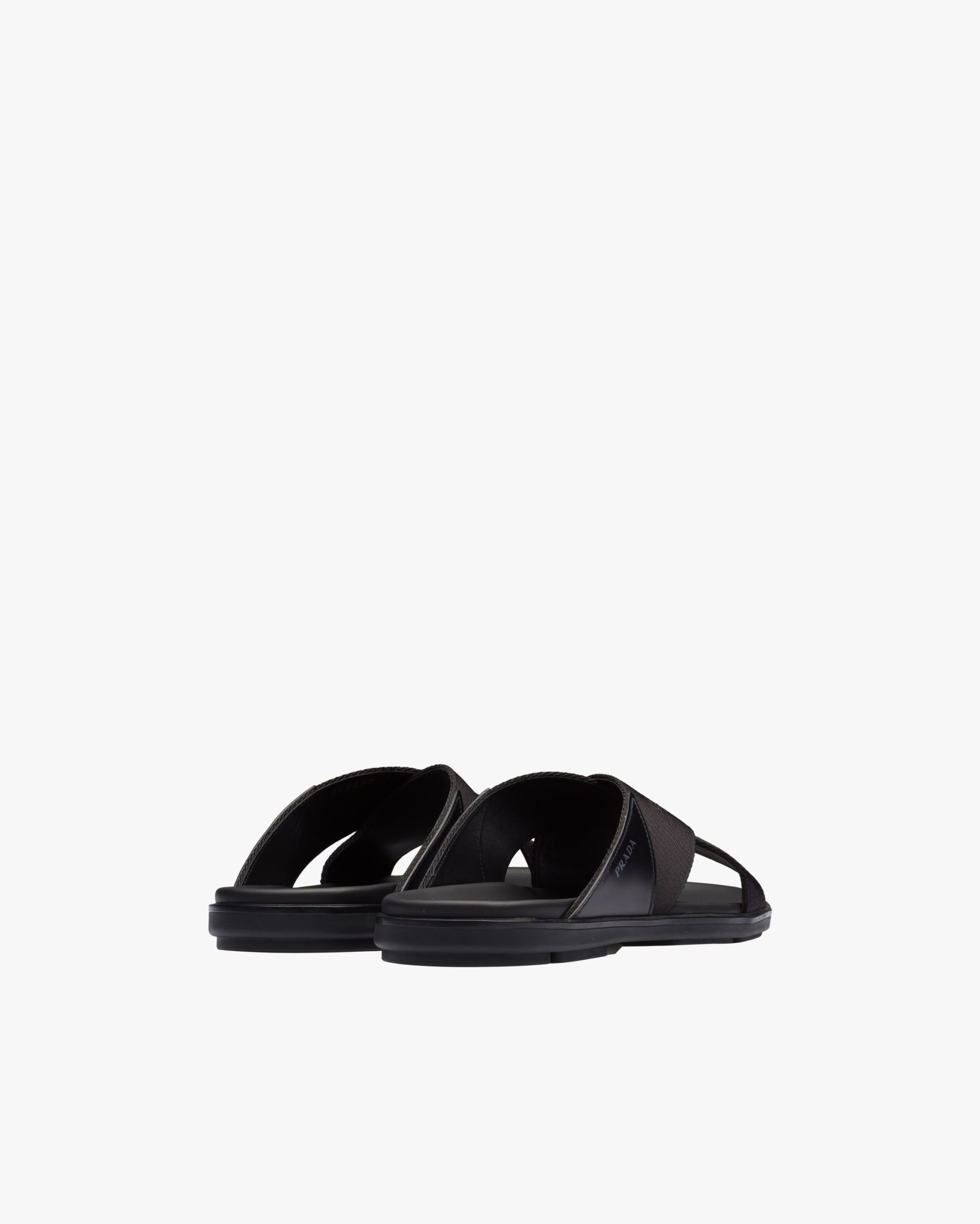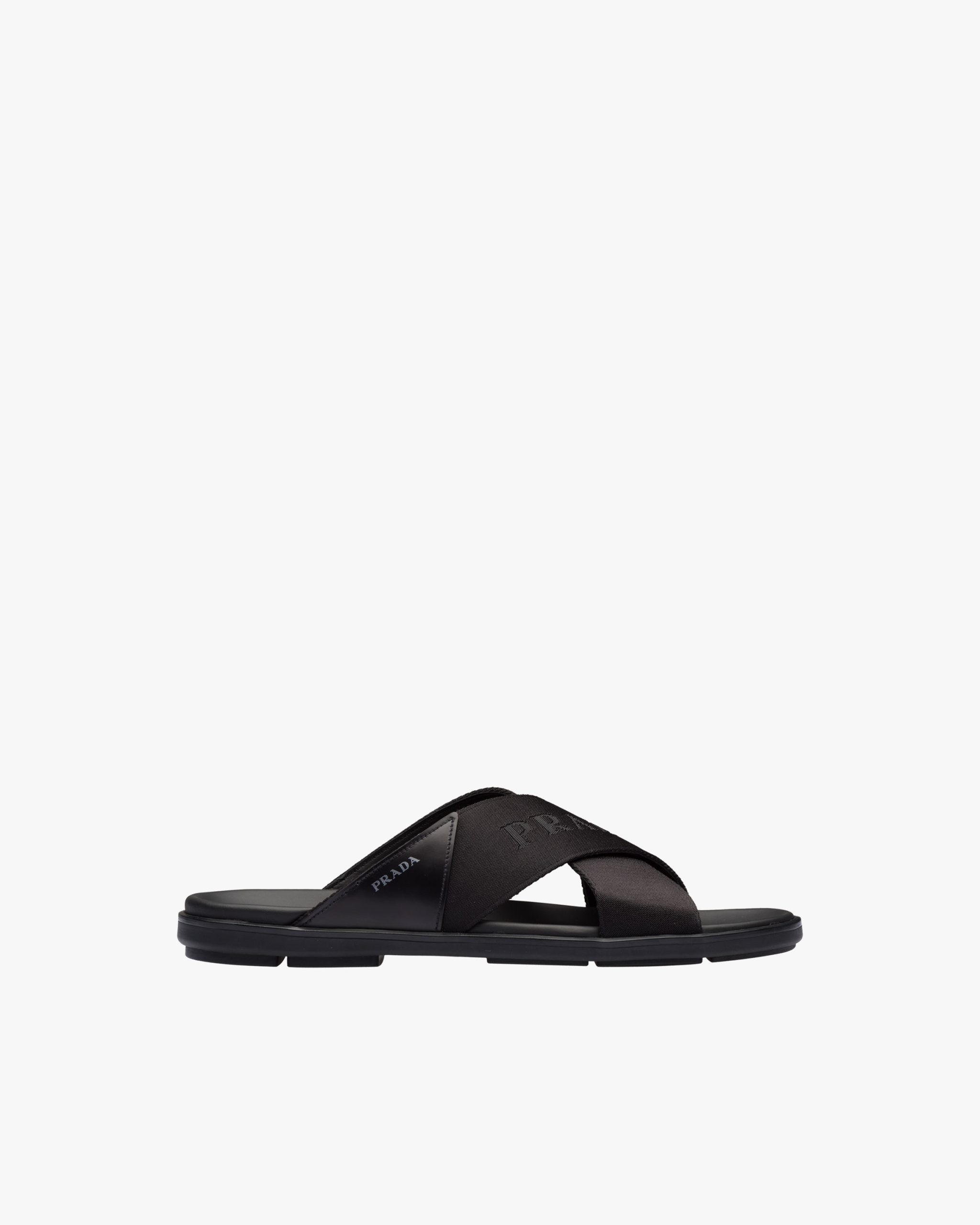 The Prada logo appears on the double band that characterizes these leather sandals. The rubber sole adds a casual note to the footwear and brings to mind the sports world.