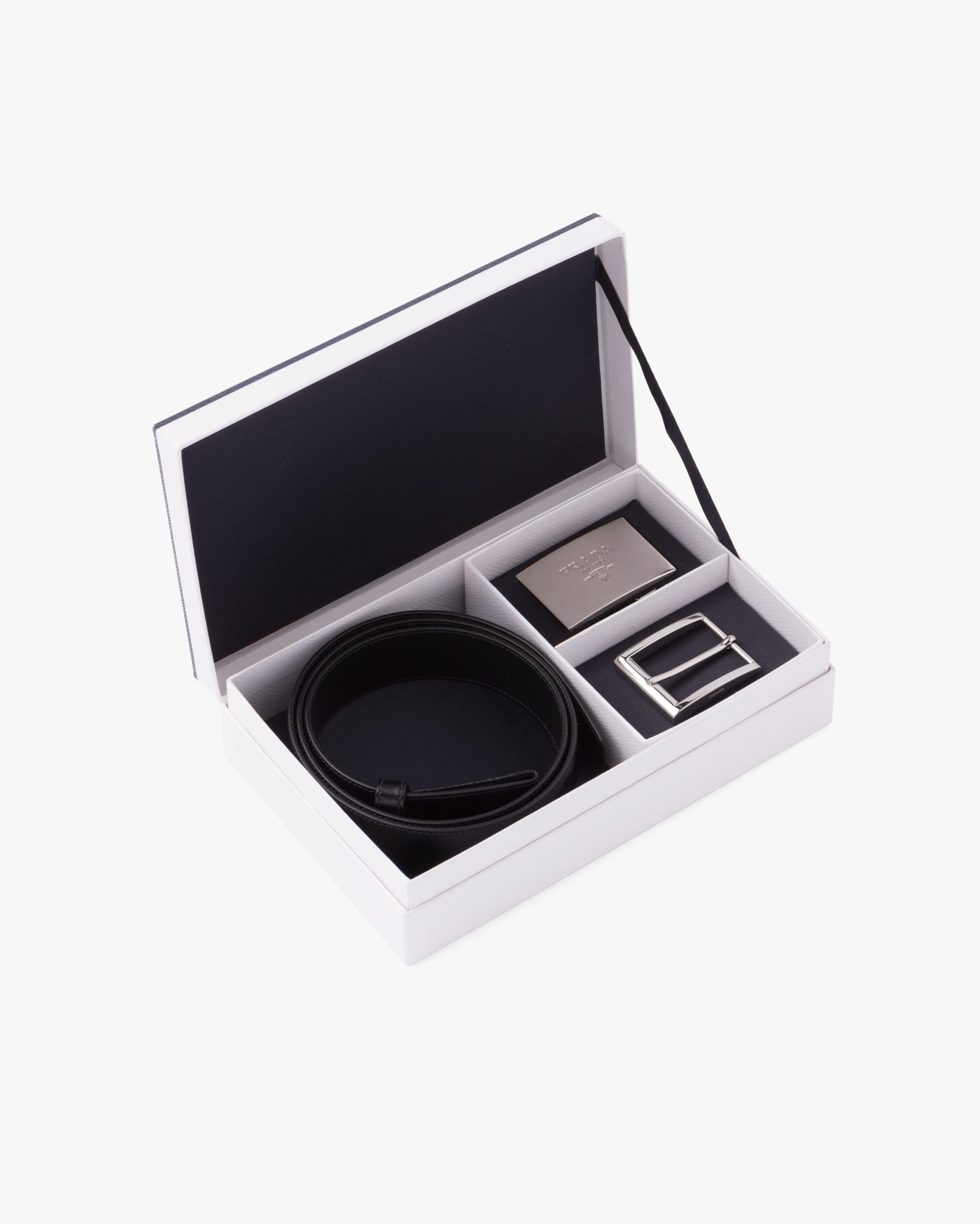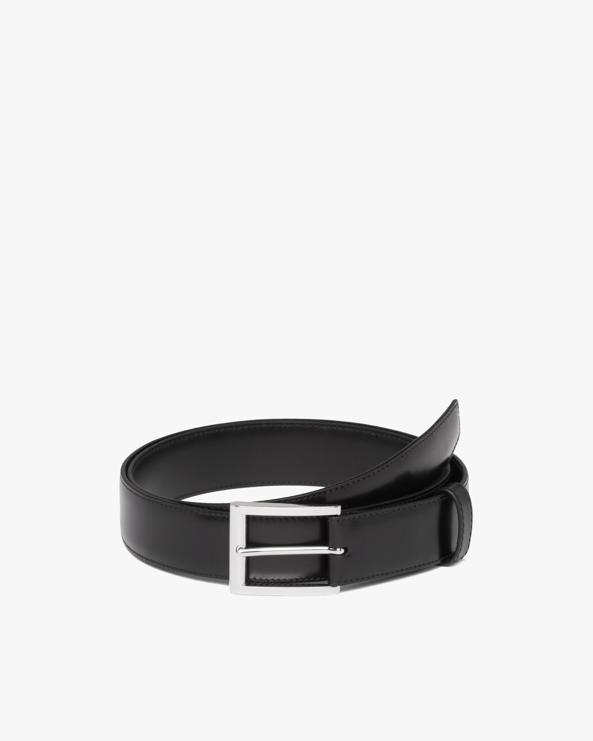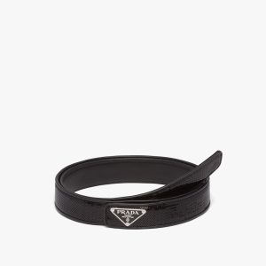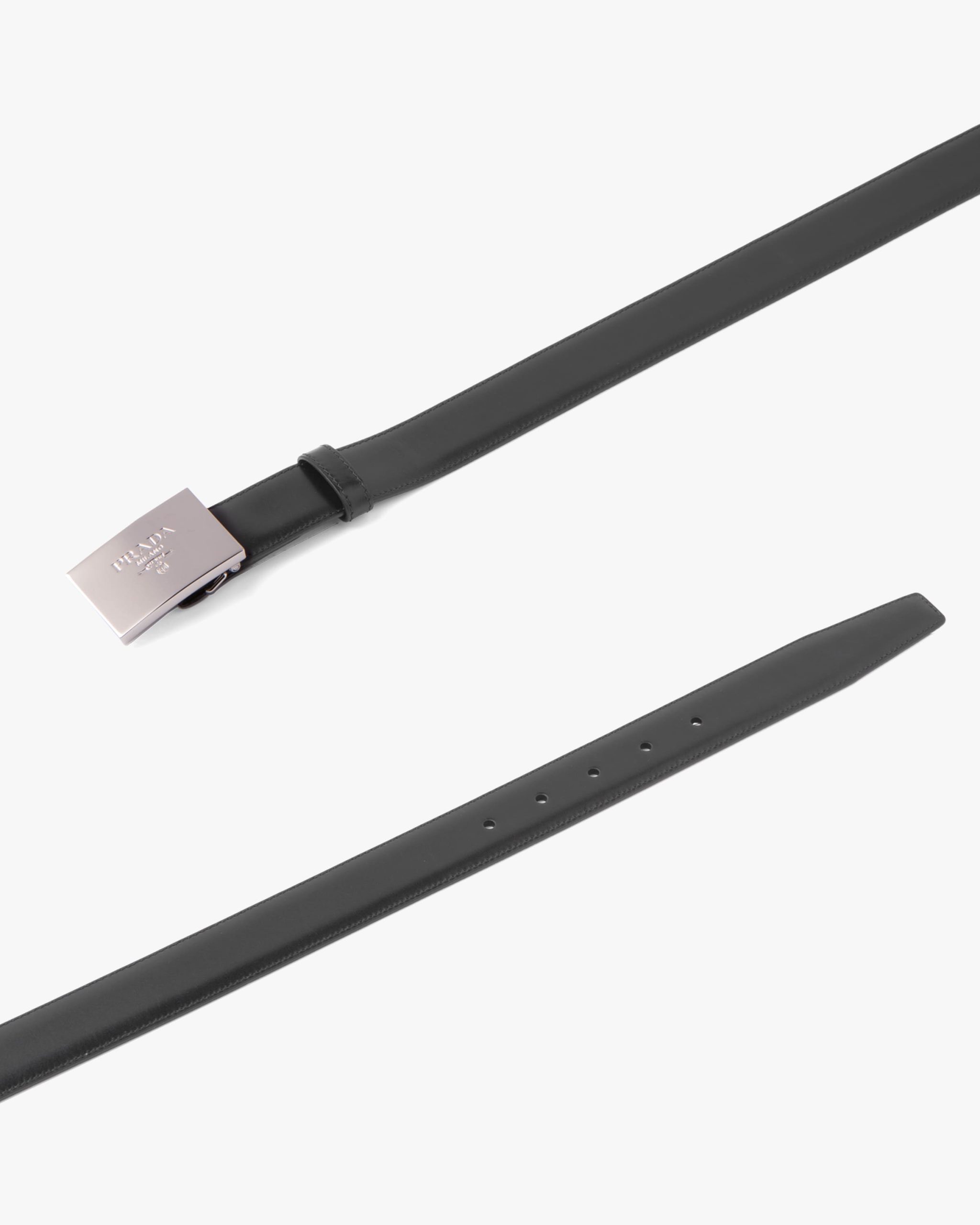 A timeless accessory updated with contemporary spirit: this leather belt has two interchangeable 925 sterling silver buckles, both decorated with the Prada logo that appears on one as a delicate element and on the other as a more conspicuous feature.