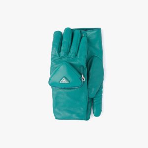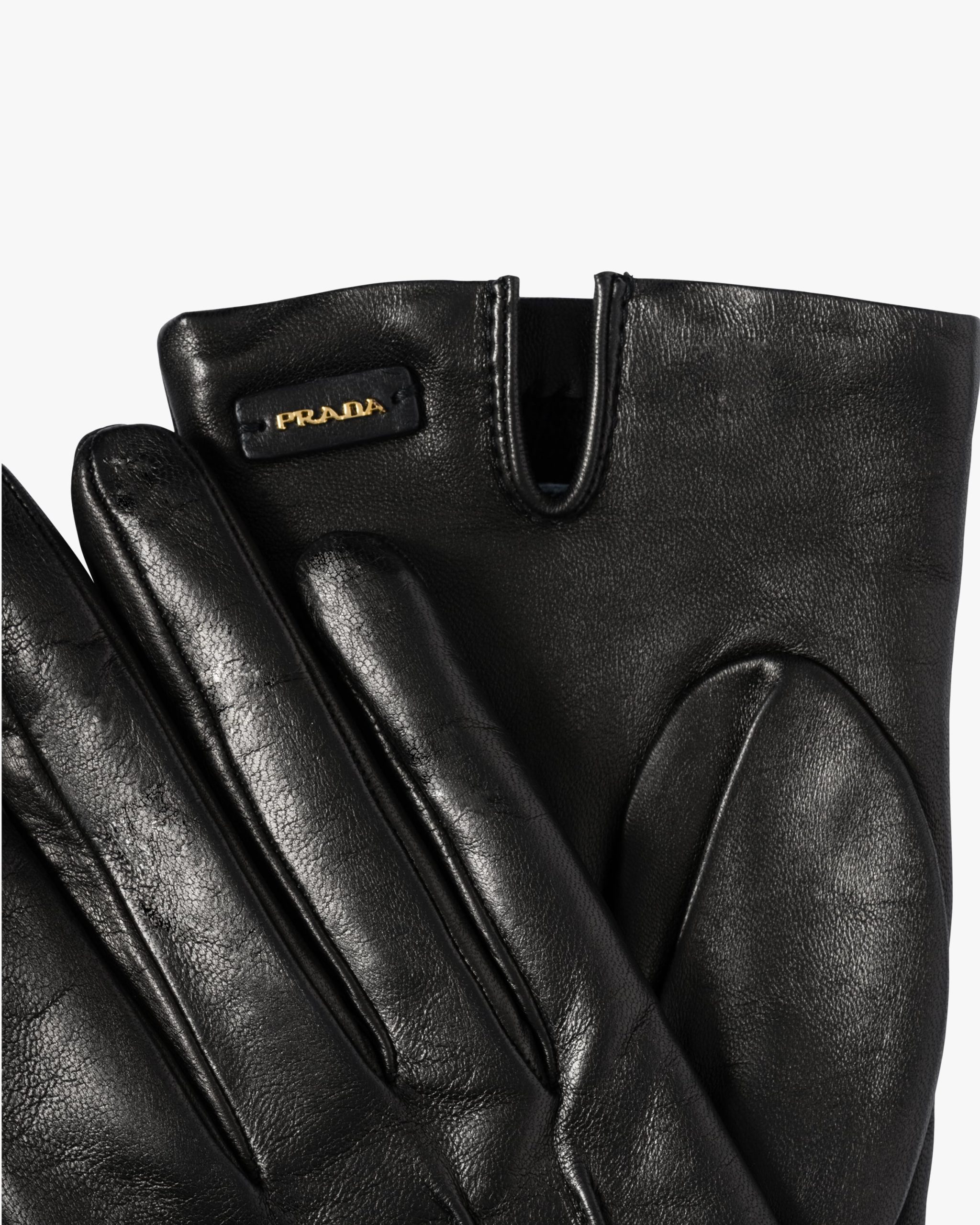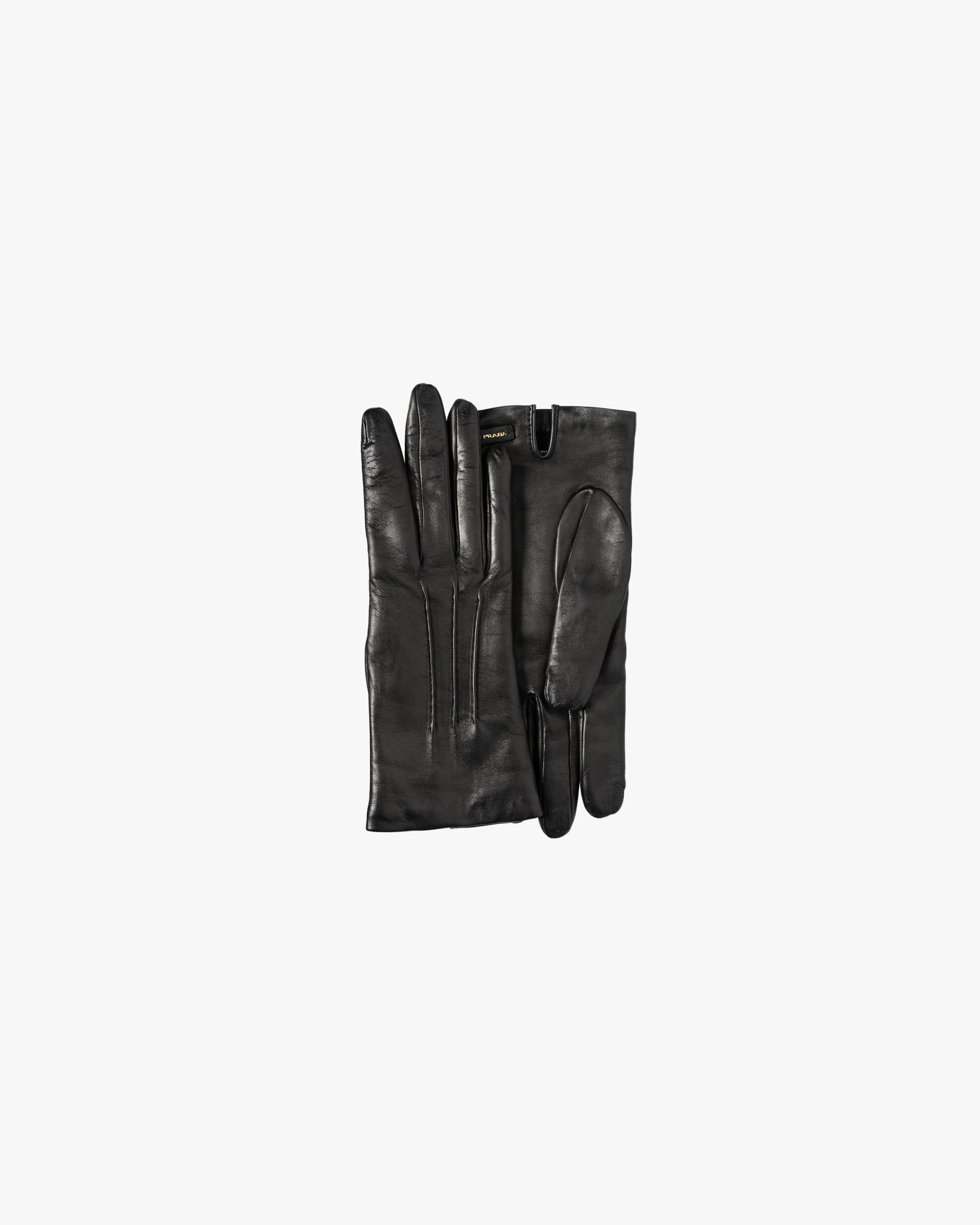 Short Nappa leather gloves lined with cashmere and with a Prada logo at the wrist.
