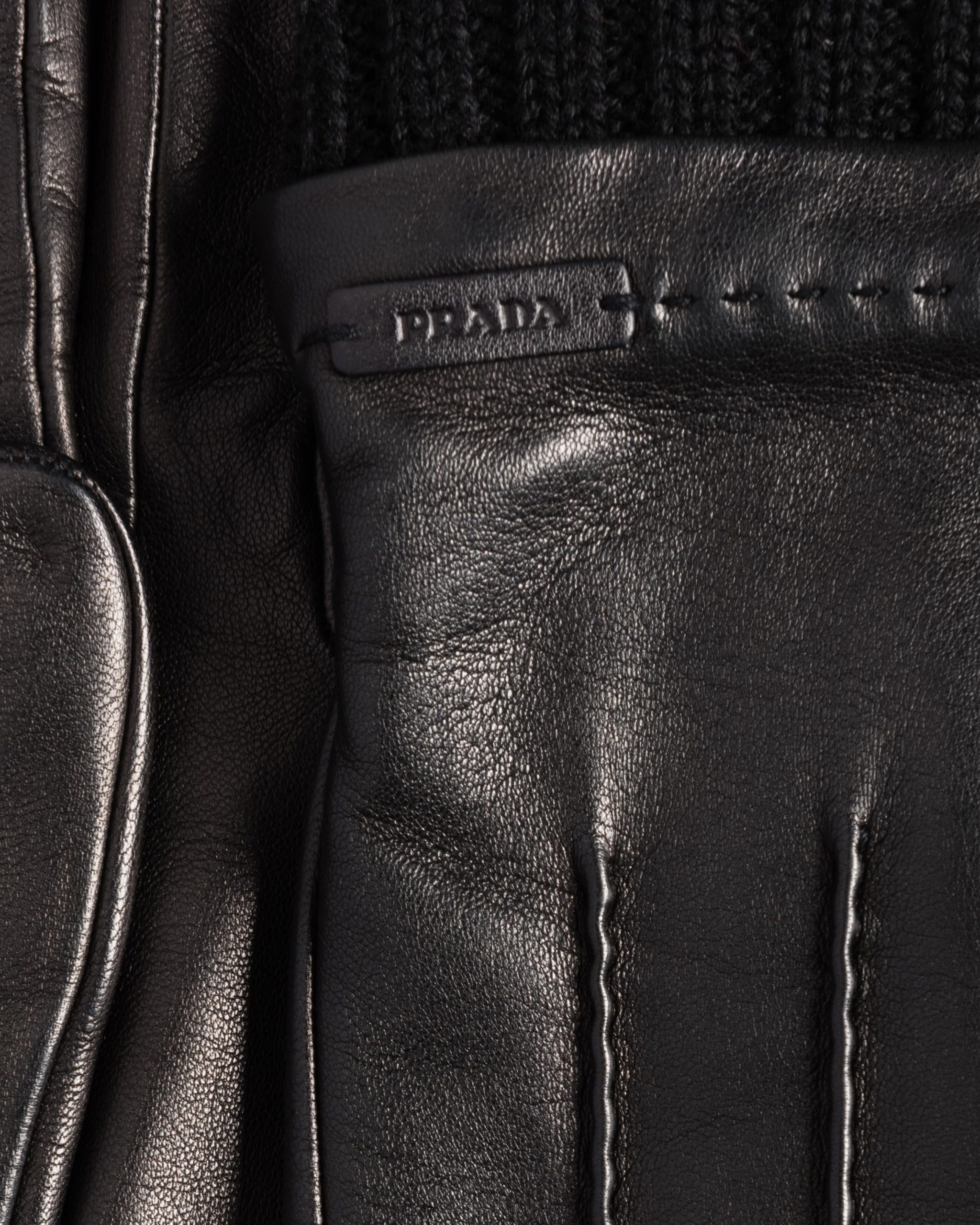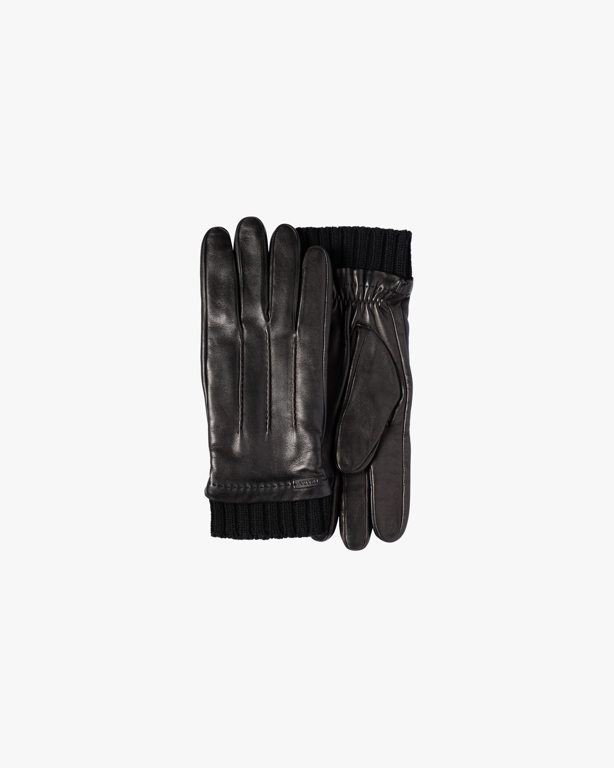Cashmere lined leather gloves with three-line detail. The heat-embossed logo is stitched above the knitted wrist.