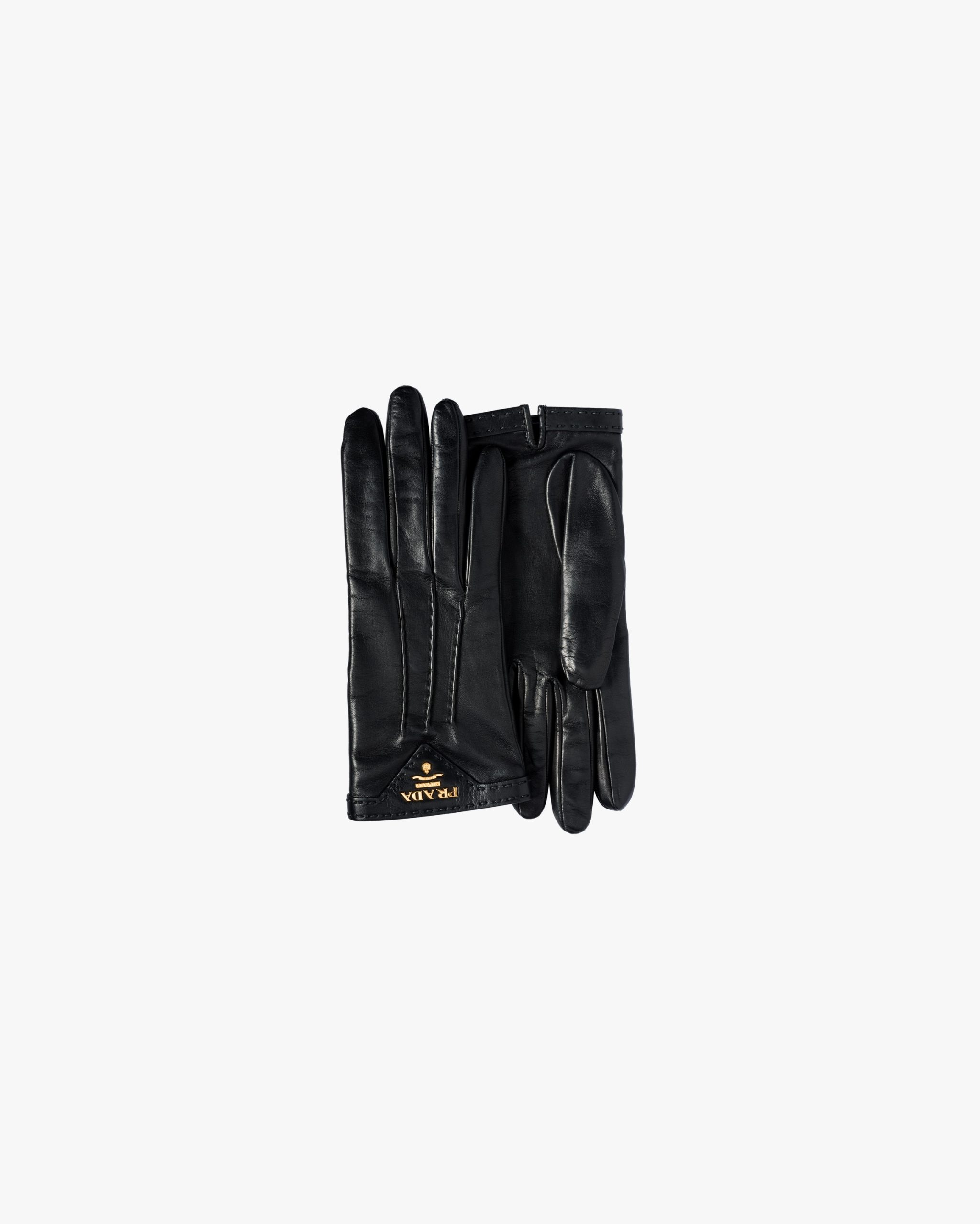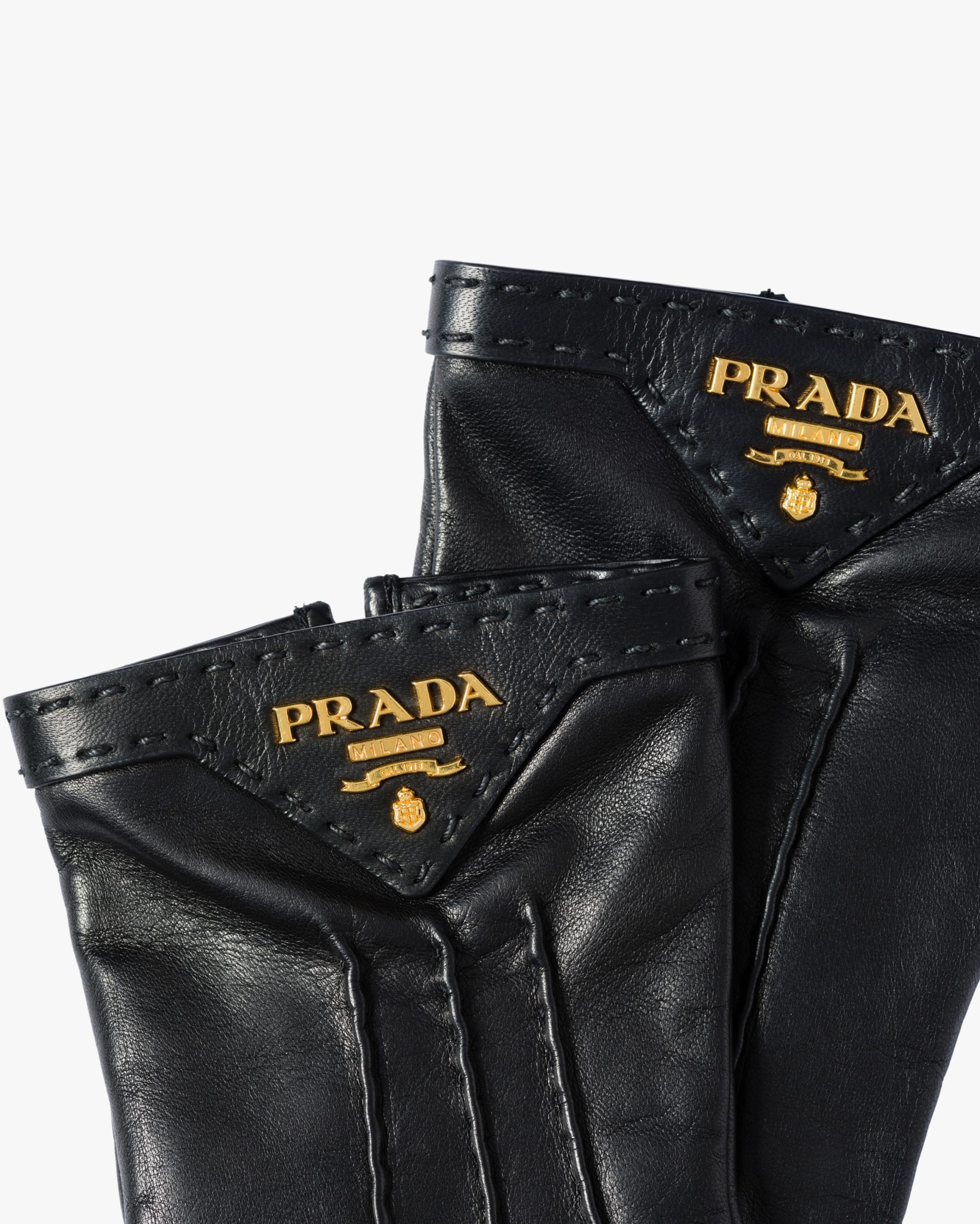Short Nappa leather gloves lined with cashmere. The outside features embroidered details and a prominent metal Prada logo.