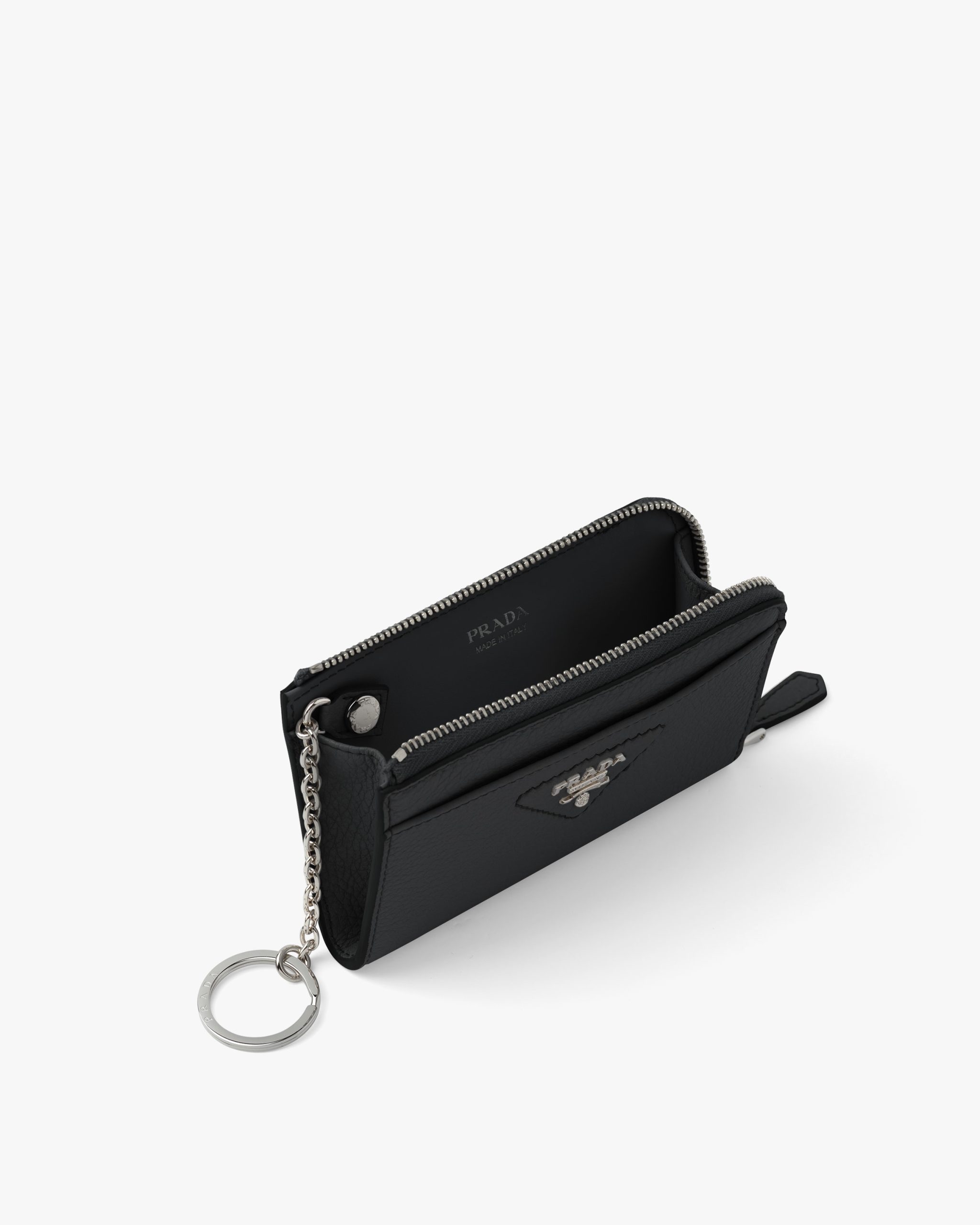 This elegant, compact key case is illuminated by its metal hardware. The pockets and card holders inside emphasize its functionality. The metal logo decorates the accessory.