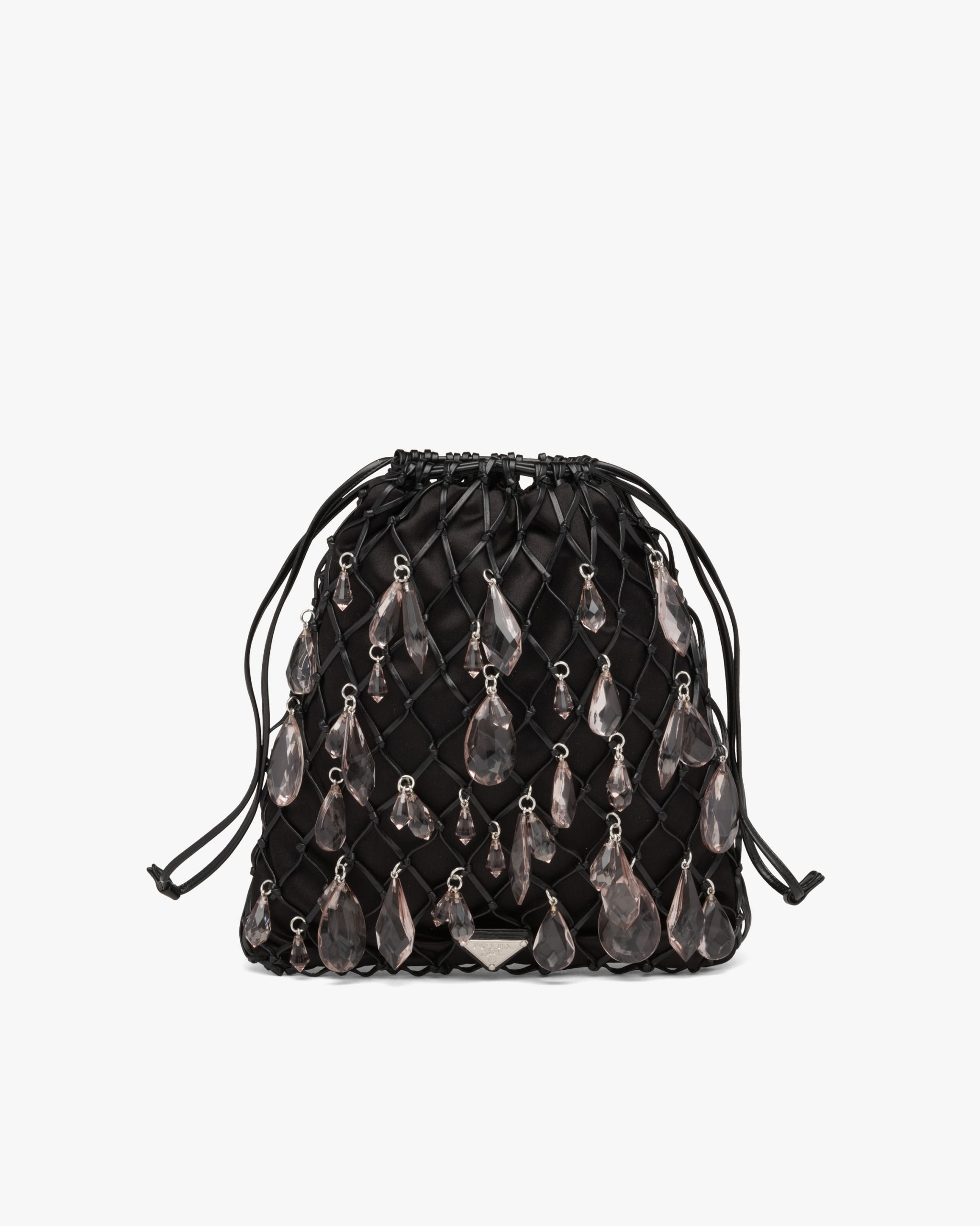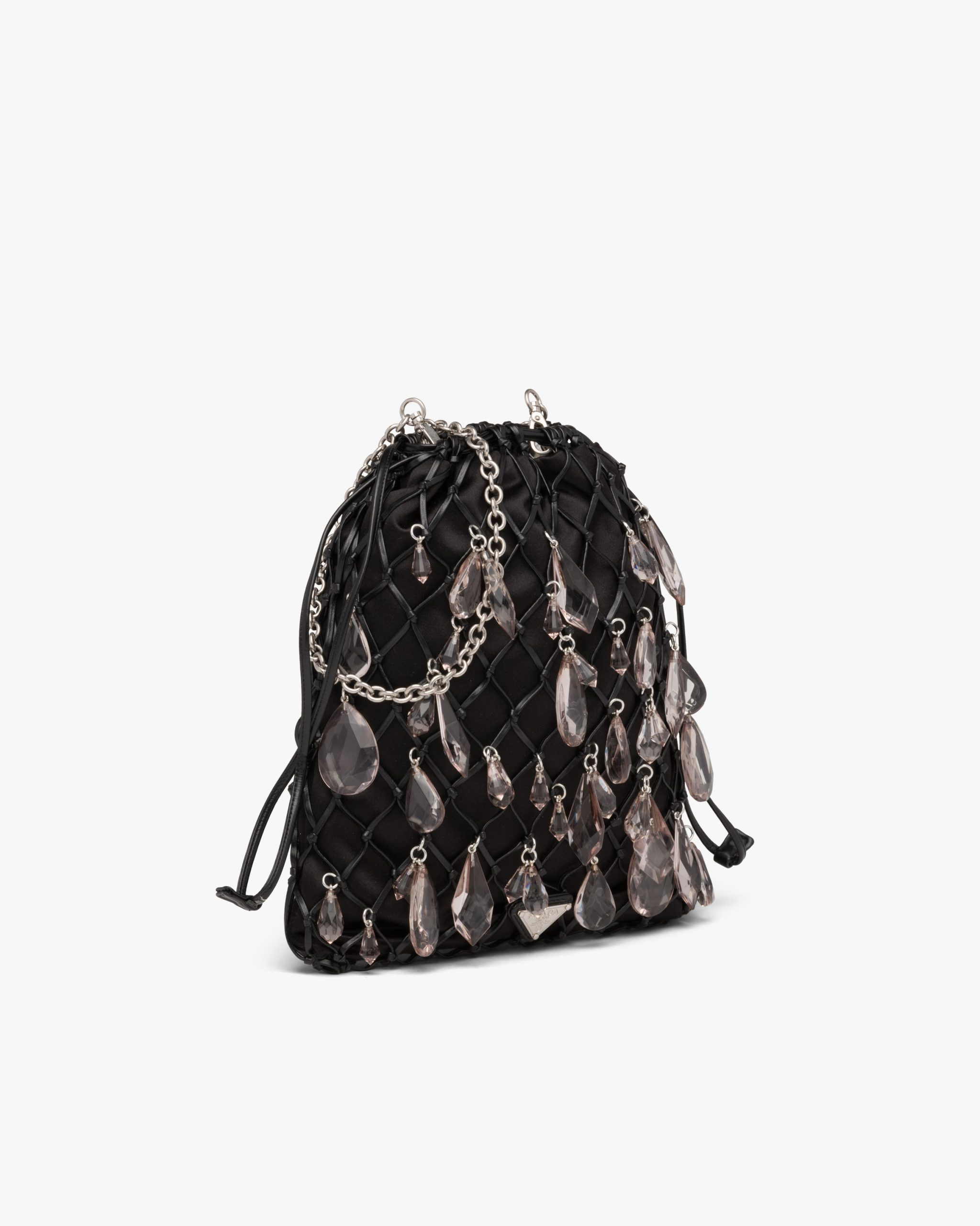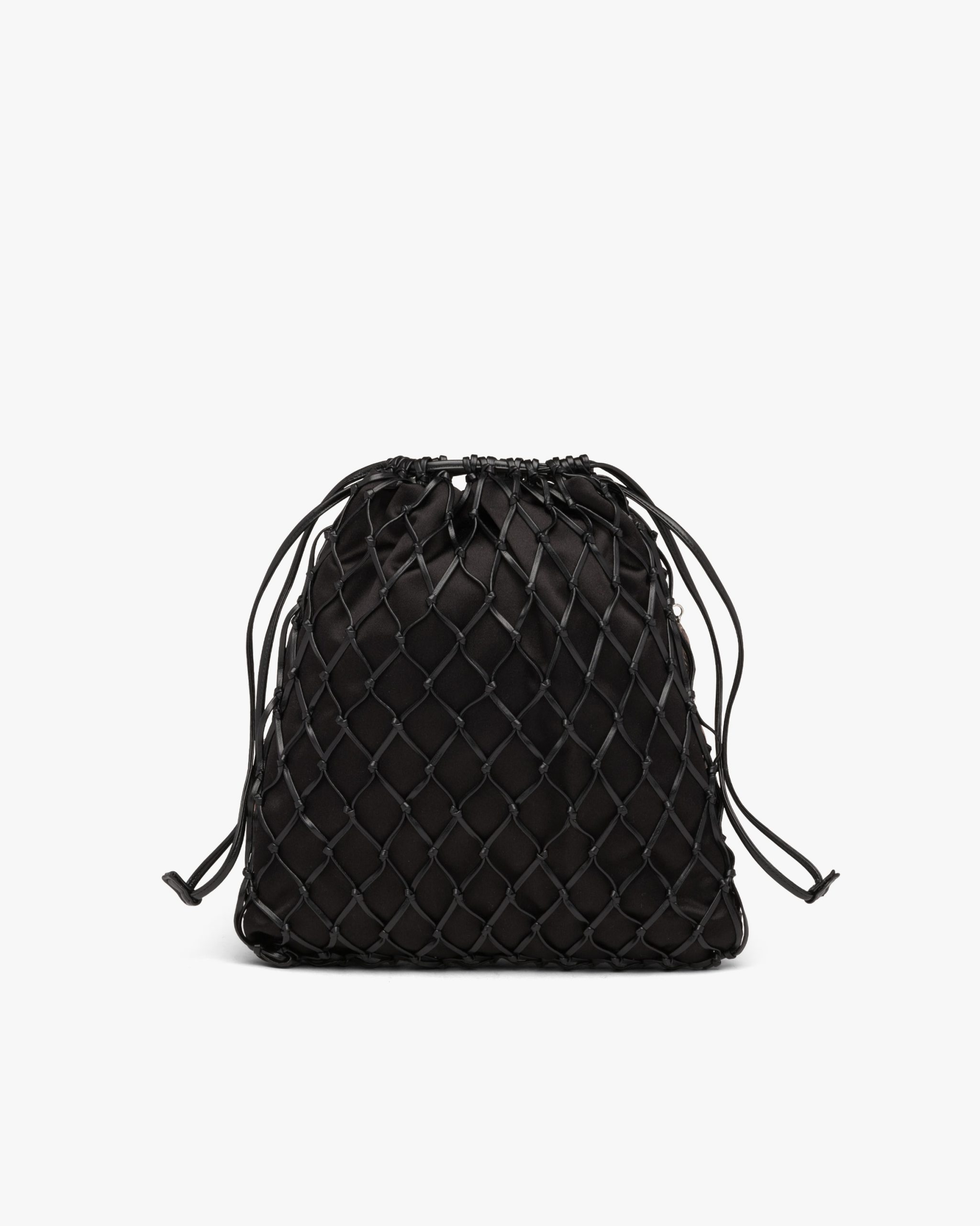 This satin clutch is enhanced by its leather mesh design and the triangle logo.