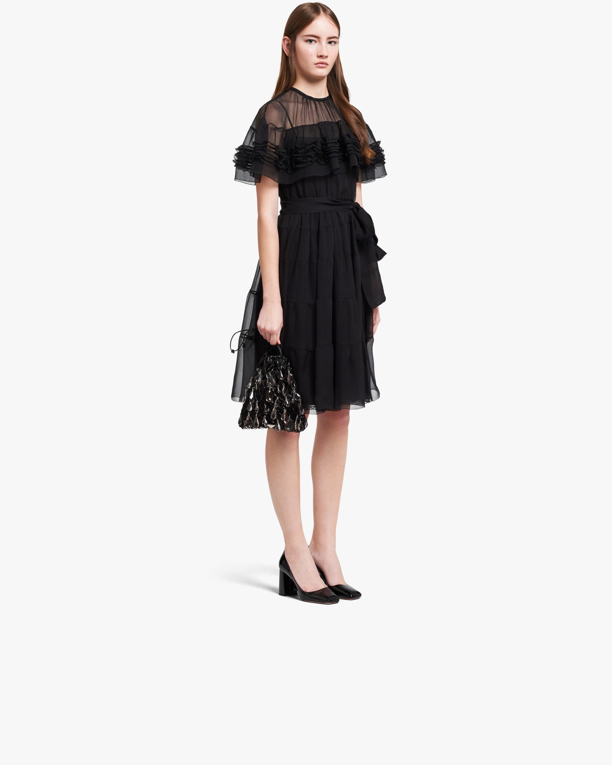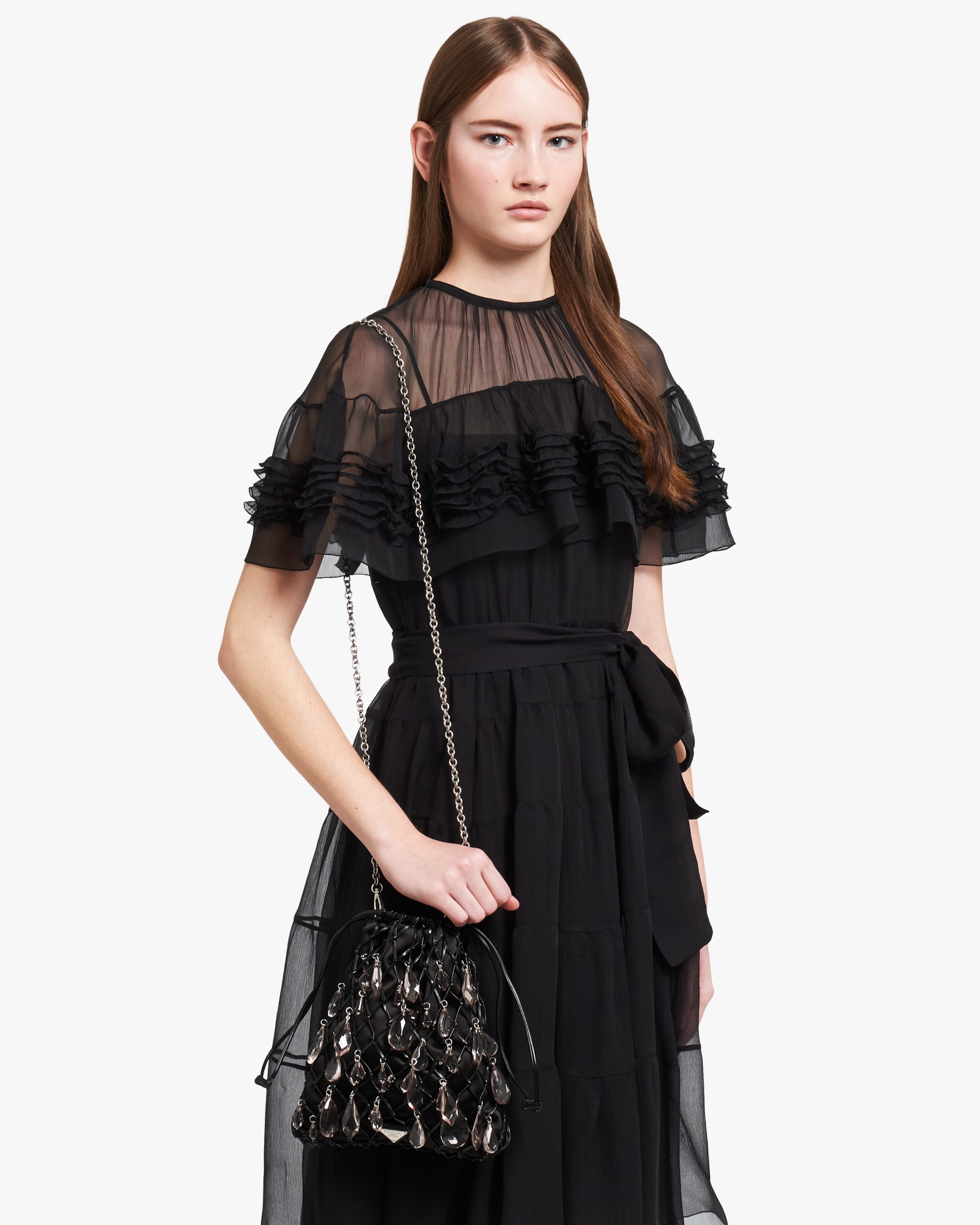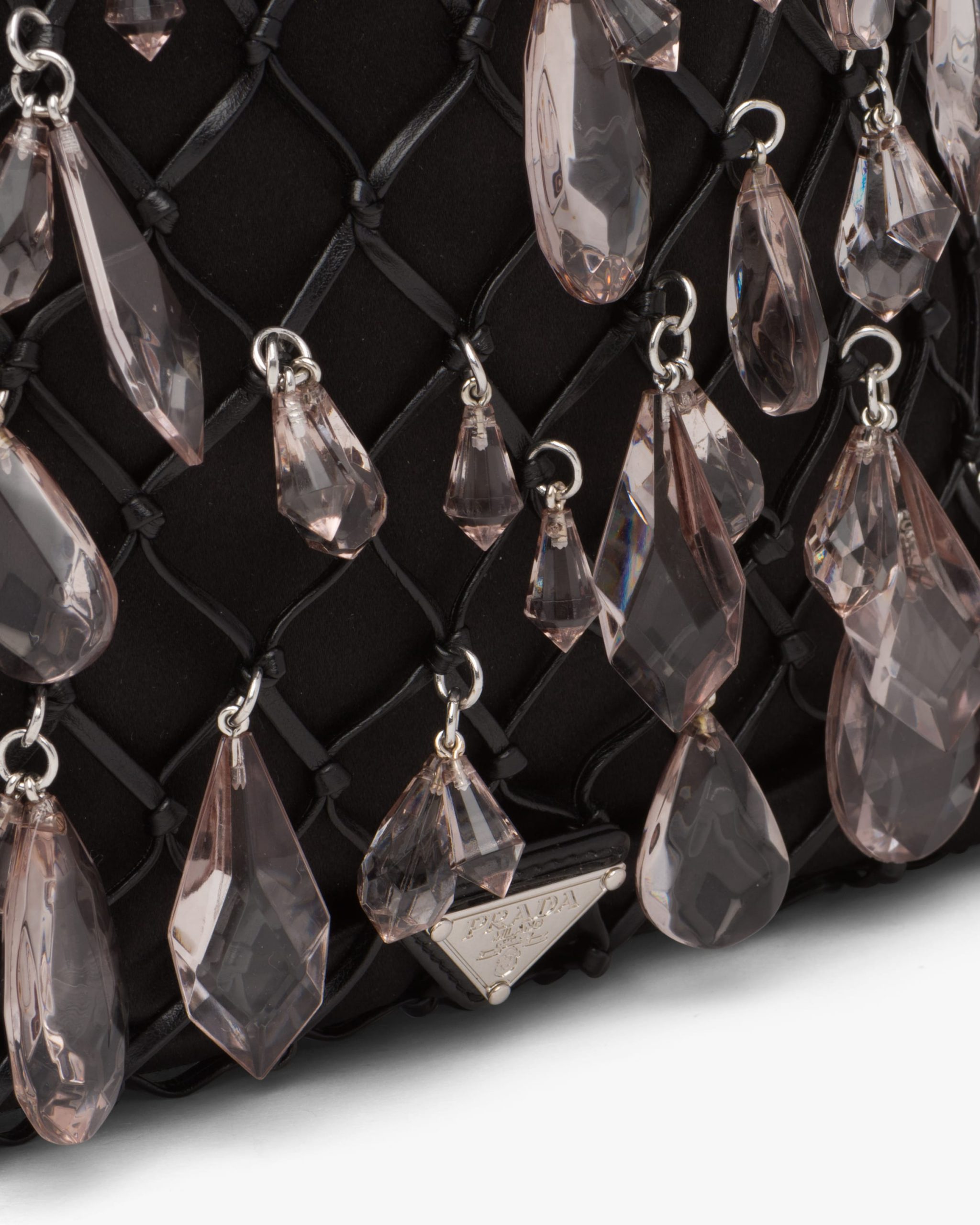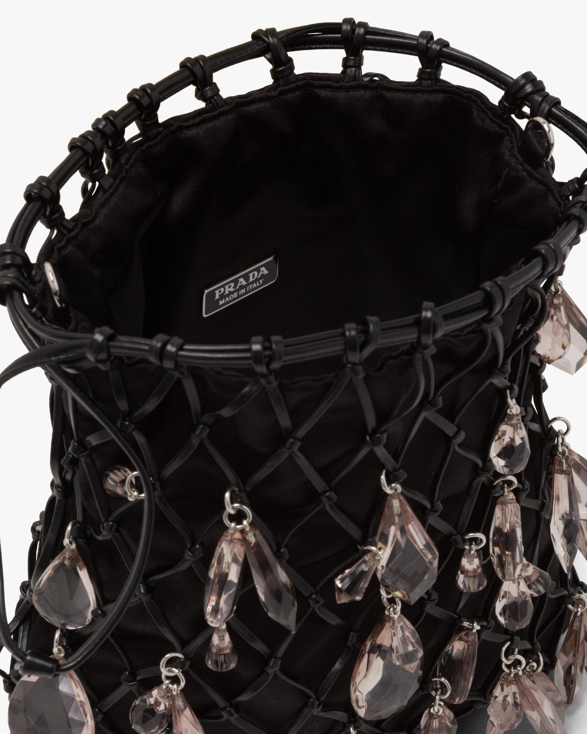 This satin clutch is enhanced by its leather mesh design and the triangle logo.