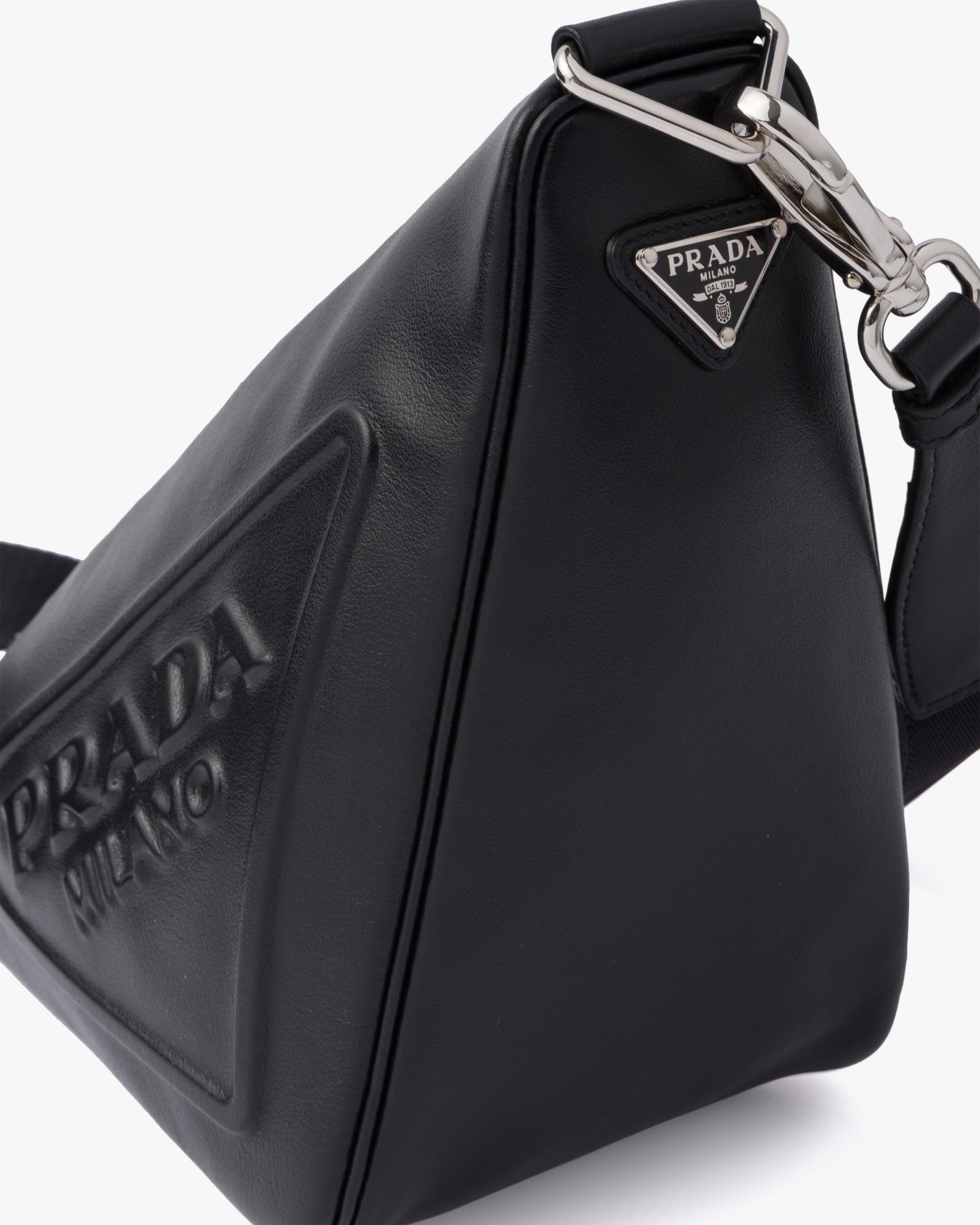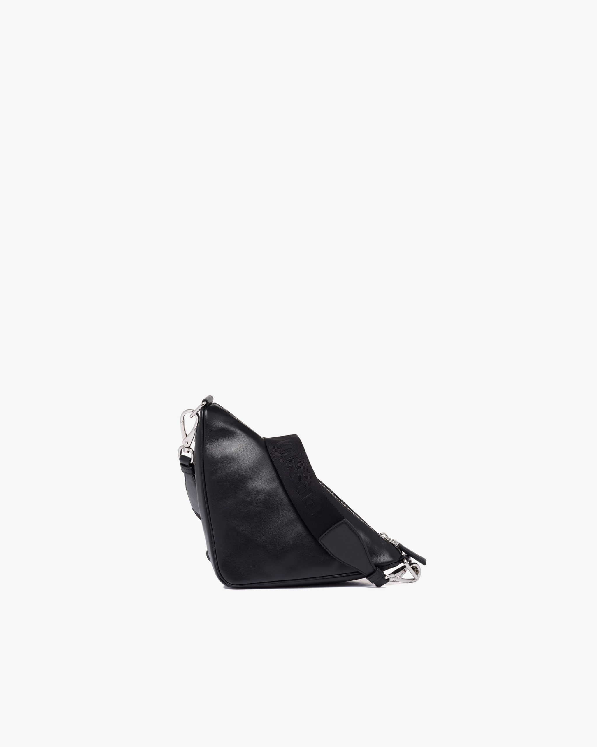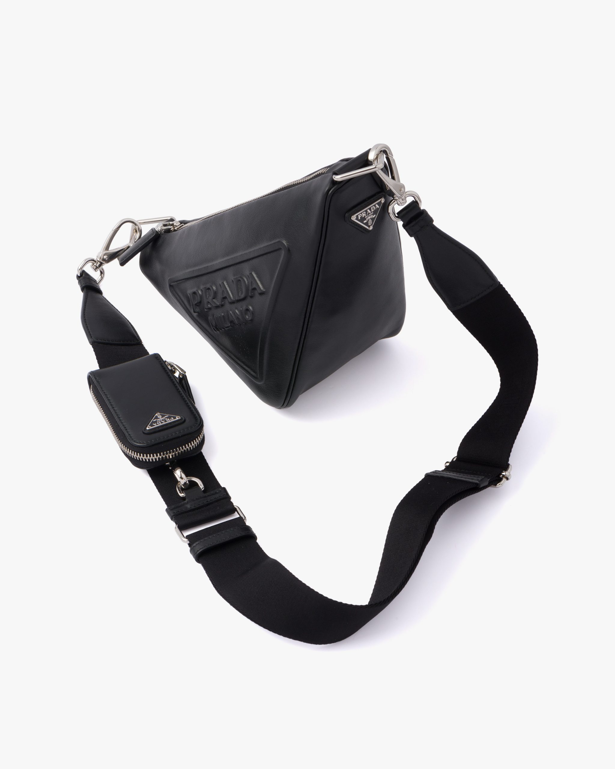 A study of the triangle inspires new geometric elements and novel interpretations of Prada’s historic stylistic code. The iconic shape is presented again in this shoulder bag with sleek lines that comes with a strap for versatility. The tonal embossed logo and the enameled metal triangle logo on the back enhance the minimalist aesthetics.