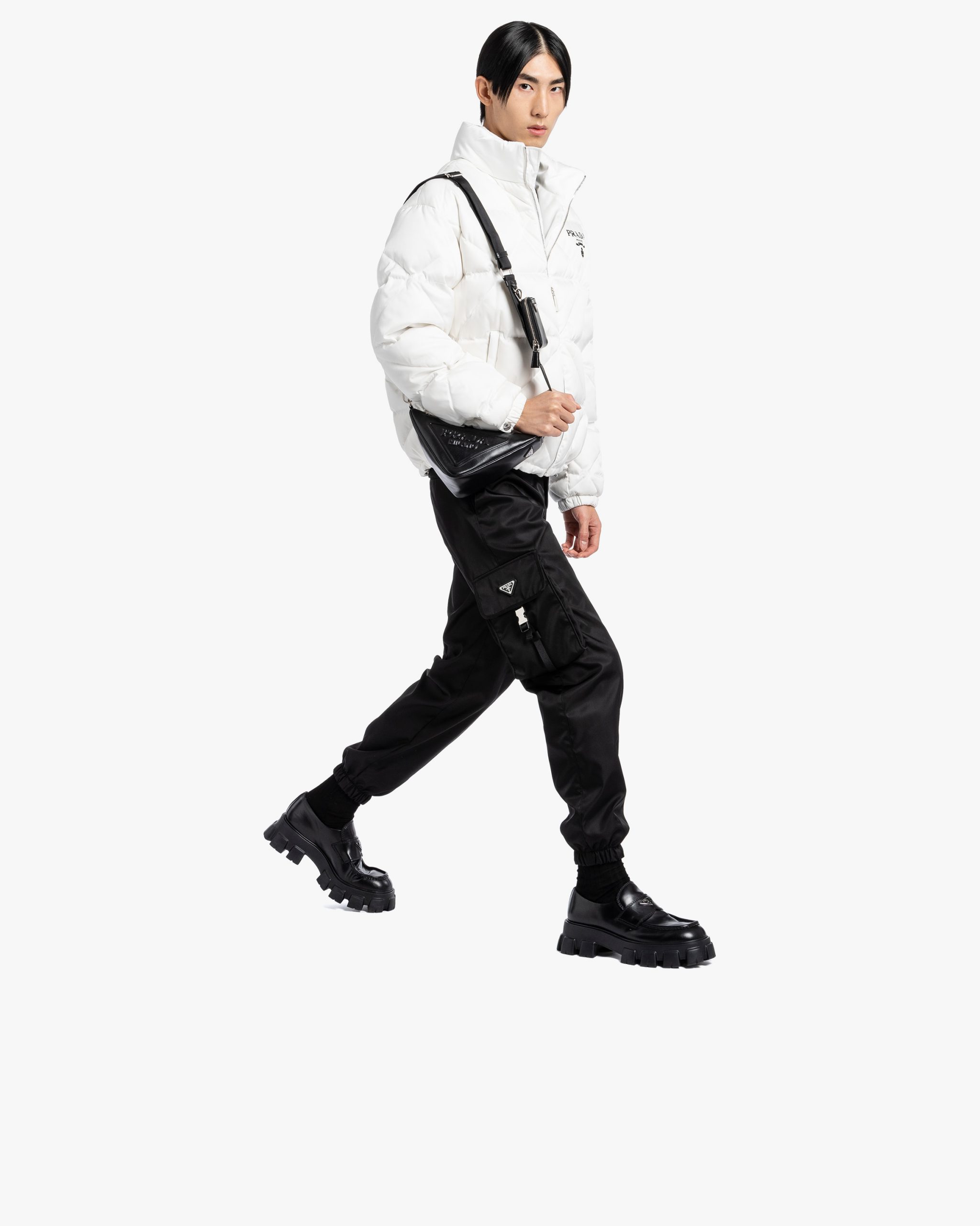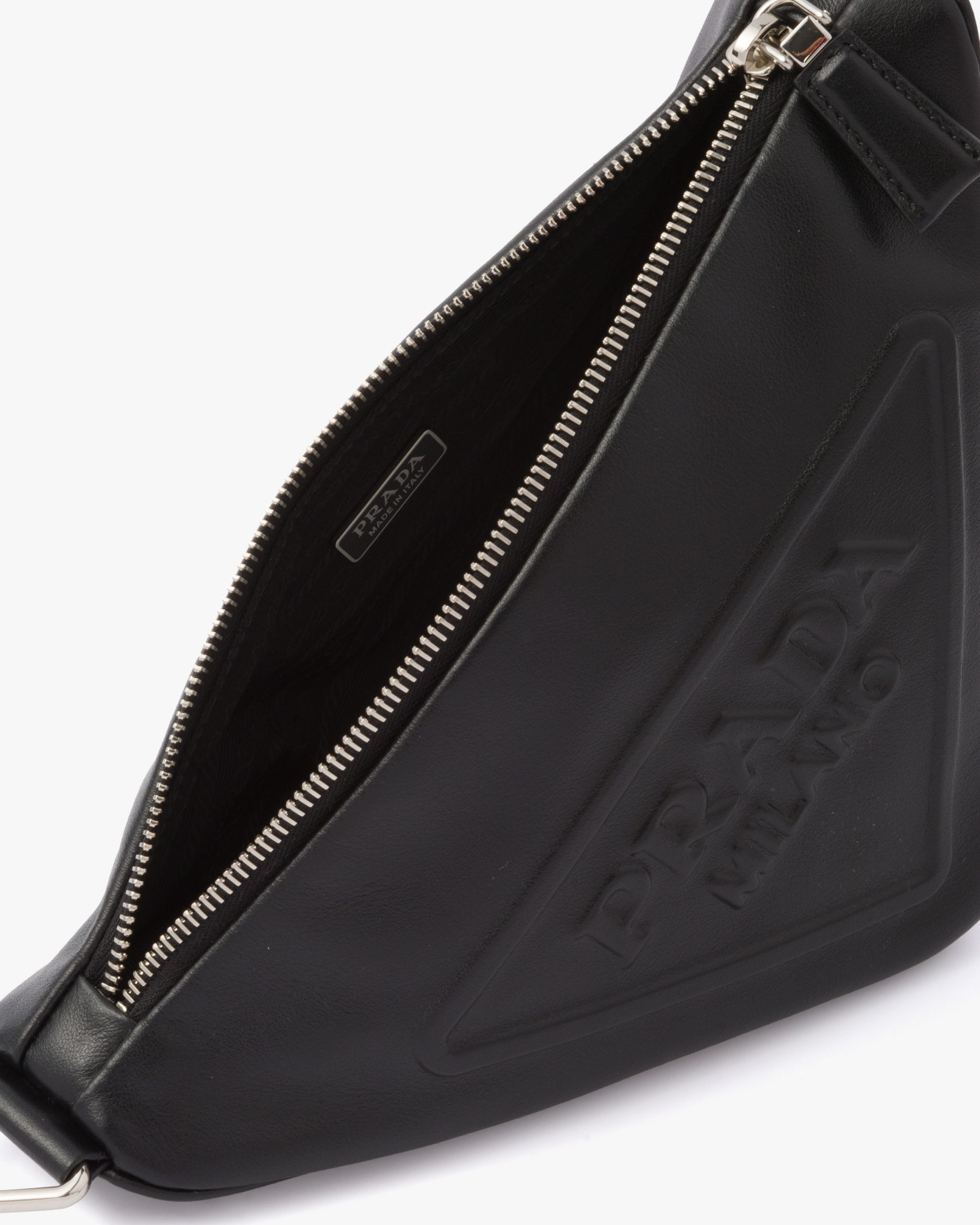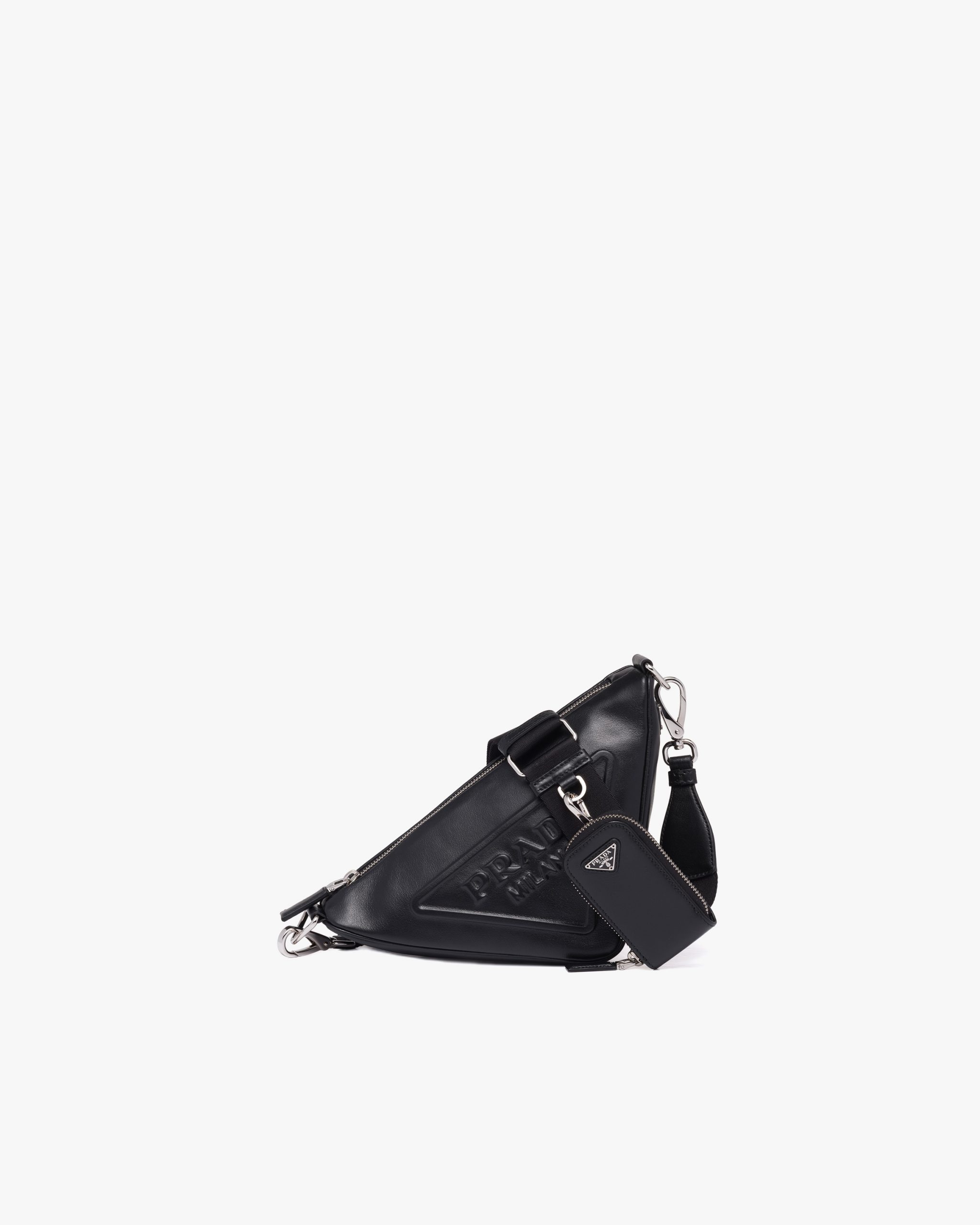 A study of the triangle inspires new geometric elements and novel interpretations of Prada’s historic stylistic code. The iconic shape is presented again in this shoulder bag with sleek lines that comes with a strap for versatility. The tonal embossed logo and the enameled metal triangle logo on the back enhance the minimalist aesthetics.
