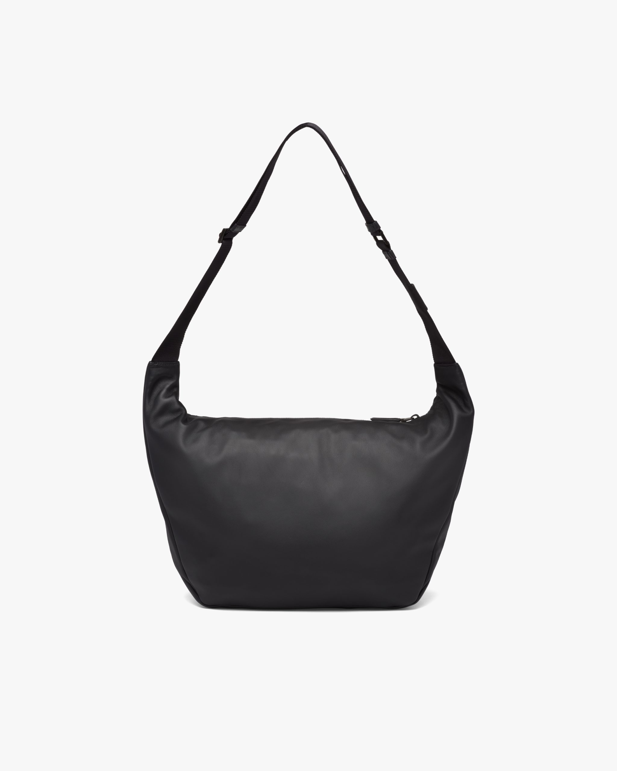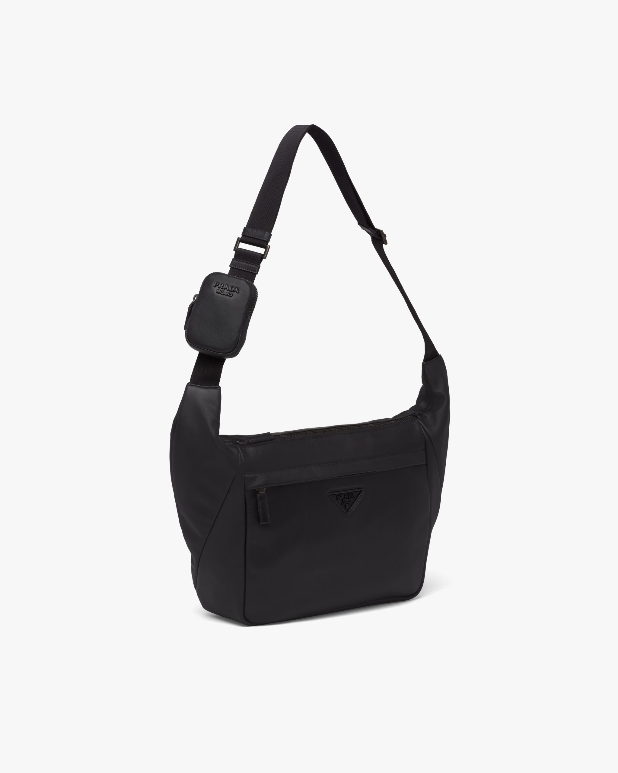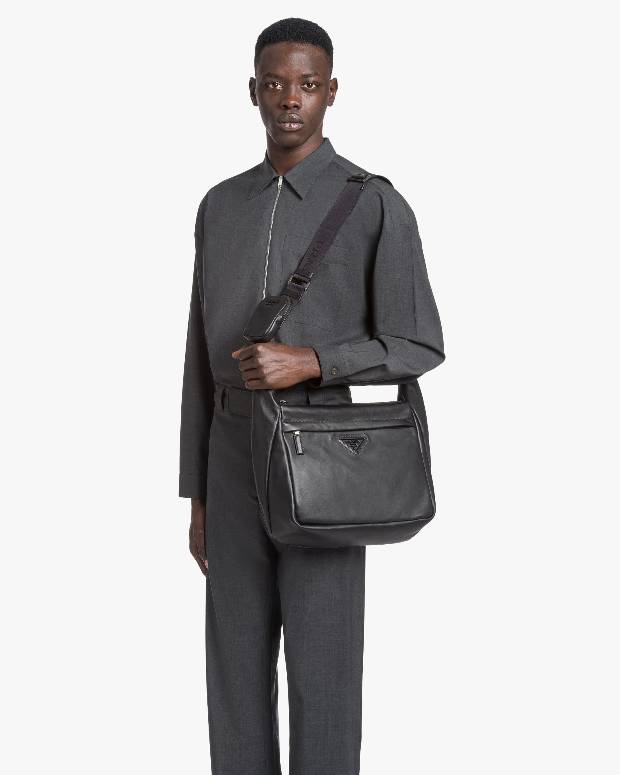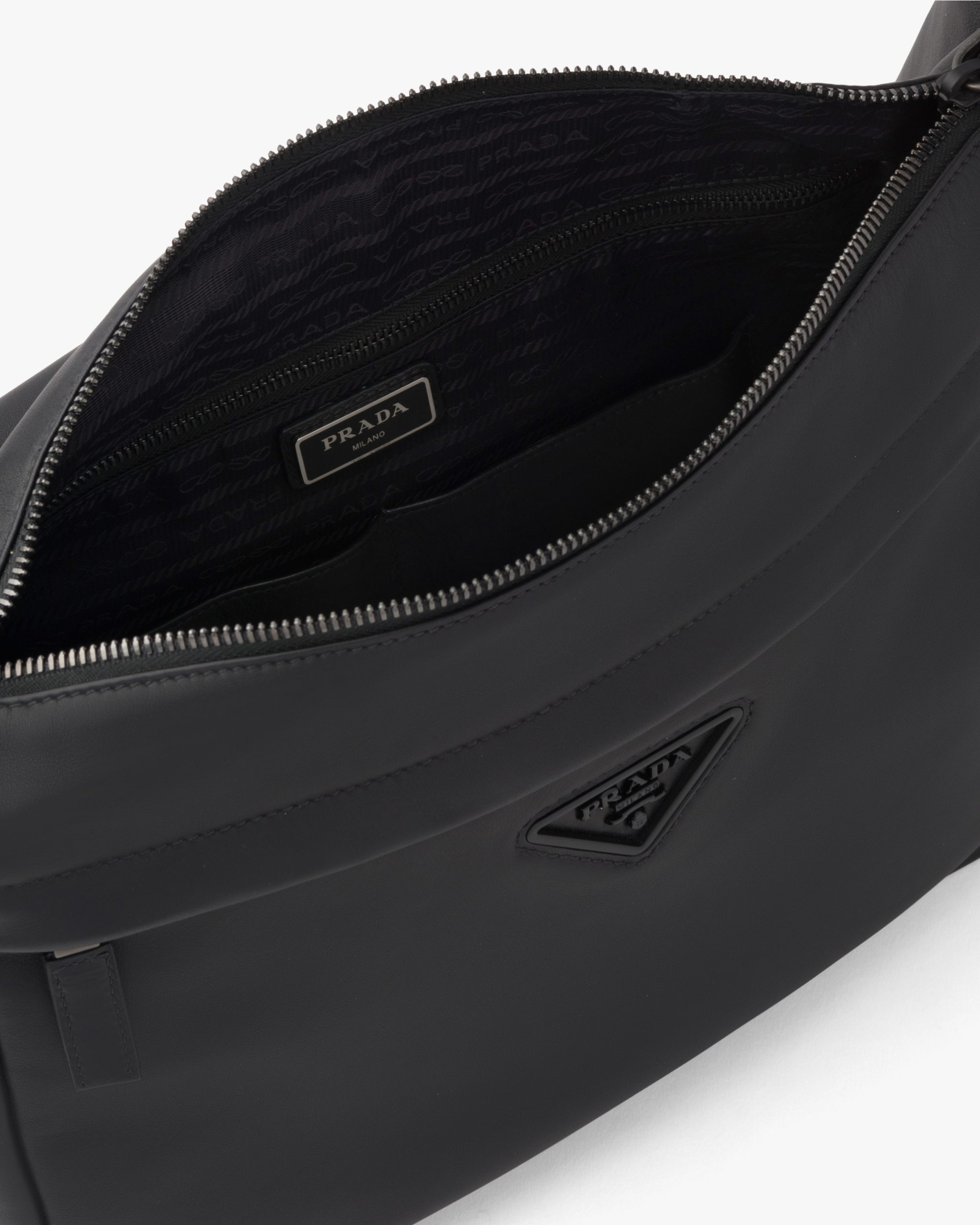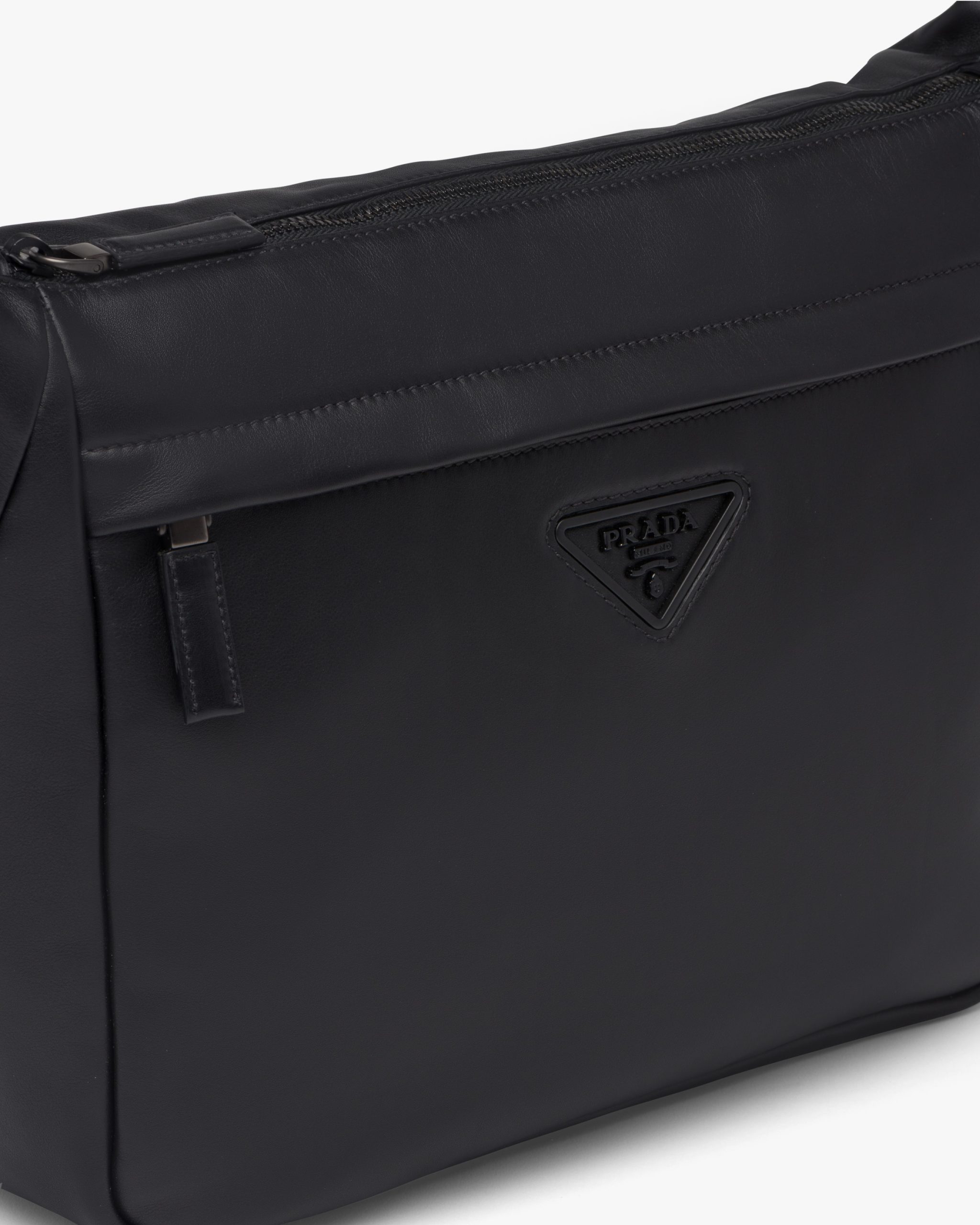 This soft leather shoulder bag with an elaborate design, an expression of the brand’s know-how, reflects contemporary charm. Made of soft leather, it is decorated with the lettering logo framed by the iconic Prada triangle, here in an elegant reinterpretation in varnished metal. The adjustable woven nylon tape strap comes with a detachable pouch, a recurring accessory in the brand’s collectsions that adds a versatile touch to the design.