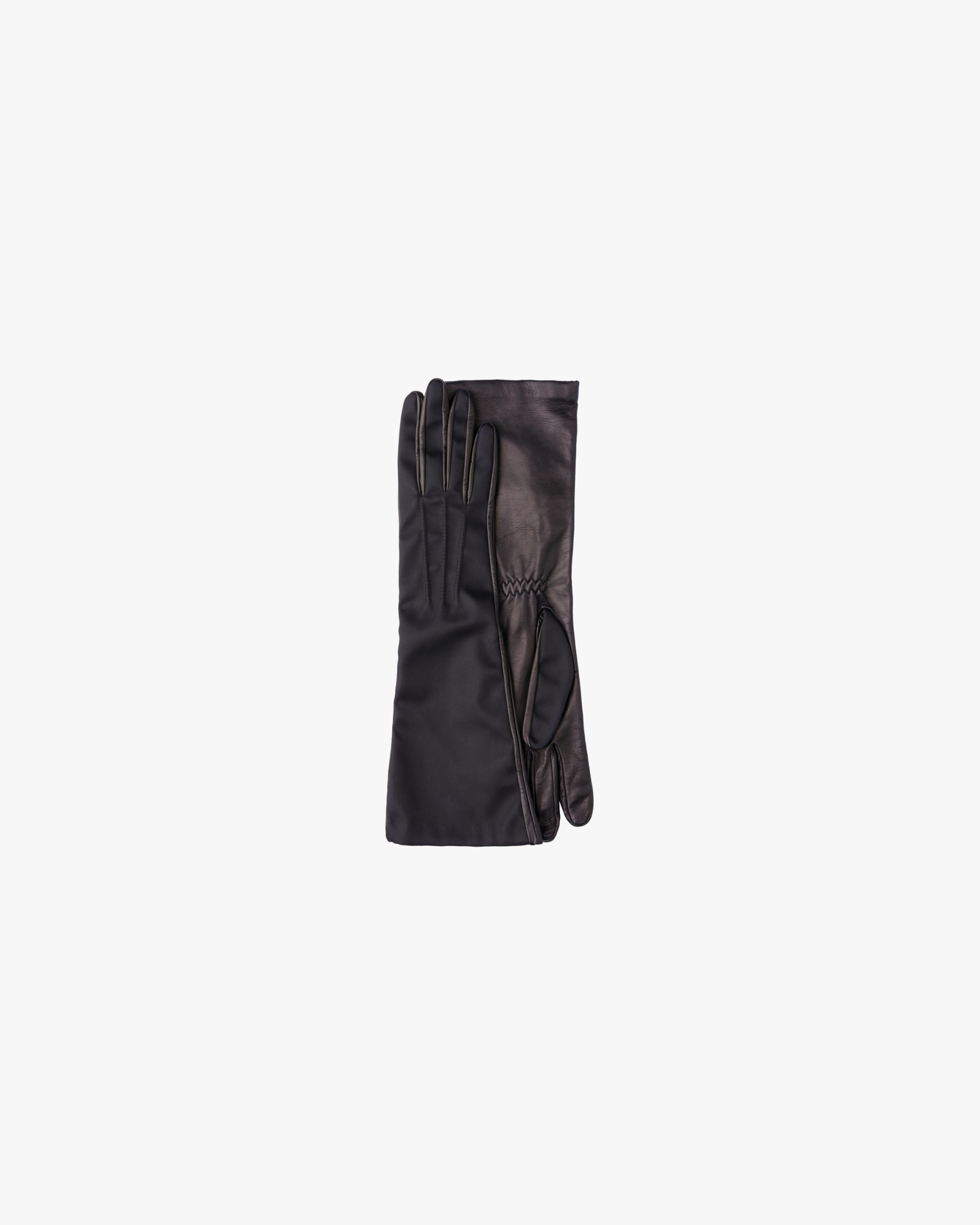 Long gloves are given a contemporary twist through the use of nylon and leather. They are lined in silk.