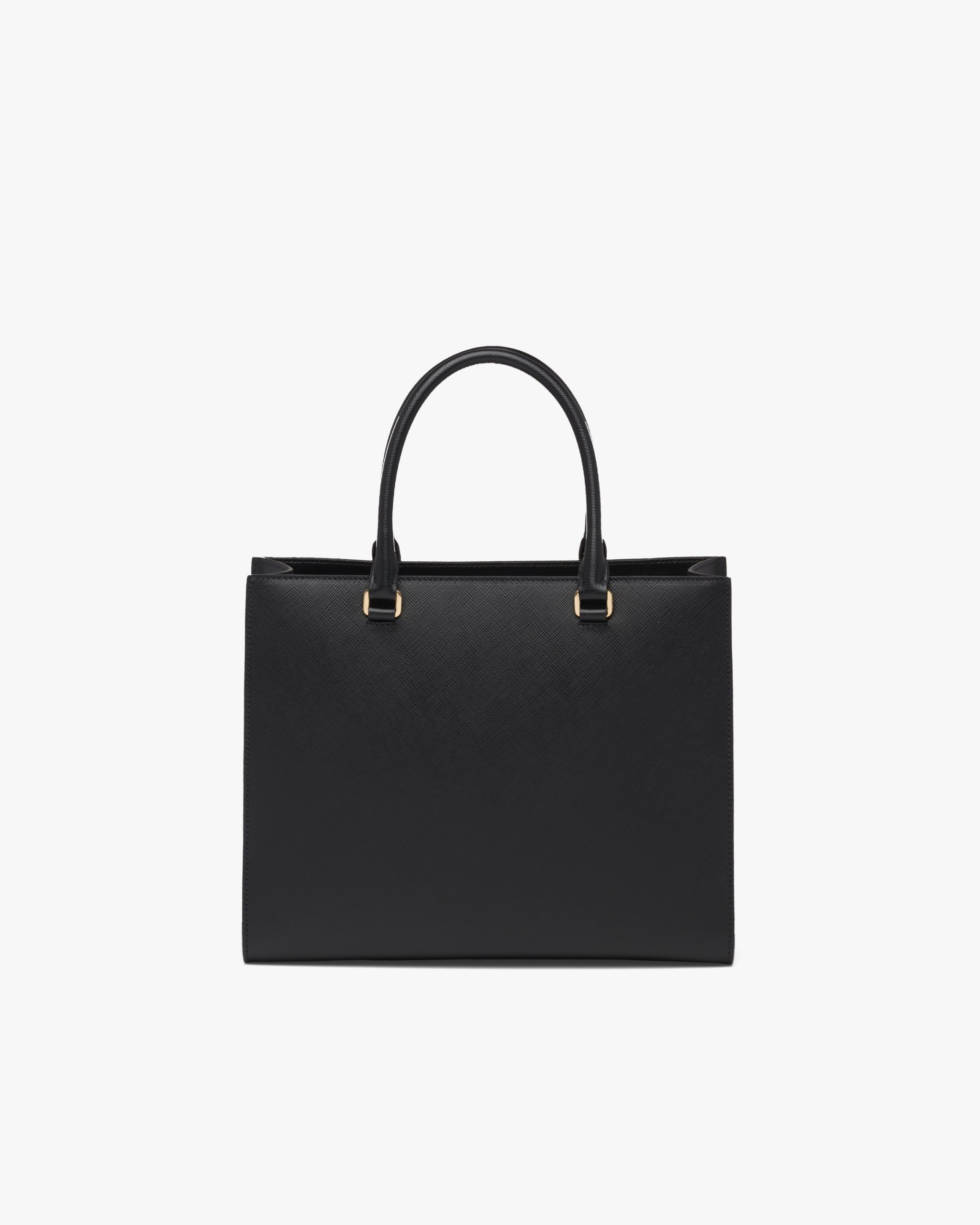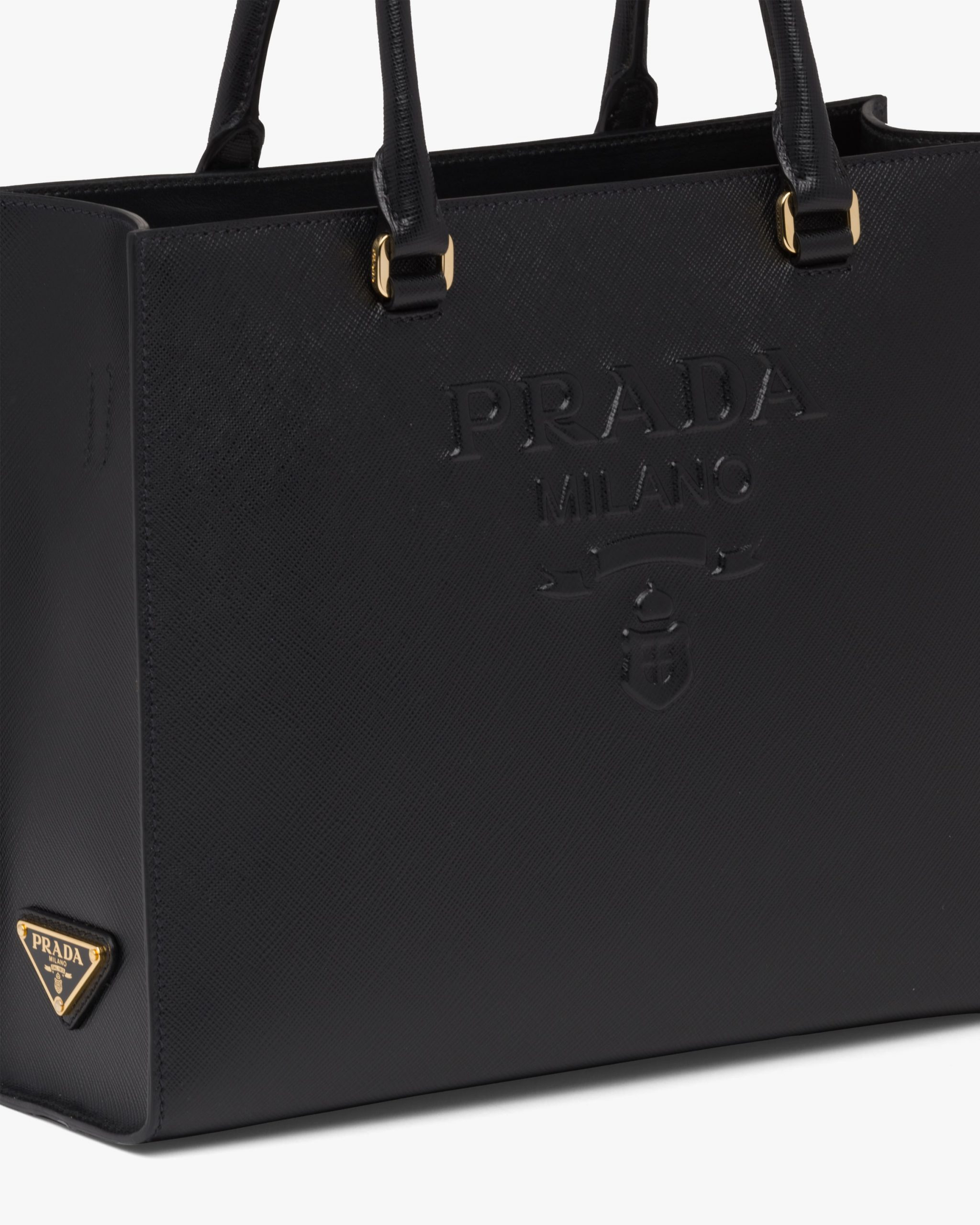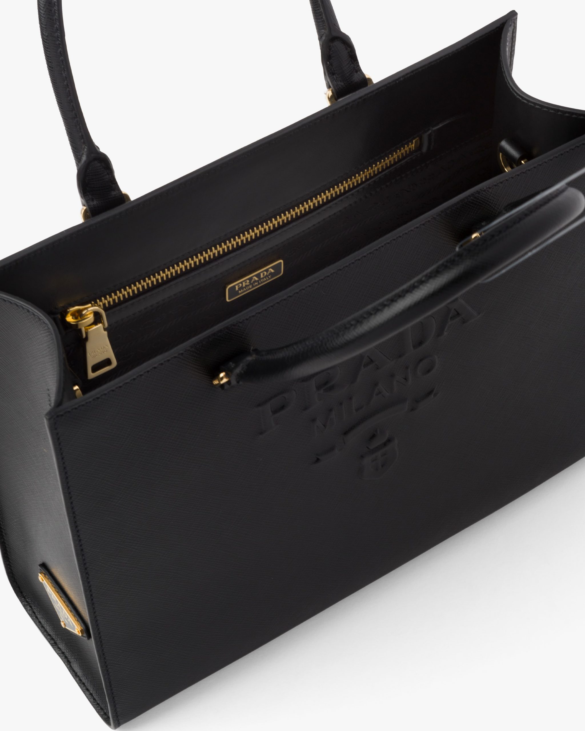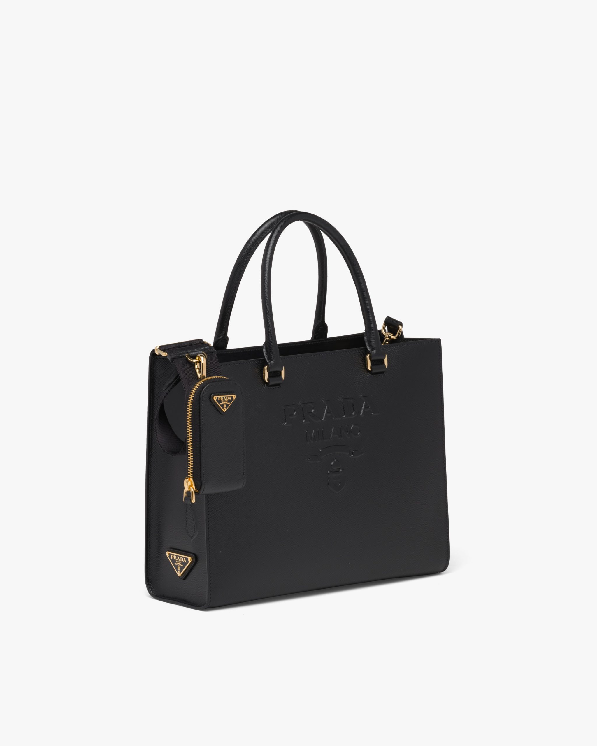 Saffiano leather, Prada’s iconic material, is synonymous with luxury and identifies with traditional Italian leather-making. This high-quality leather with its characteristic crosshatch texture and waxed finish defines this handbag with a sleek, elegant design, double handle, and detachable shoulder strap that allows it to be worn in different ways. Decorated with the embossed lettering logo, the design has a detachable pouch for a contemporary accent.