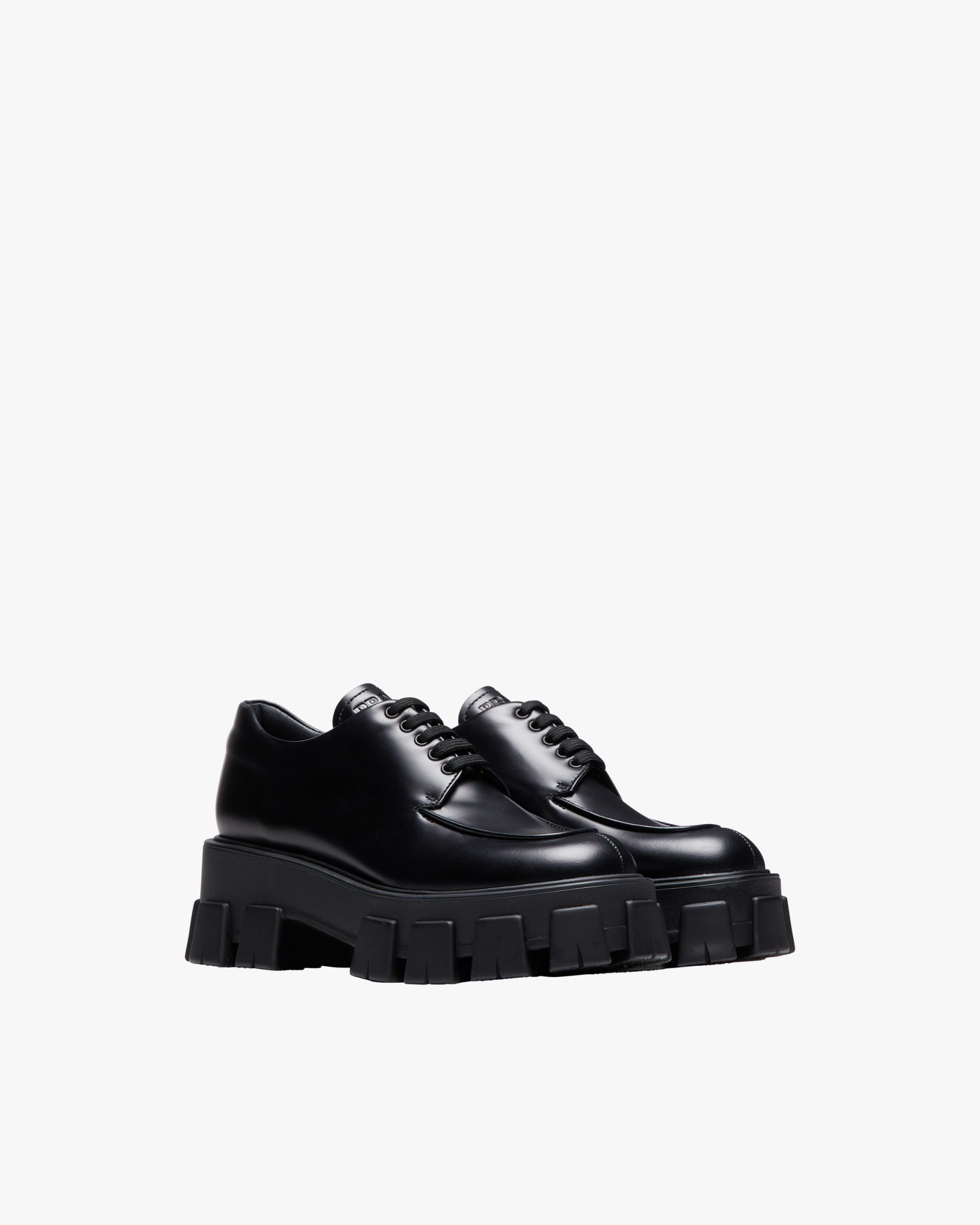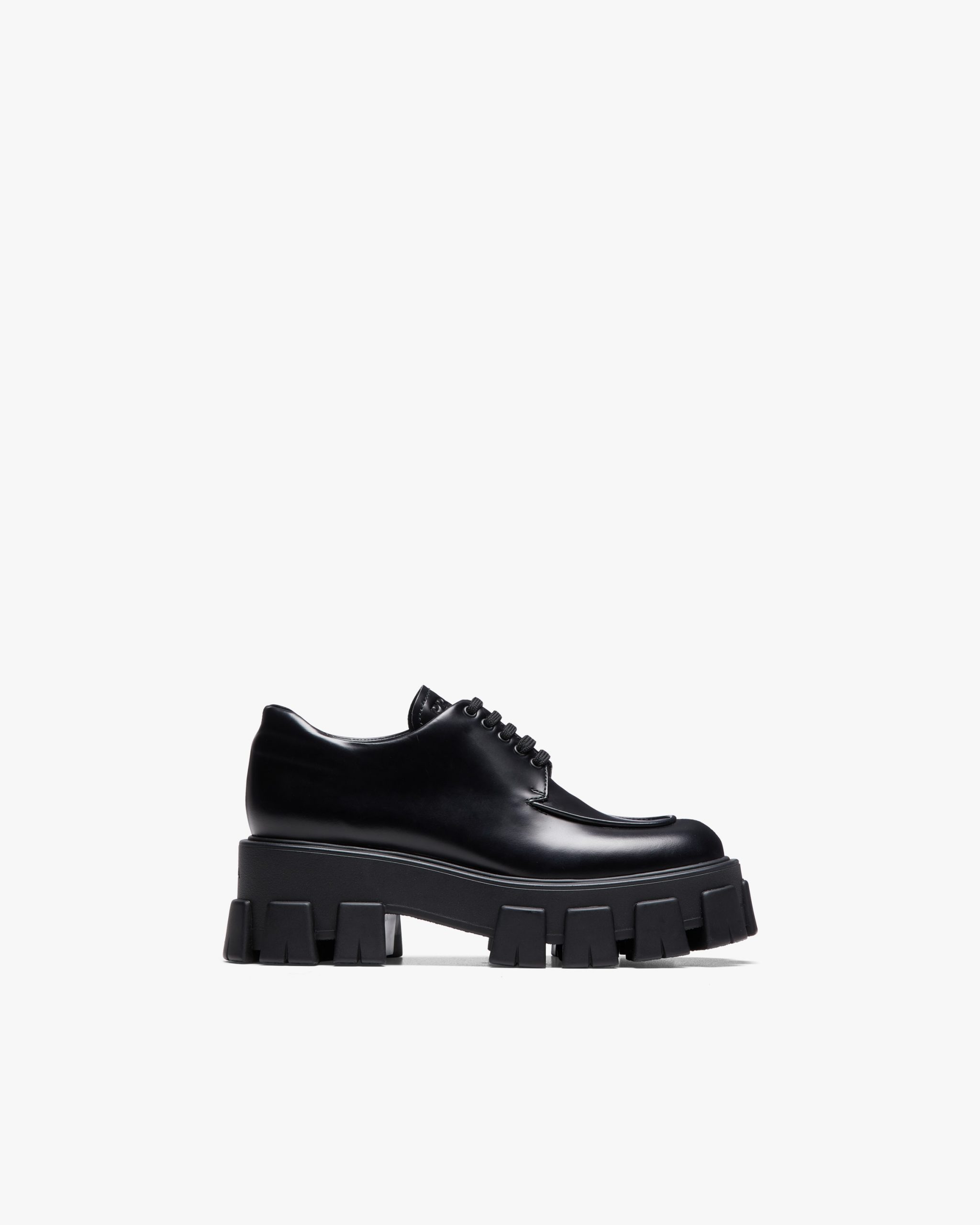 These Monolith lace-ups are made of elegant brushed leather, an iconic material of Prada. Named after its maxi rubber sole, this shoe is an expression of a timeless design, monolithic and unique for its research, innovation and style. The upper, inspired by formal footwear for men, creates a dialog with the lines of the sole inspired by the uniform, combining concepts like protection and modernism with the brand’s emblematic elegance.