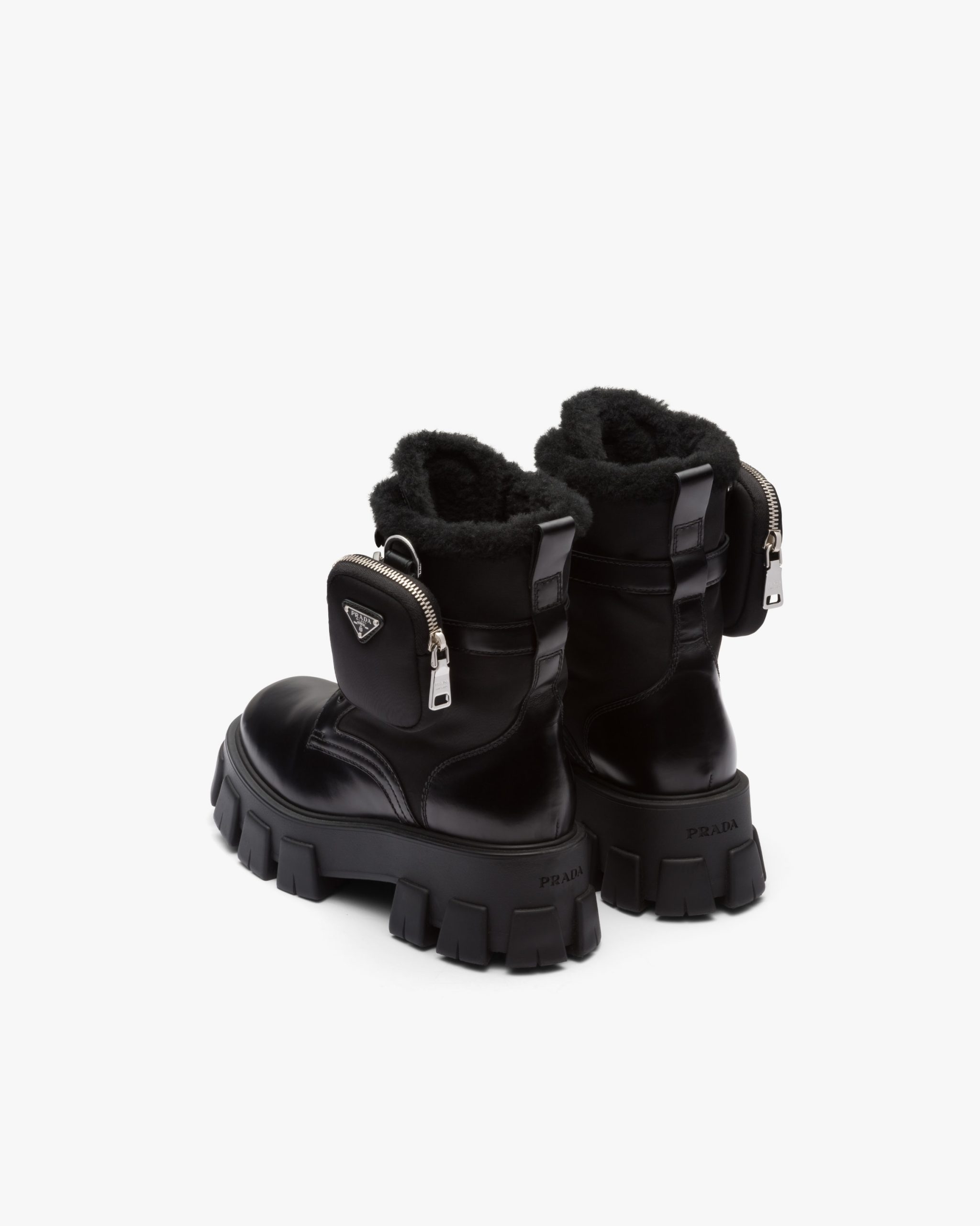 The emblematic imagery linked to the uniform that distinguishes Prada collectsions inspires the design of the Monolith line through diametrically opposed concepts that come together in a harmonious dialogue. The maxi rubber sole with a unique, timeless, and monolithic aesthetic enhances the style of the upper on these boots that reinterpret biker boots in a formal way through versatile pouches inspired by multi-pocket uniforms.