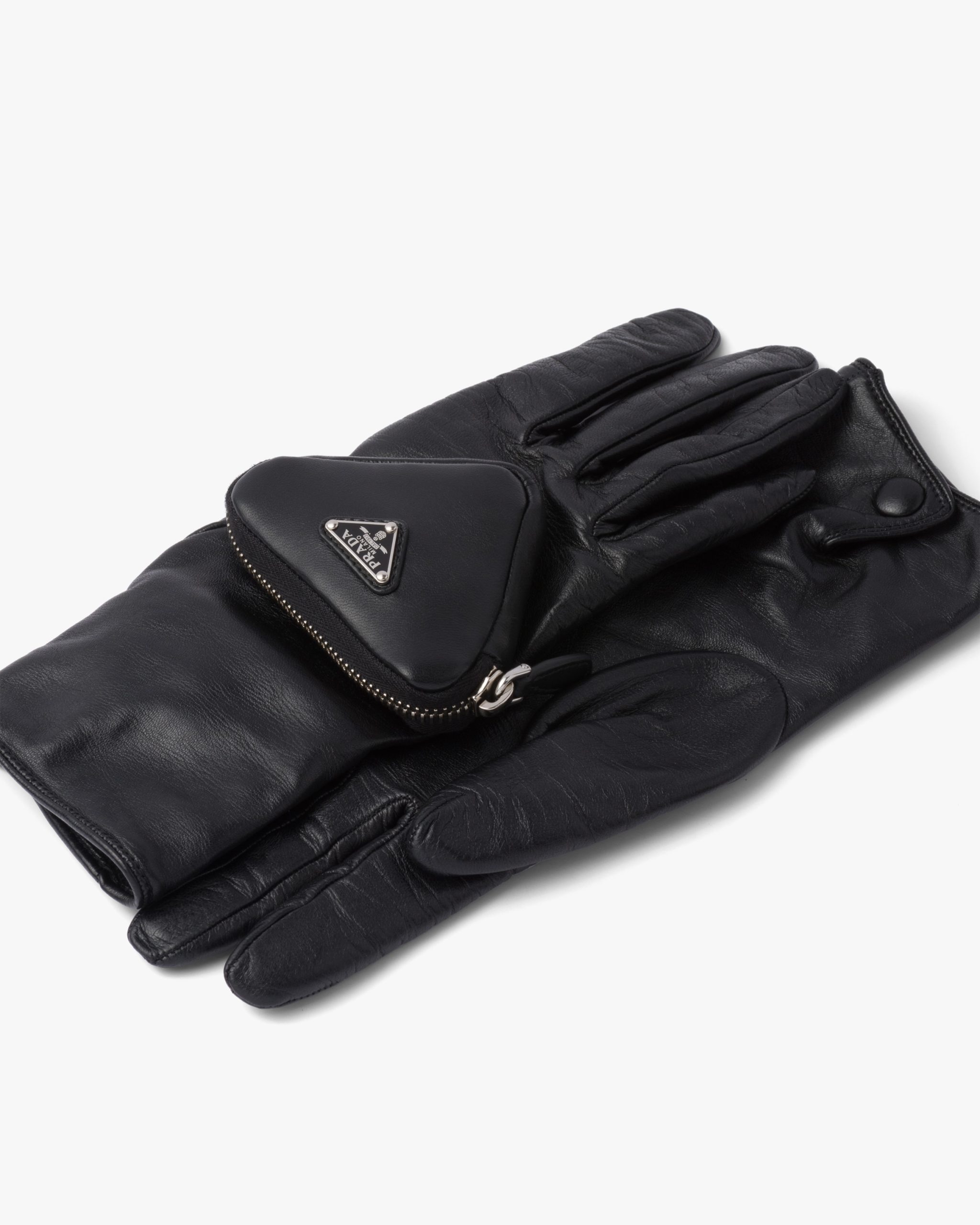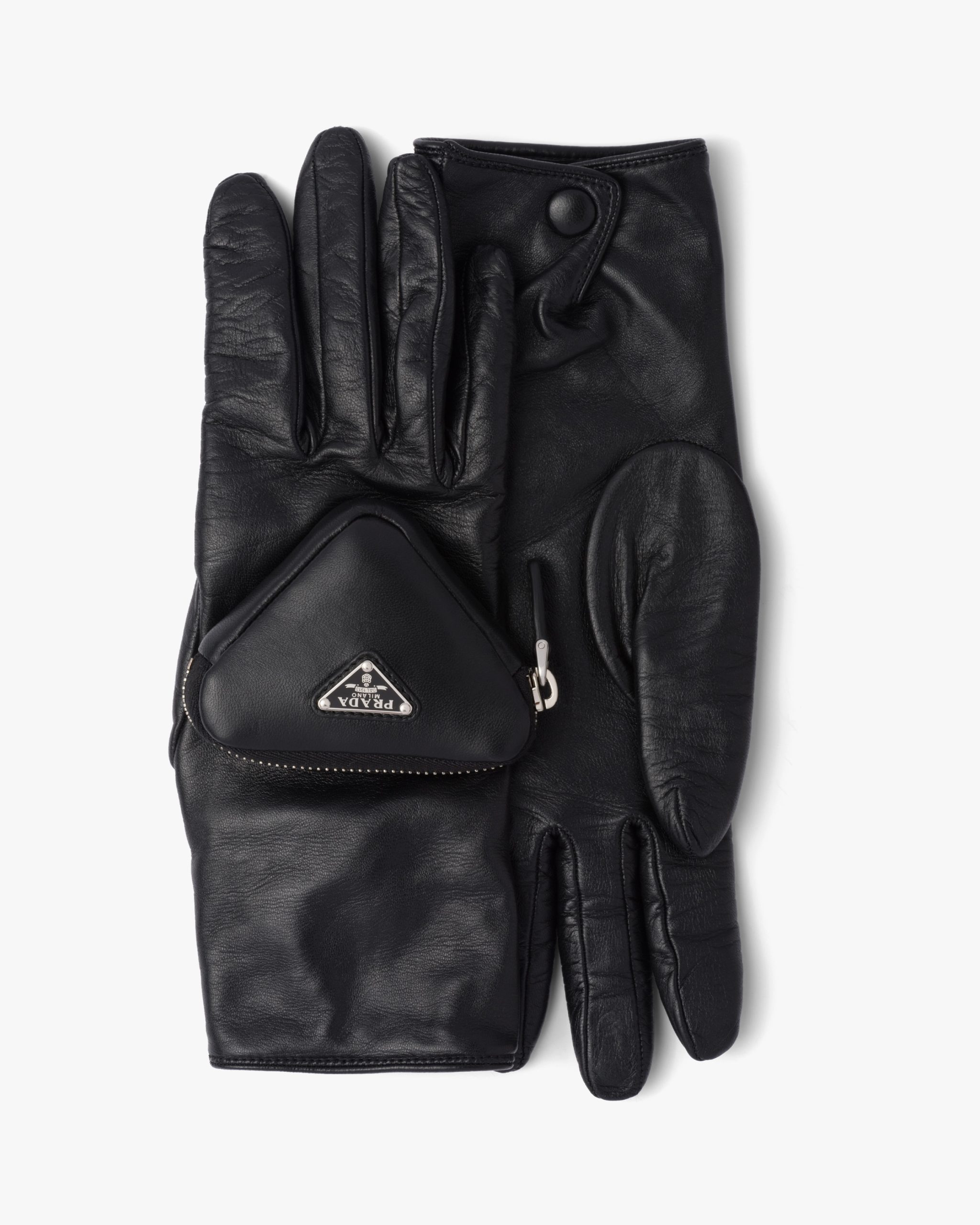 These gloves made of shiny nappa leather with a slightly irregular surface reminiscent of the leather used in the seventies come in a series of vibrant colors and more classic dark shades. The design is made modern by the small zipper pouch with enameled metal logo on one of the two gloves, an element that plays with the iconic triangle shape.