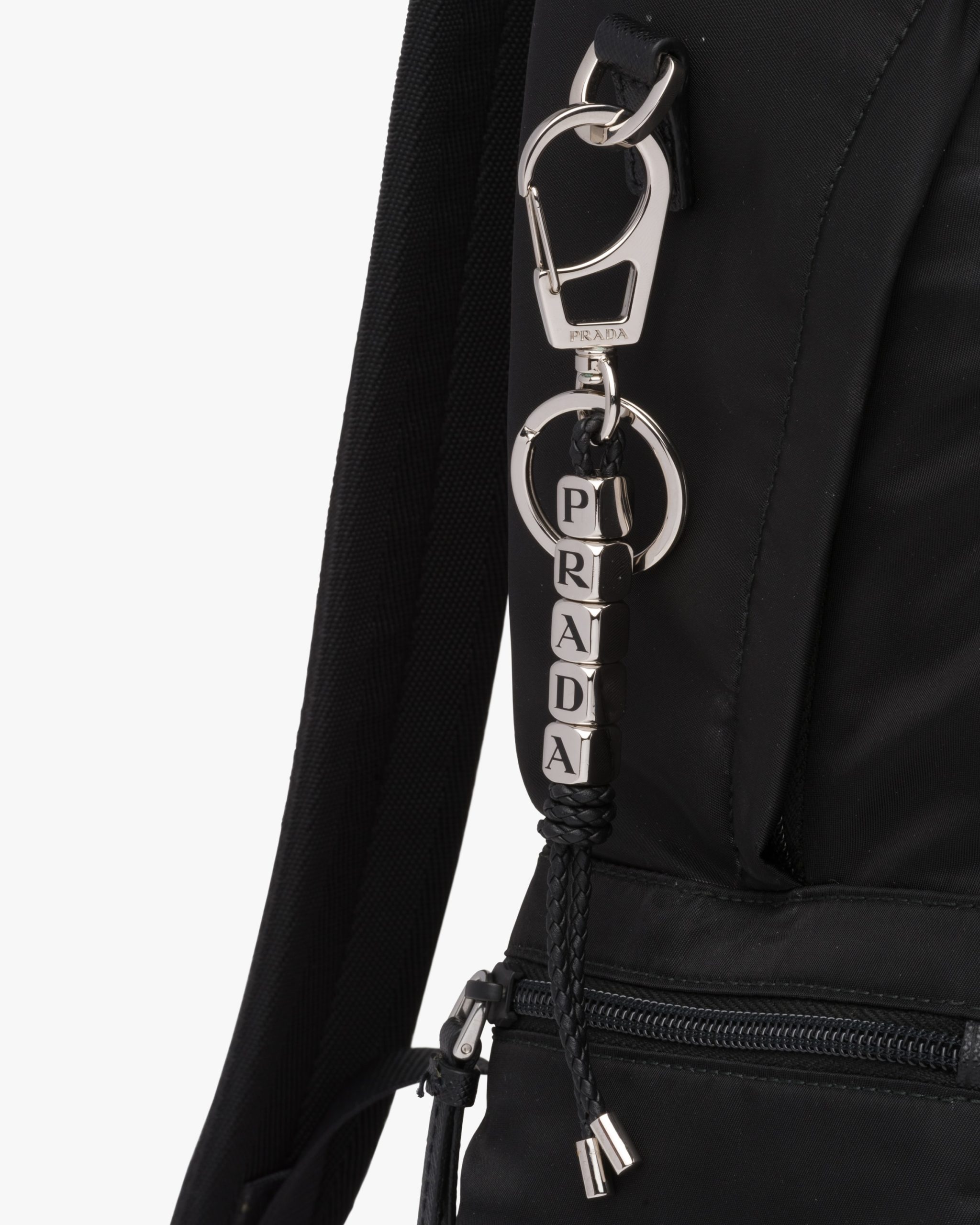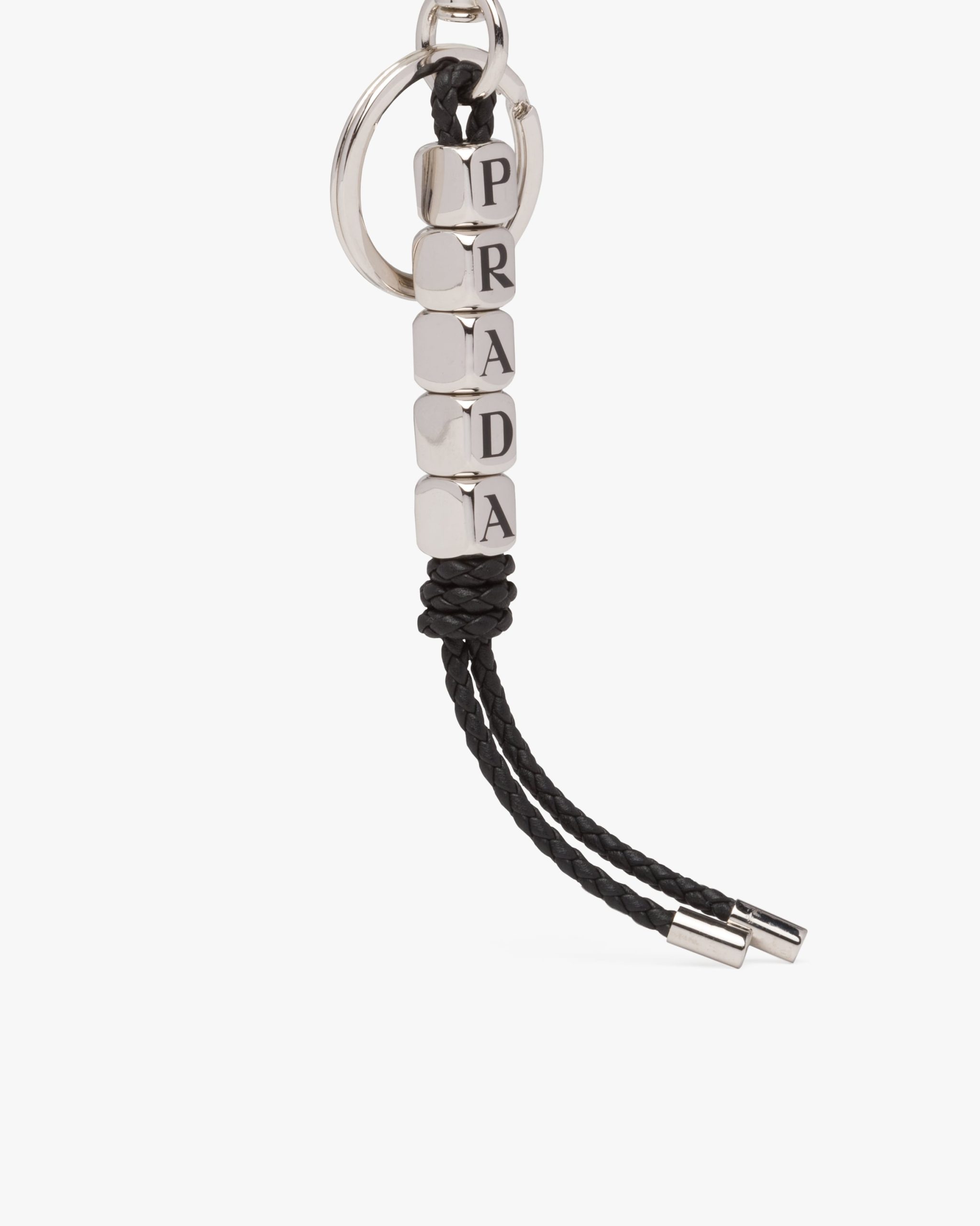The letters that make up the name of Prada decorate the metal beads of this keychain complete with soft braided nappa leather.