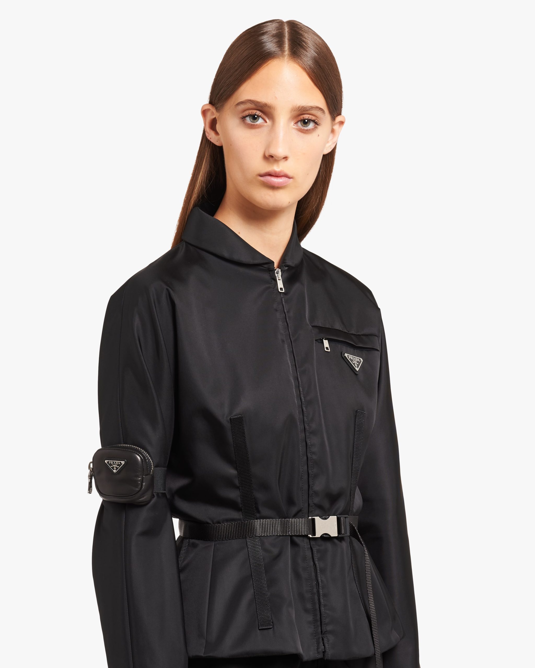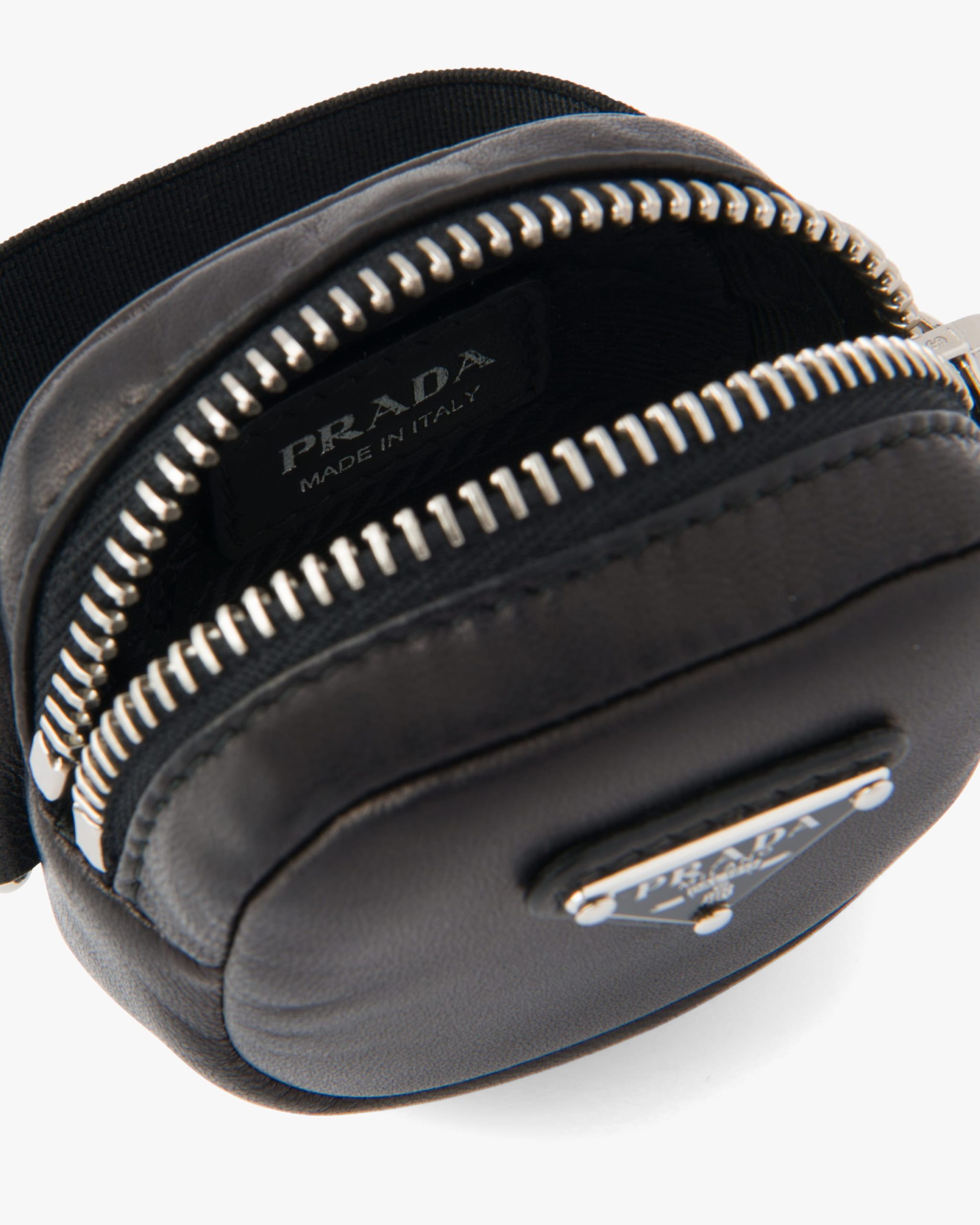The Fall Winter 2020 collectsion features a series of beautiful accessories inspired by the vanity cases of the 1920s. This modern reinterpretation is made of soft nappa leather and comes with an elasticized band on the back so it can be worn in different ways. The triangle logo, a hallmark of the brand that first appeared on the trunks designed by Mario Prada, features a luxurious enamel finish.