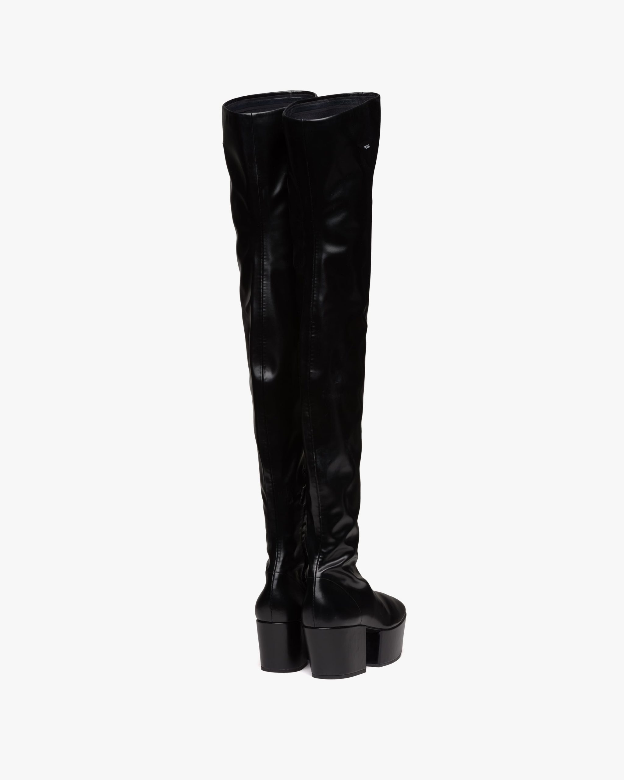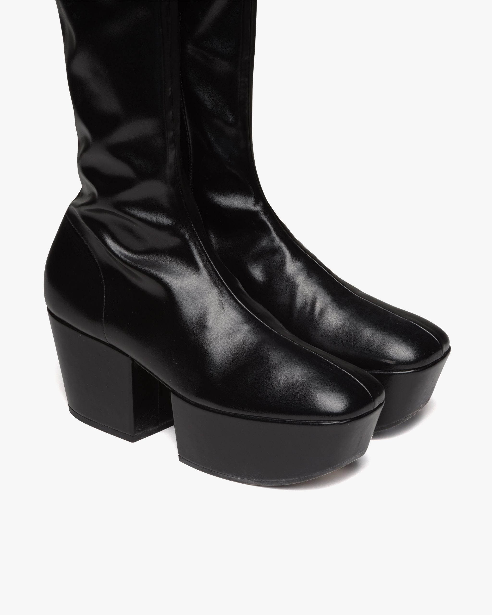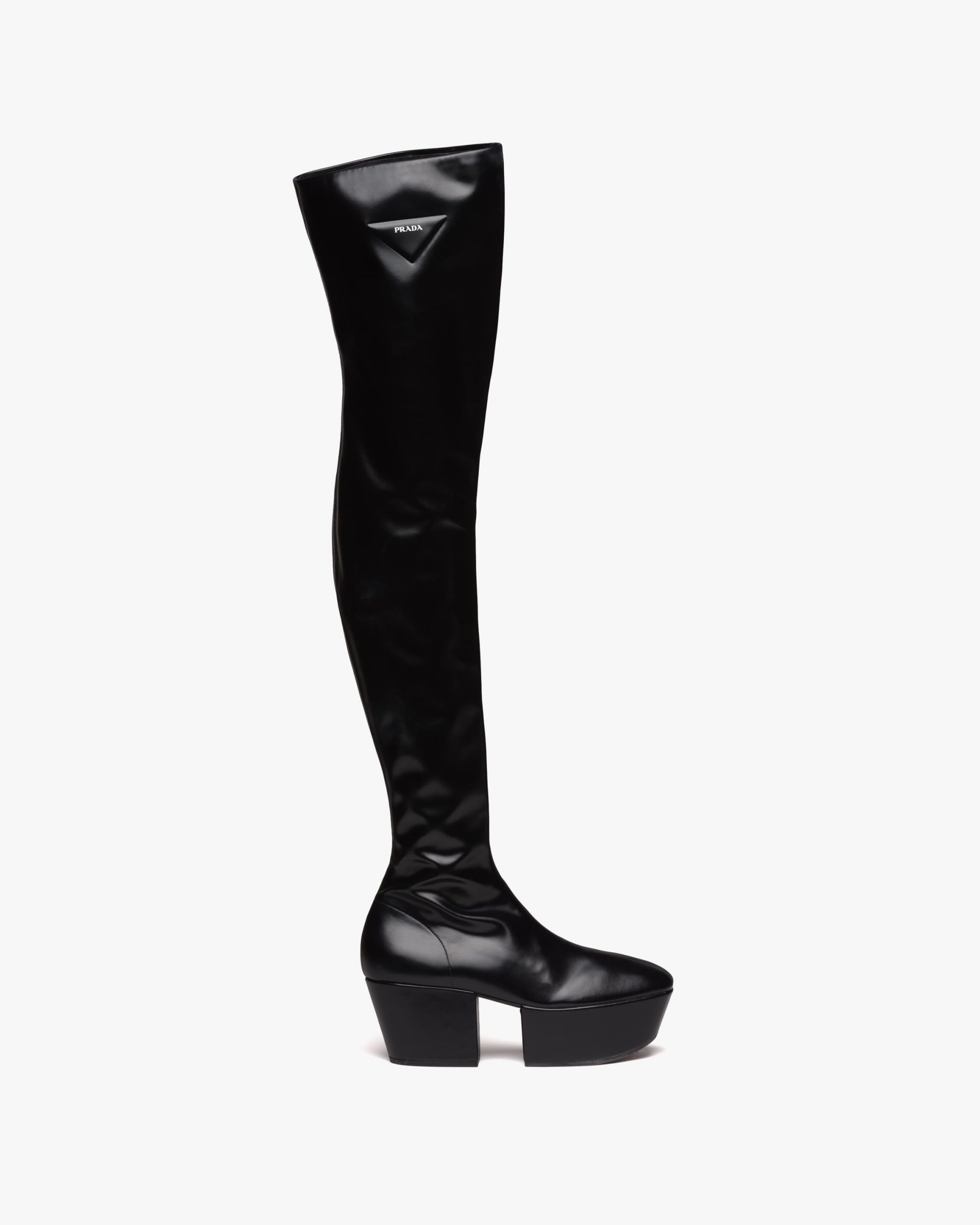 Defined by a platform that recalls architectural geometric shapes of the seventies, these over-the-knee boots are made of soft nappa tech, an innovative material. Infused with a modernist soul, the design reinterprets retro lines in a new way. The screen-printed triangle logo gives the product an iconic accent.
