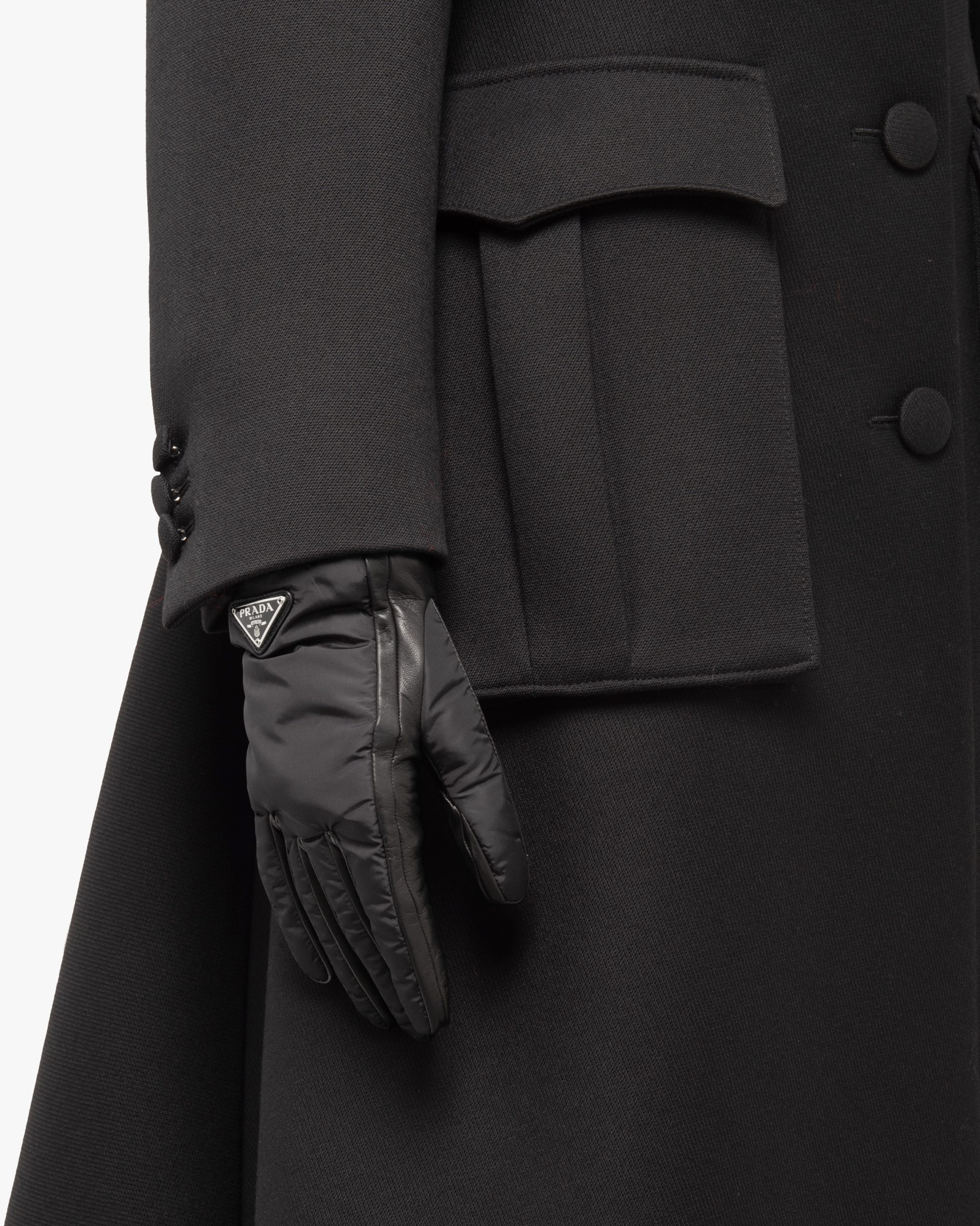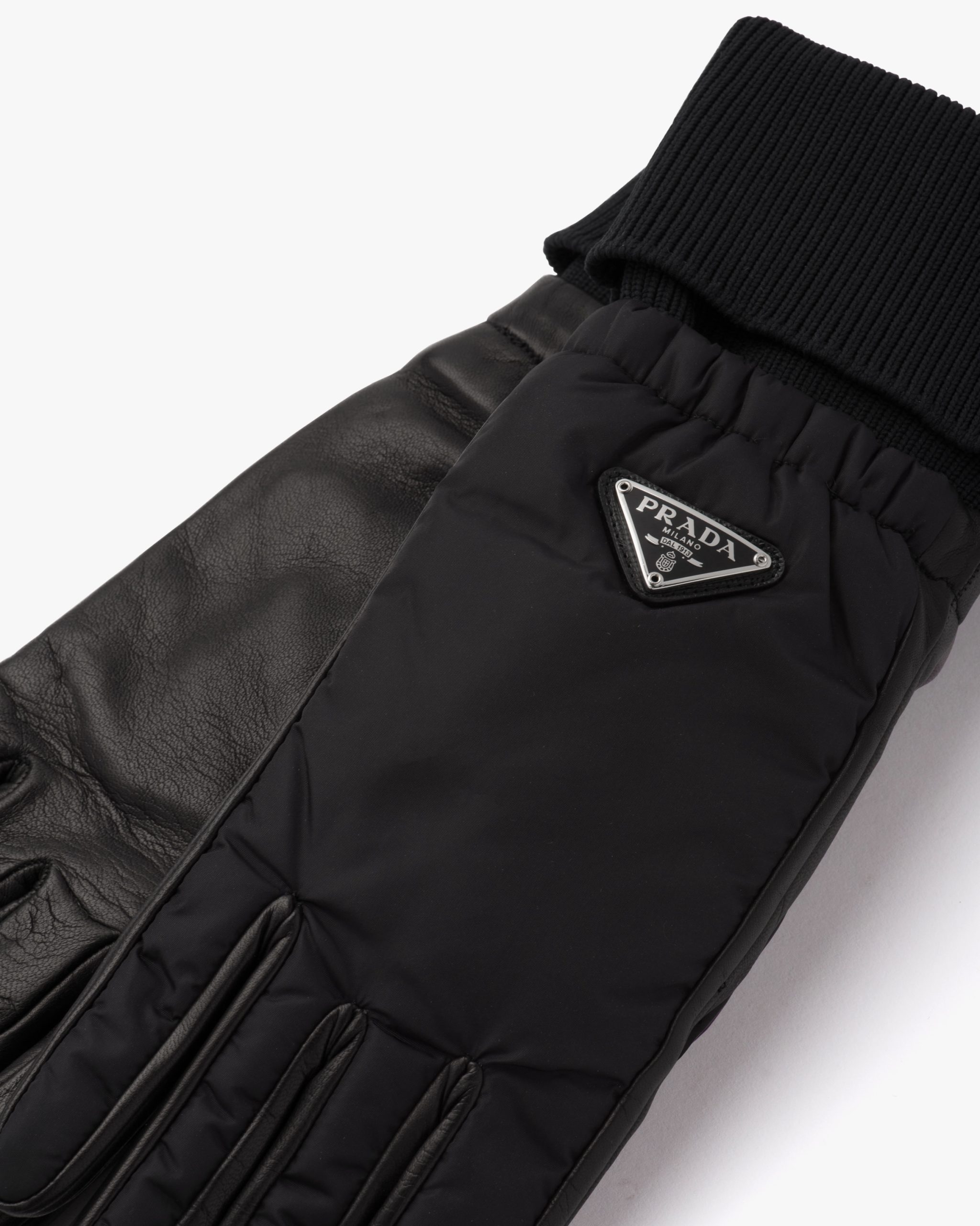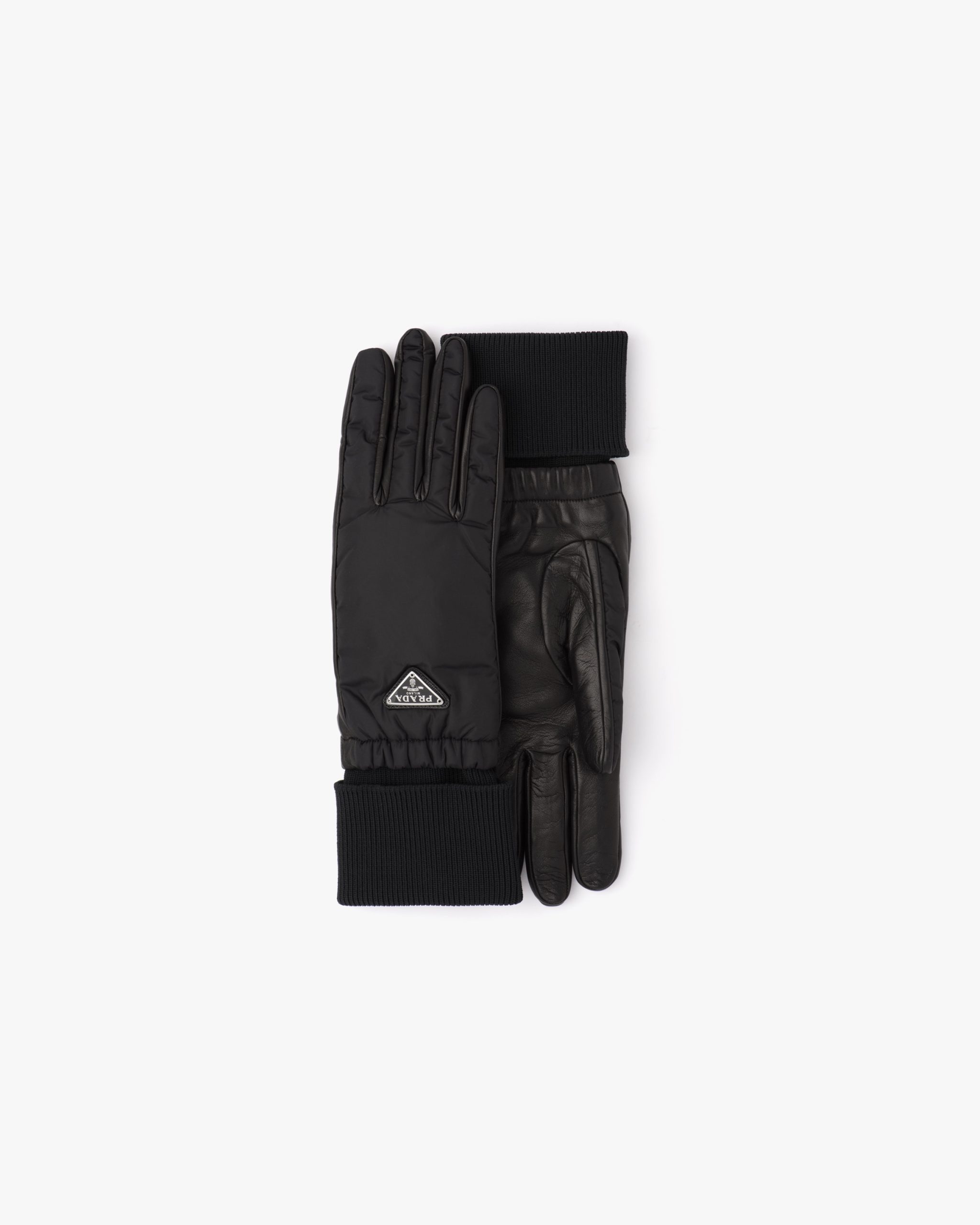 These gloves made of iconic Prada nylon have ribbed knit cuffs. With a nappa leather palm and soft cashmere lining, they are decorated with the enameled metal triangle logo.