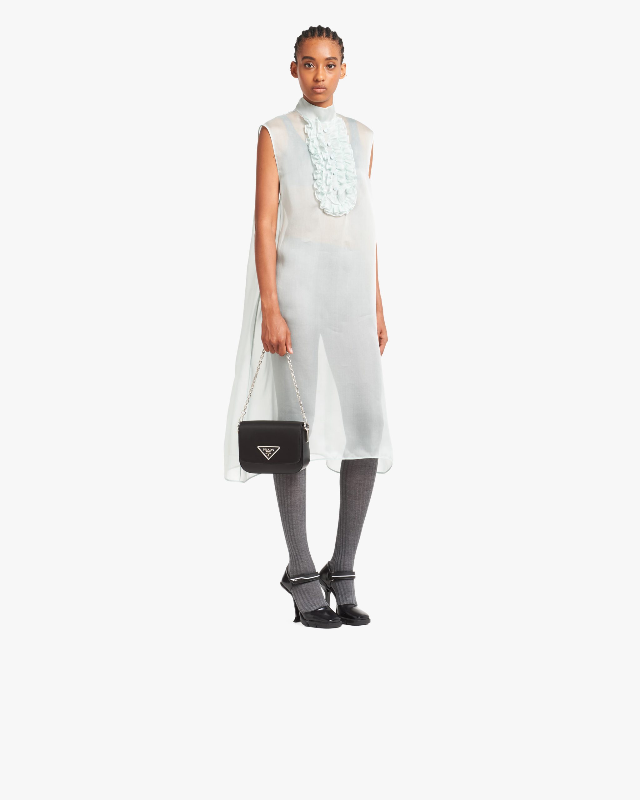 The combination of iconic Prada nylon and leather characterizes this sophisticated shoulder bag. Metal hardware and a detachable chain handle illuminate the design. The lettering logo decorates the accessory.