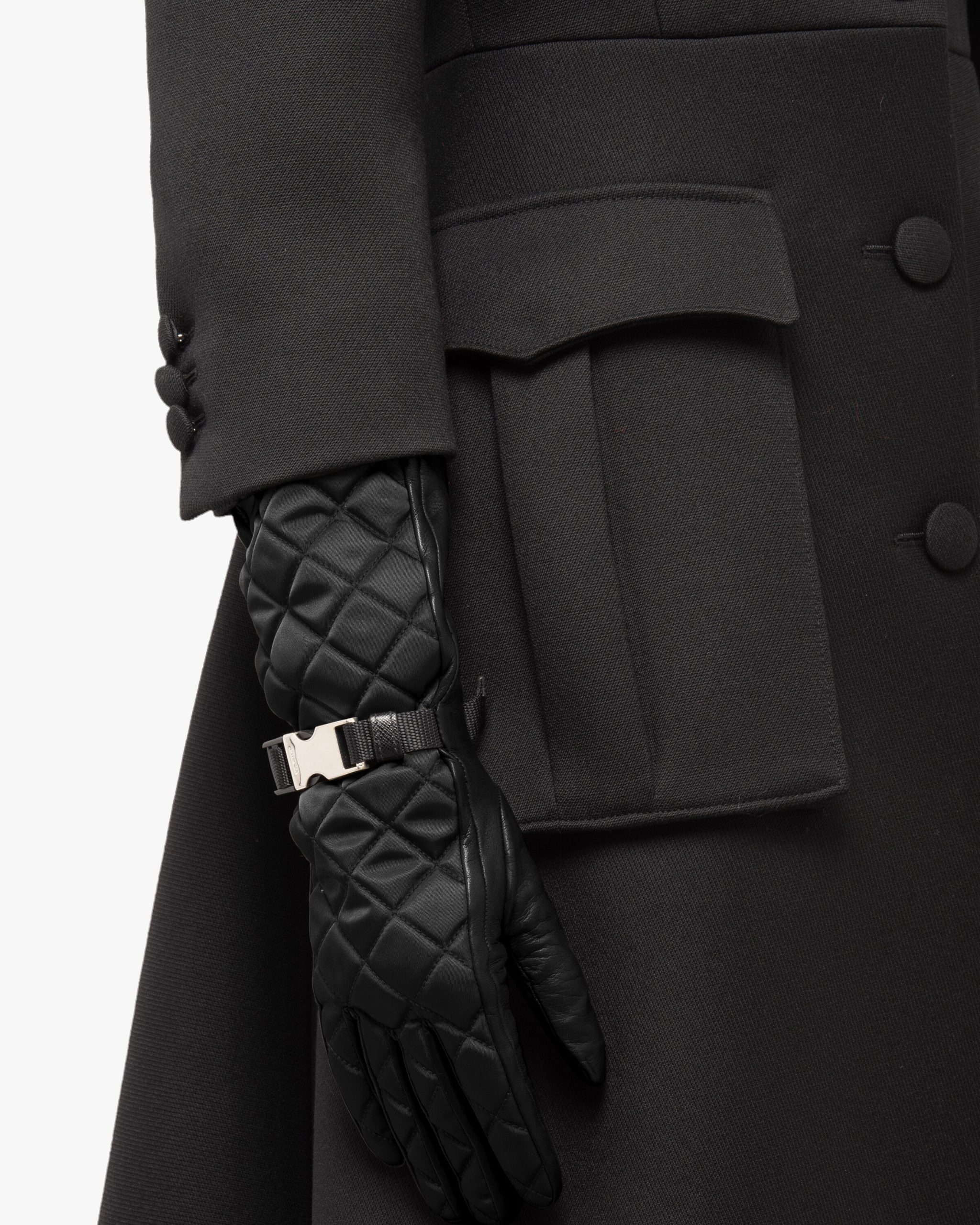 Characterized by sophisticated stitching, iconic nylon Prada meets nappa leather in these elegant tapered gloves. They have a metal buckle on the wrist and cashmere lining.