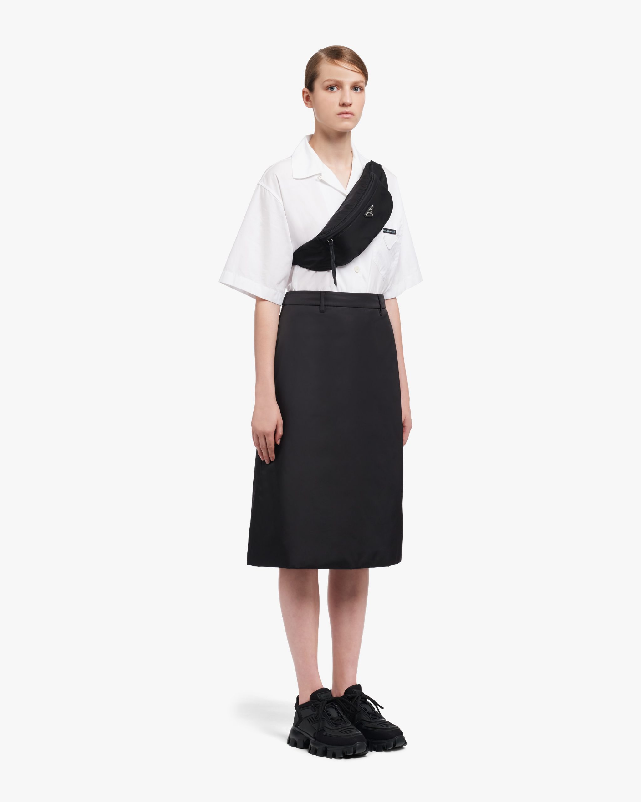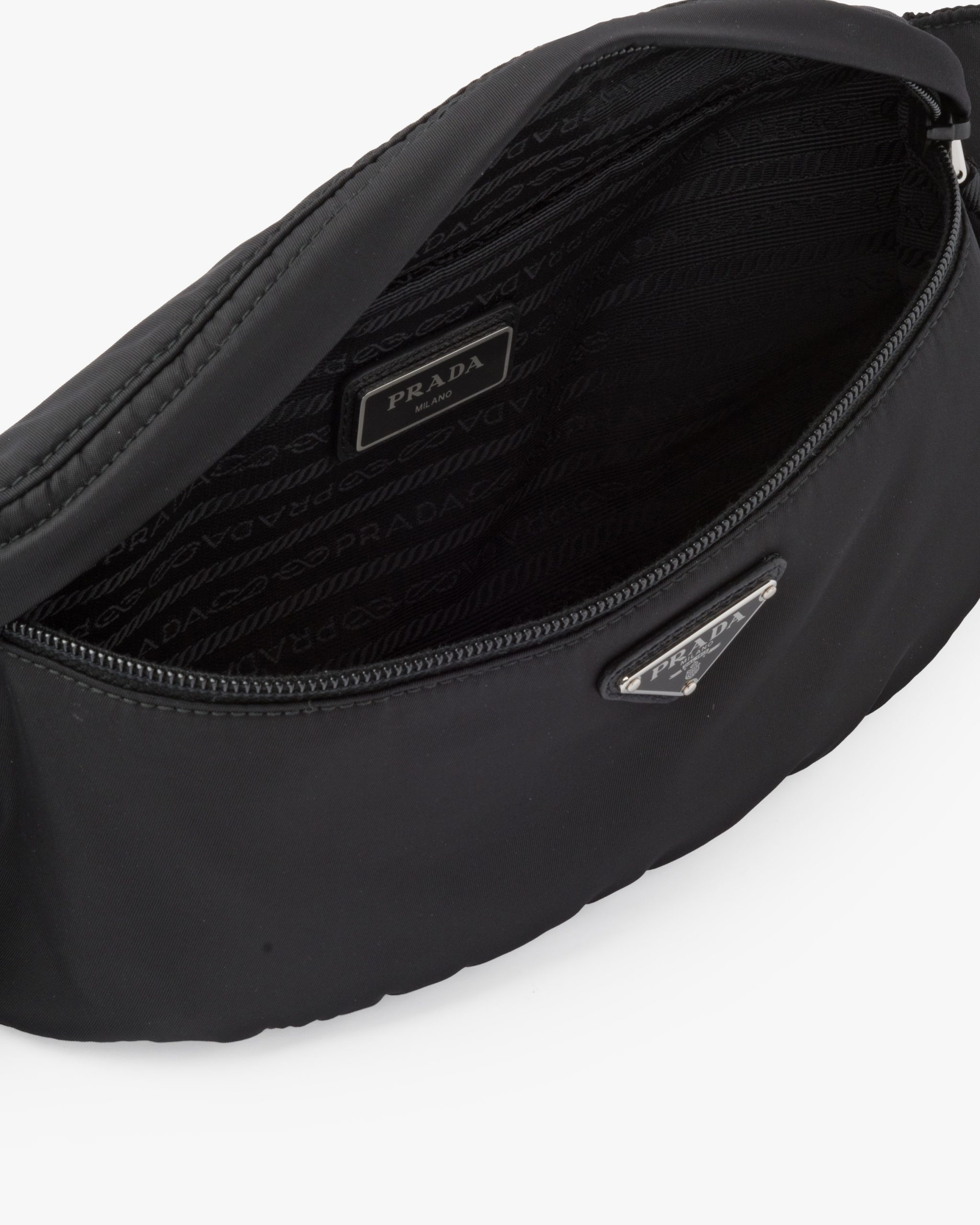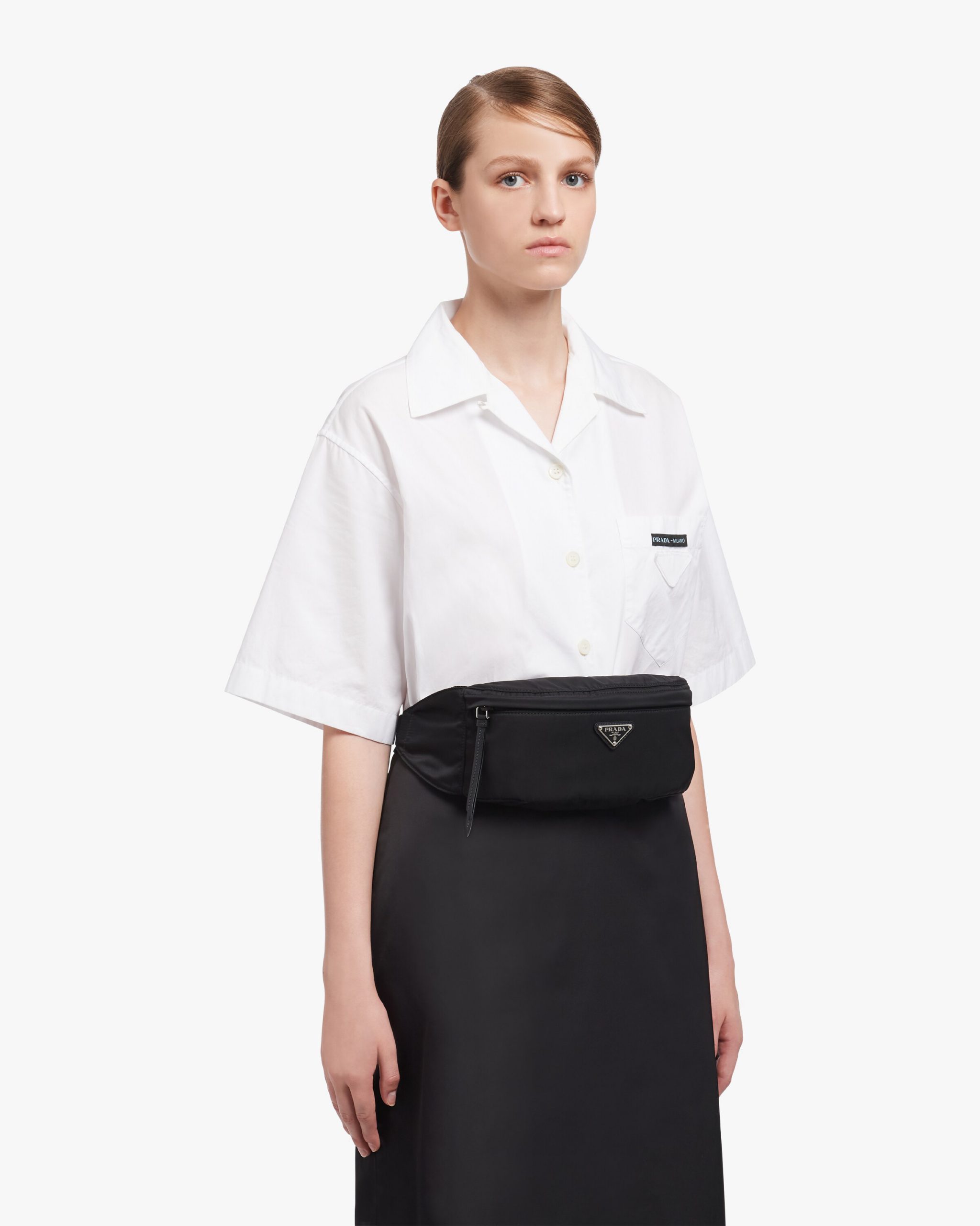 Influences from streetwear define this belt bag made of nylon, an iconic material of the brand that was first introduced in the luxury world by Prada. The enameled metal triangle logo accents the front.