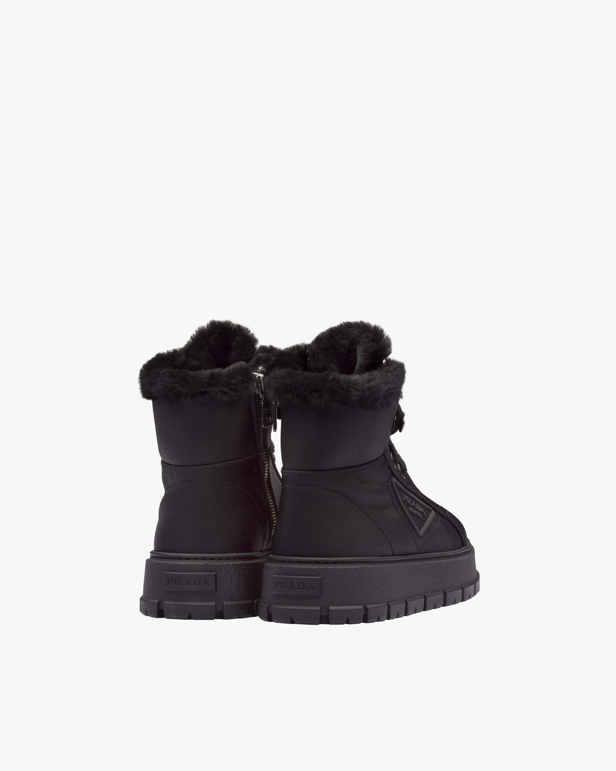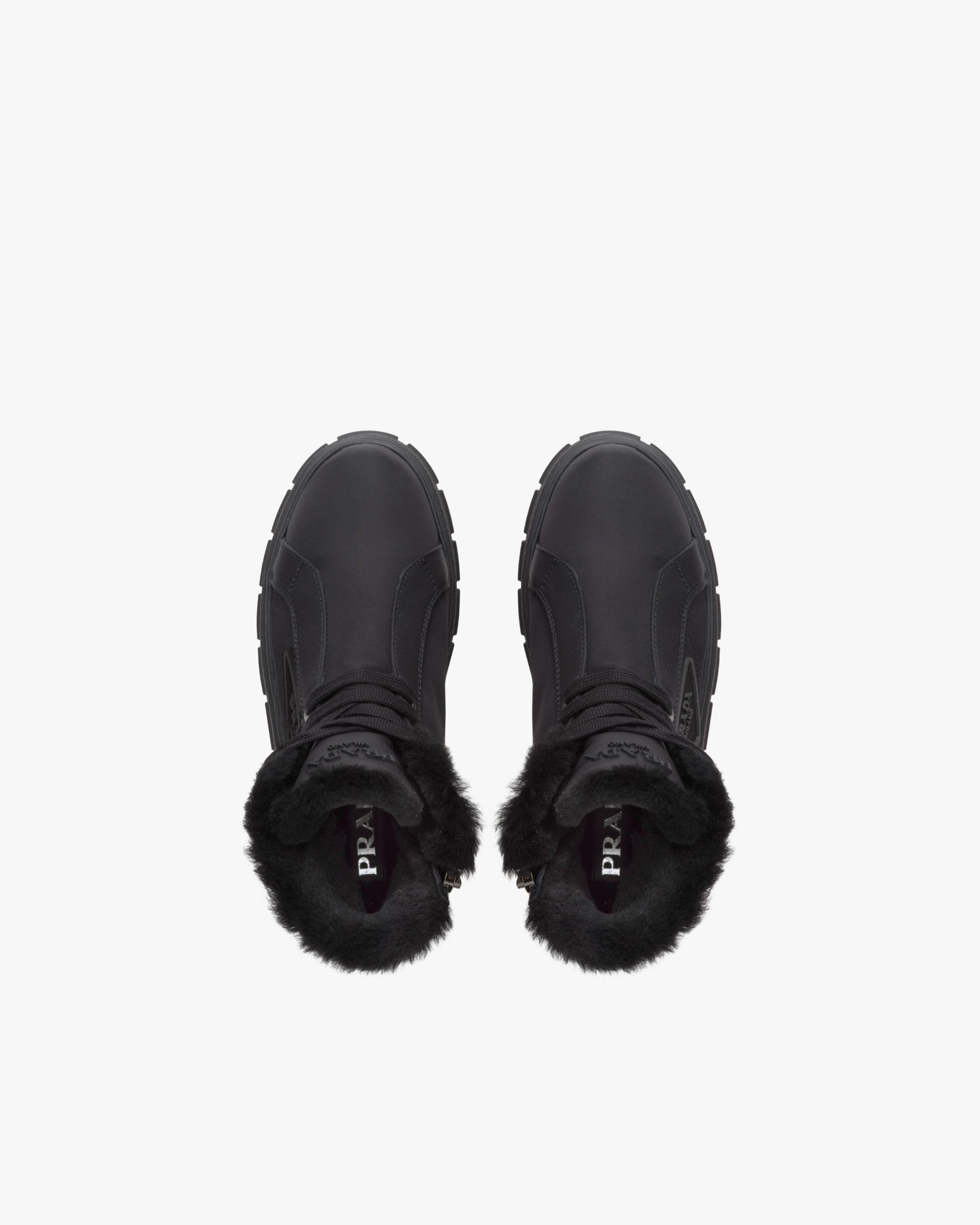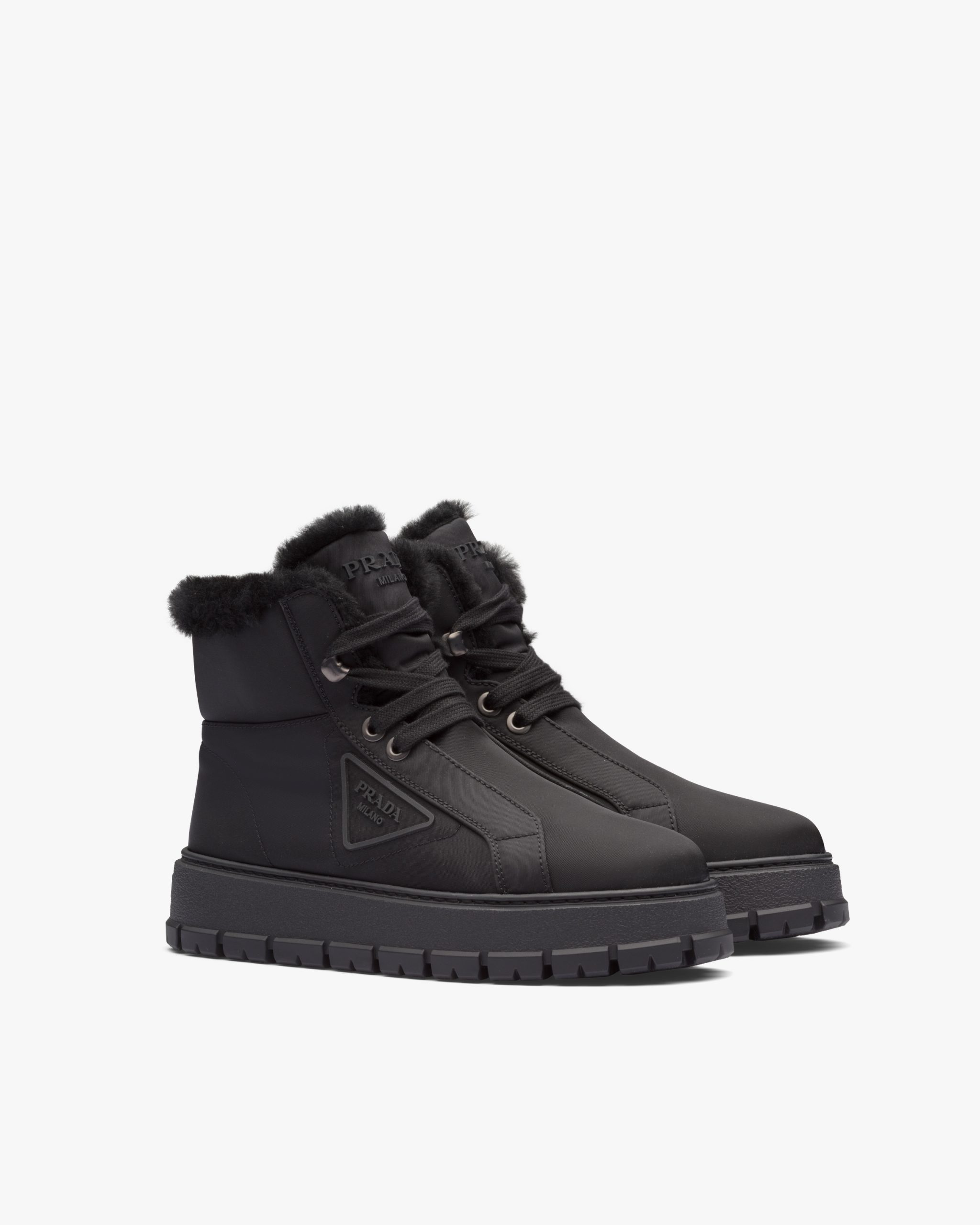 Details inspired by the mountains are reinterpreted through the contemporary design of these lace-up booties made of nylon, an iconic Prada material. The three-dimensional rubber logo accents the footwear.
