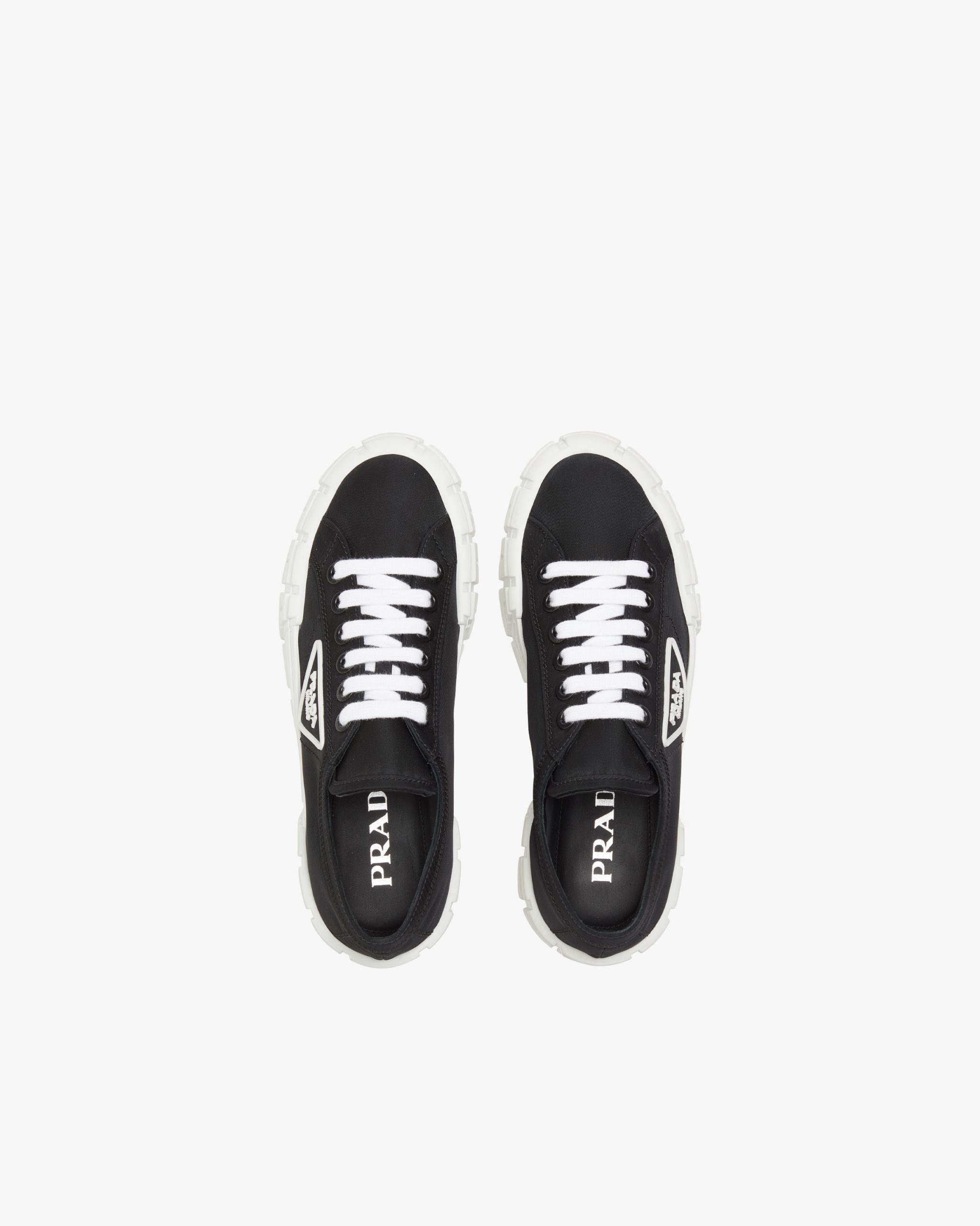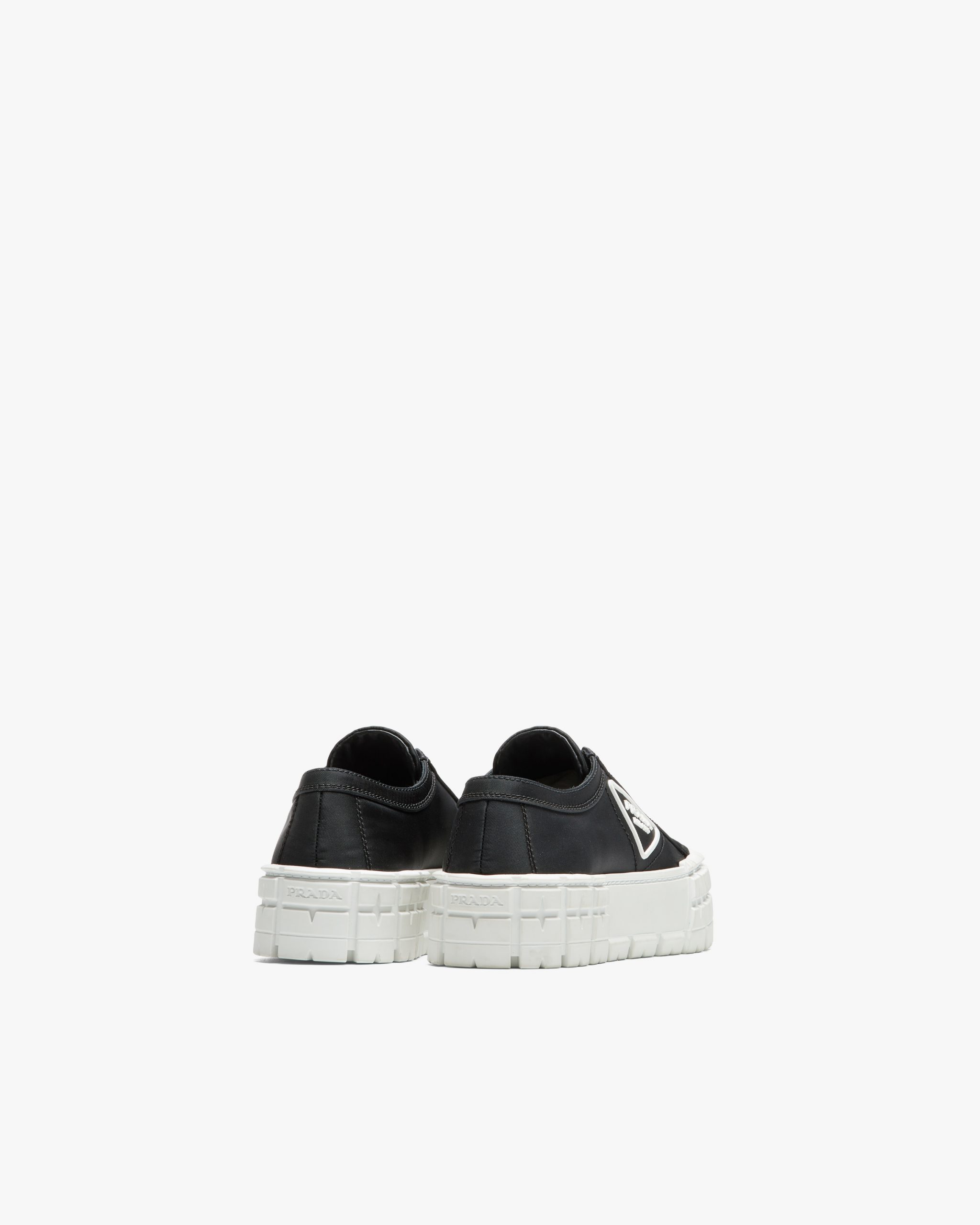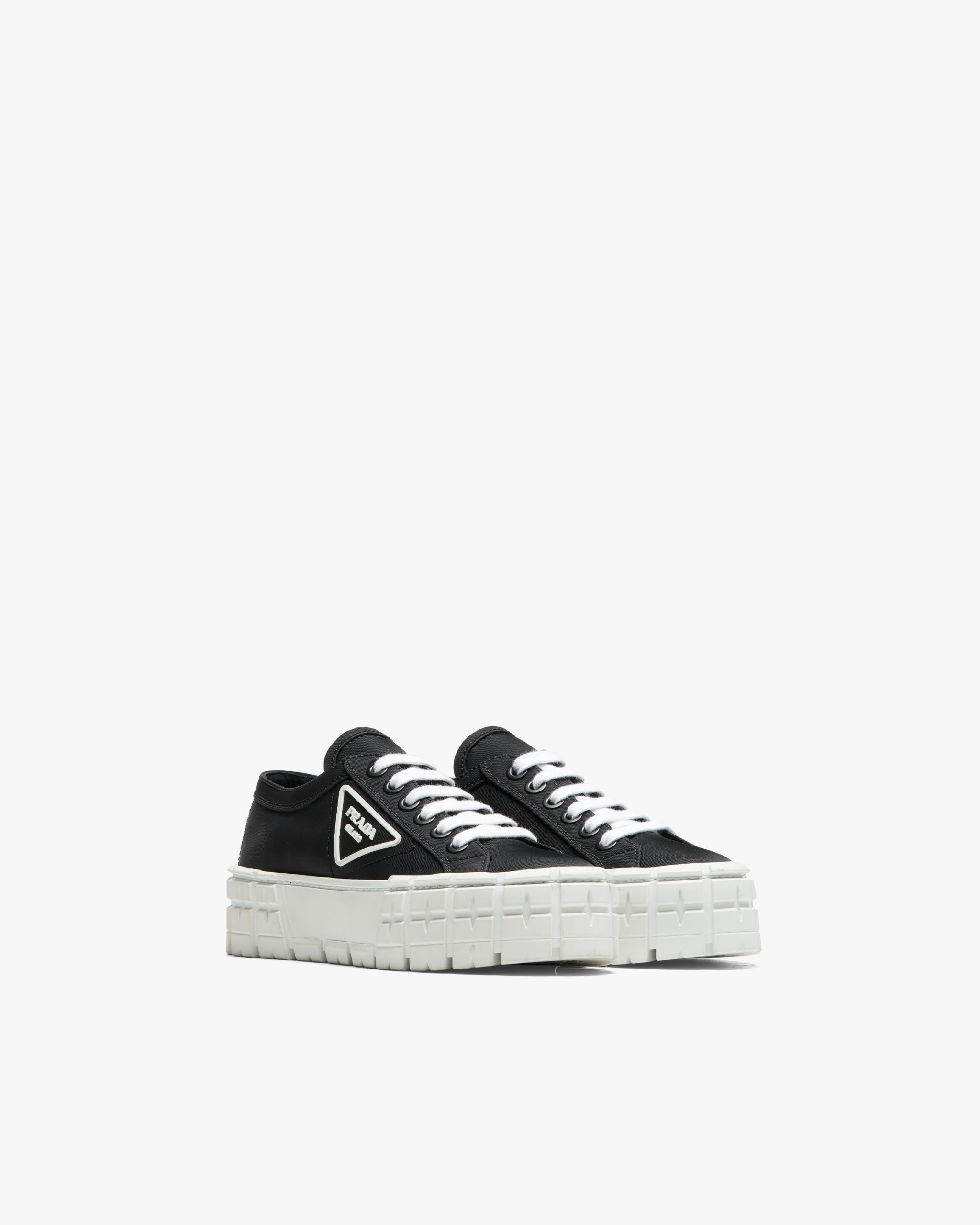 The rubber platform inspired by motocross tires defines the unusual design of these nylon gabardine sneakers. The logo triangle decorates the side of the shoe.