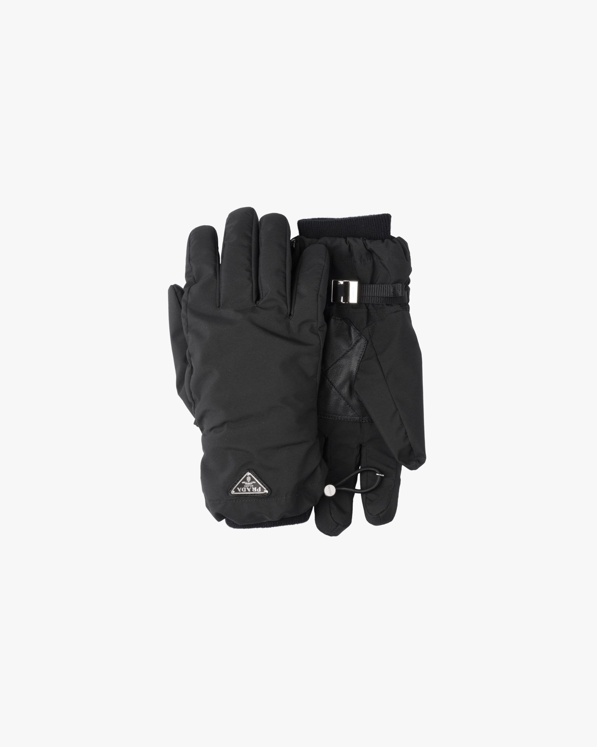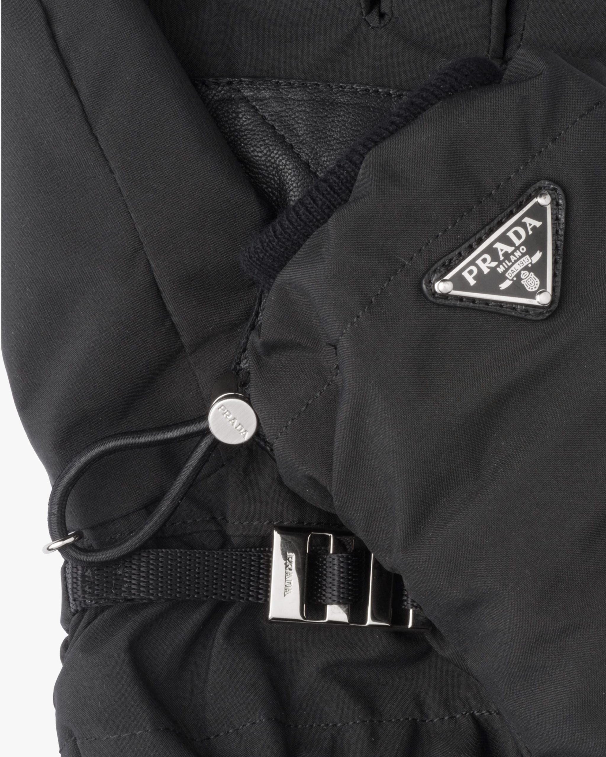 Nylon gloves with tonal leather inserts, drawstring on the cuff and small strap with buckle. They are decorated with the iconic enamel triangle logo.