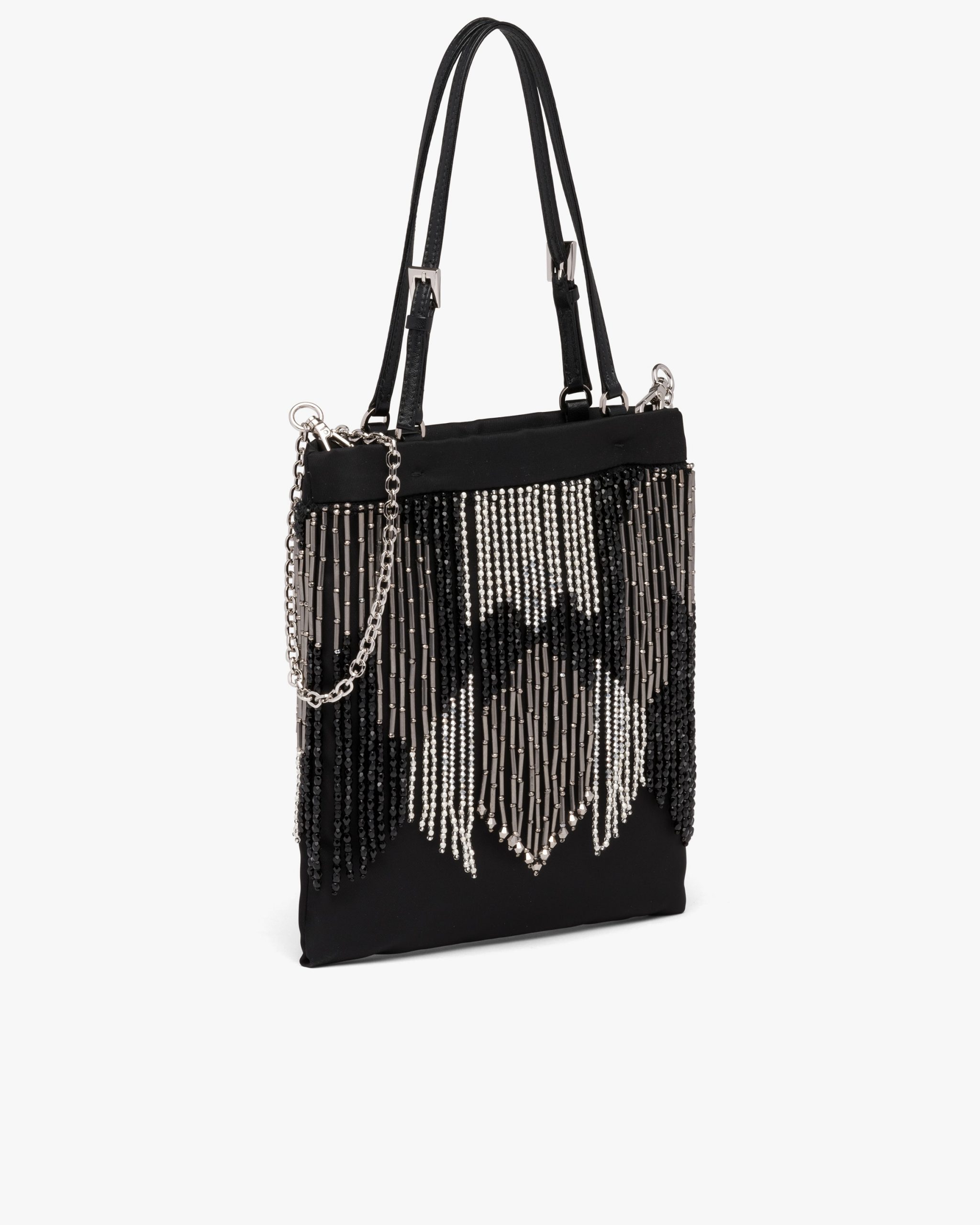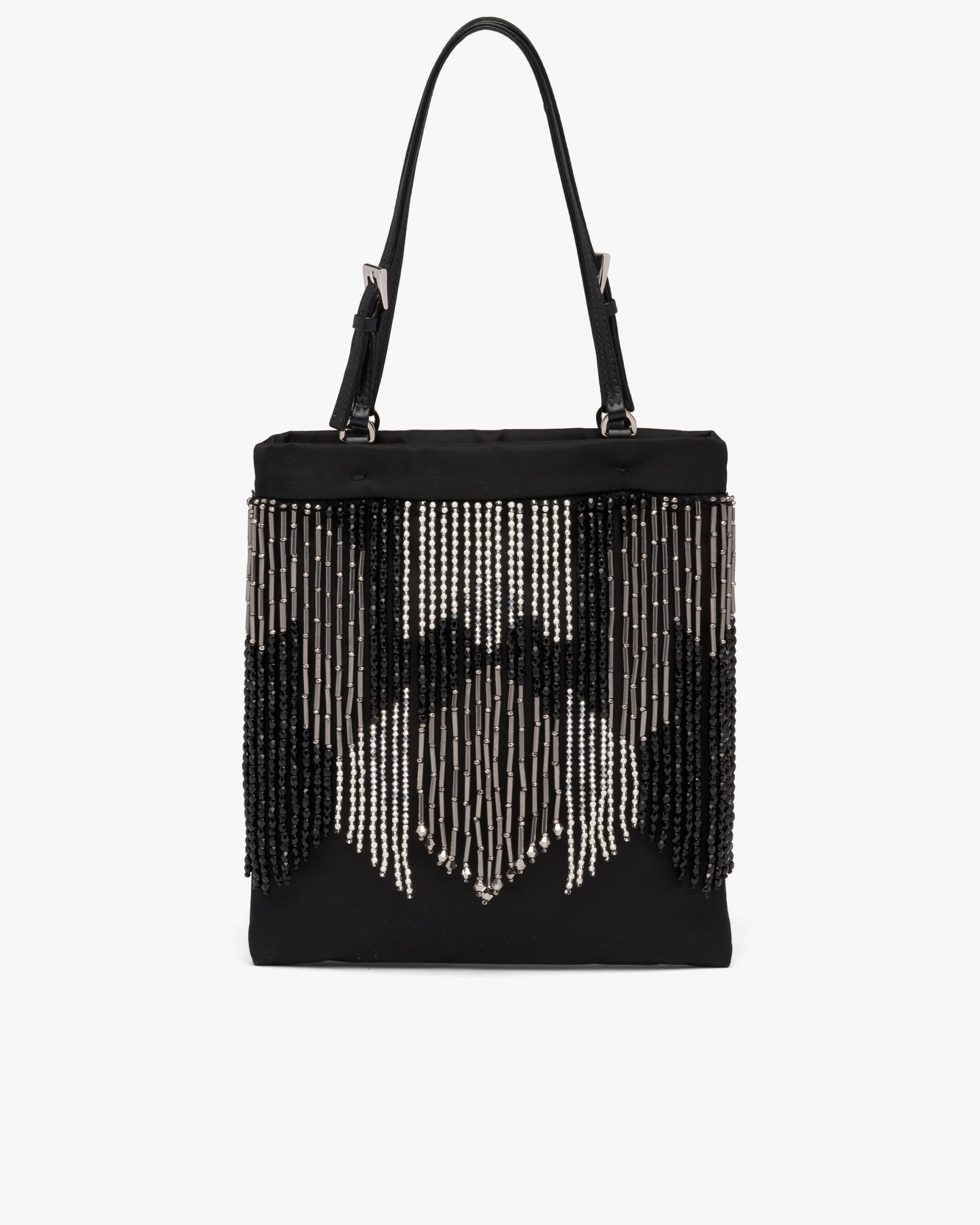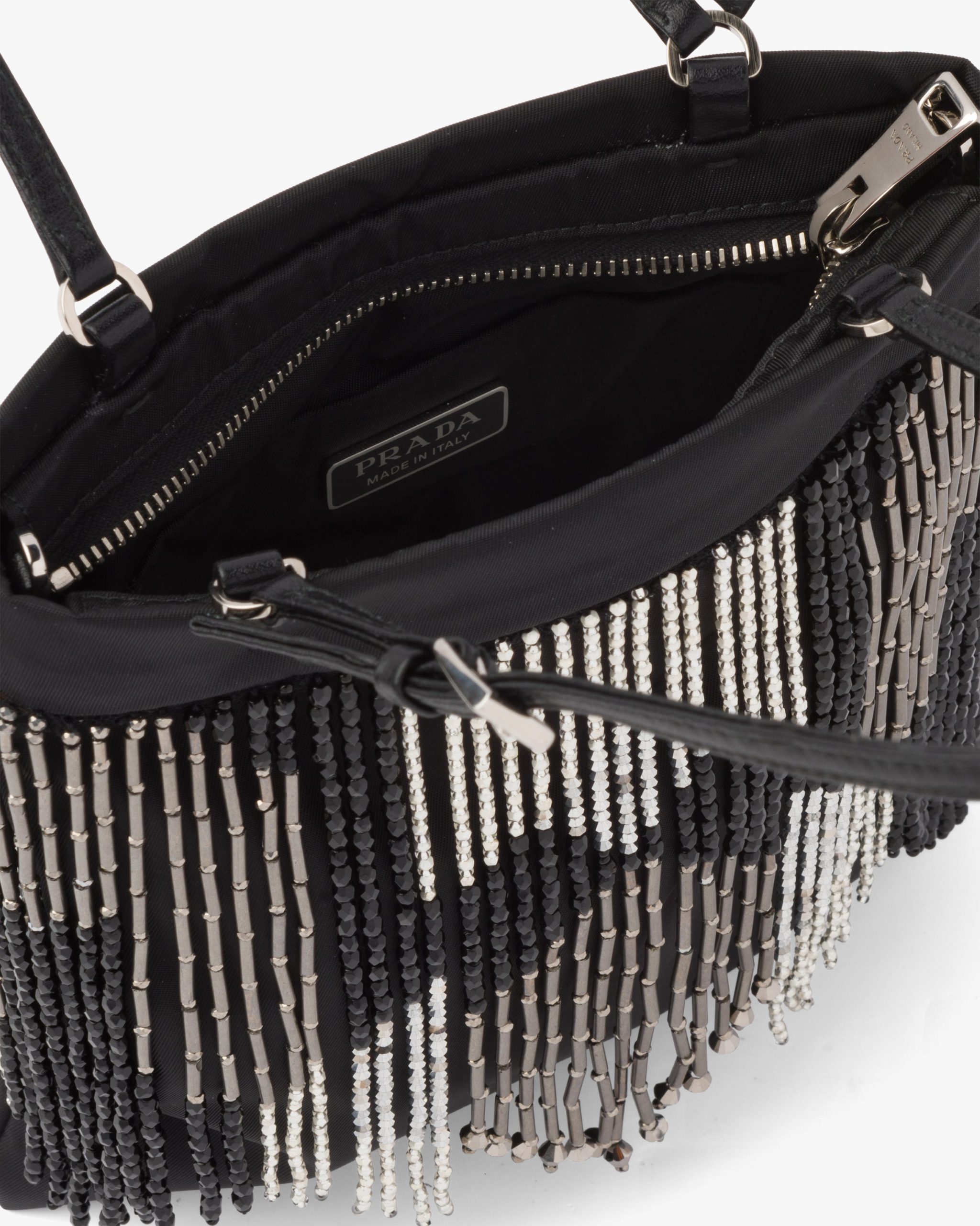 The jet and baguette fringe adds brio to this handbag in nylon, an iconic Prada material. The accessory with zipper closure and leather handles has a detachable chain shoulder strap. The iconic enameled metal triangle logo stands out on the back.