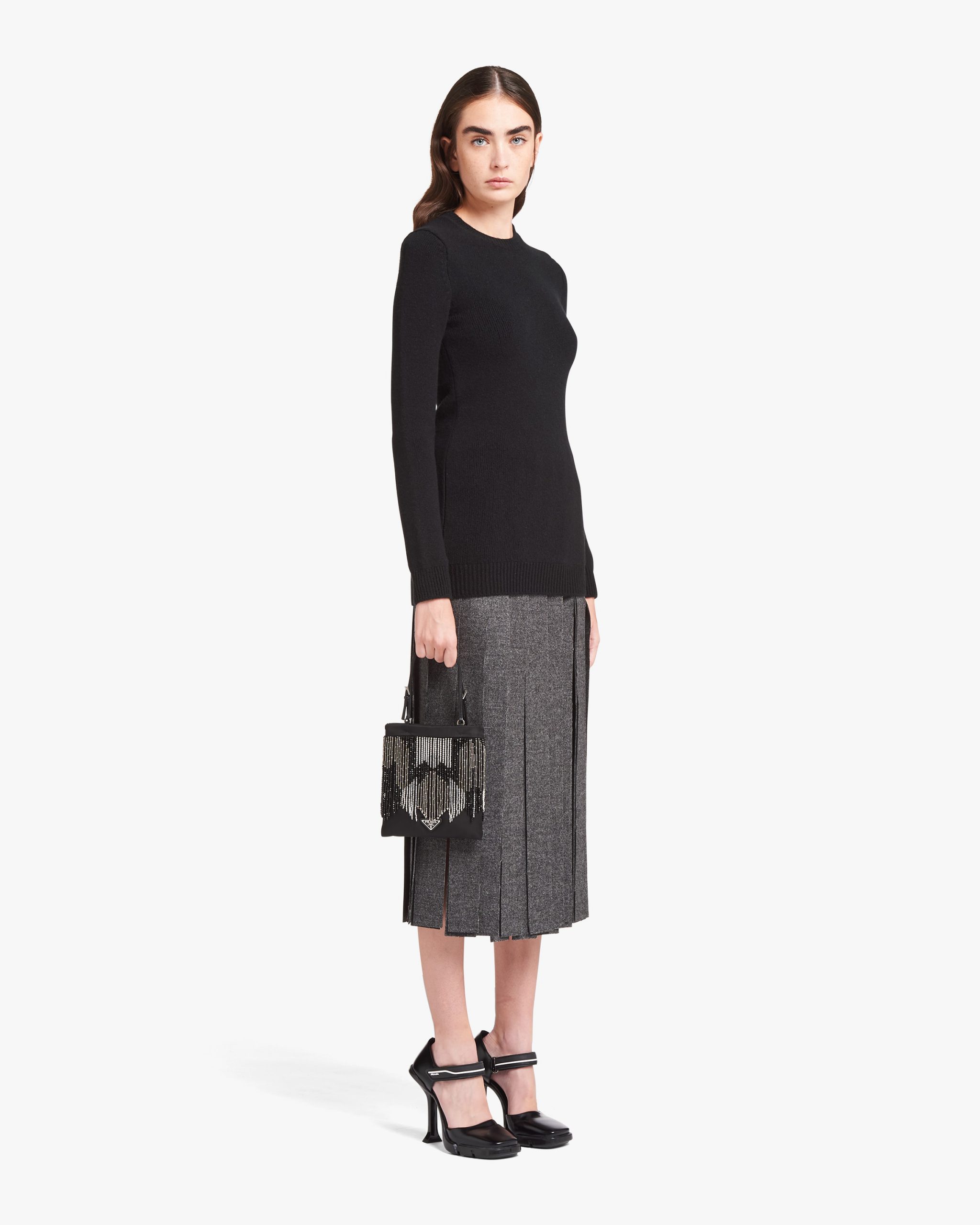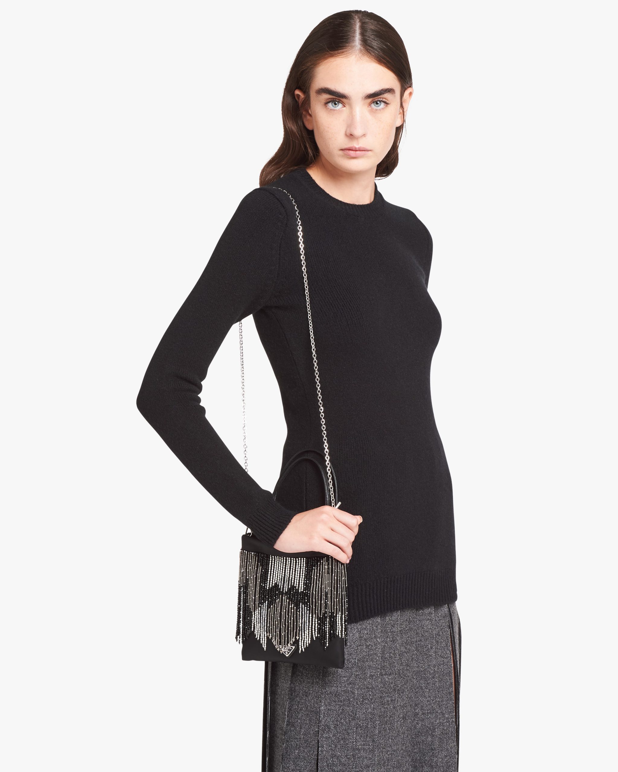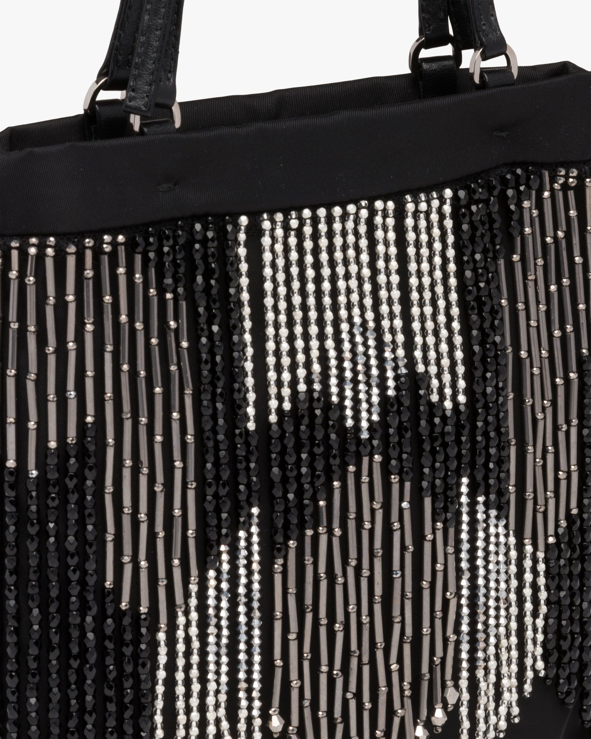 The jet and baguette fringe adds brio to this handbag in nylon, an iconic Prada material. The accessory with zipper closure and leather handles has a detachable chain shoulder strap. The iconic enameled metal triangle logo stands out on the back.