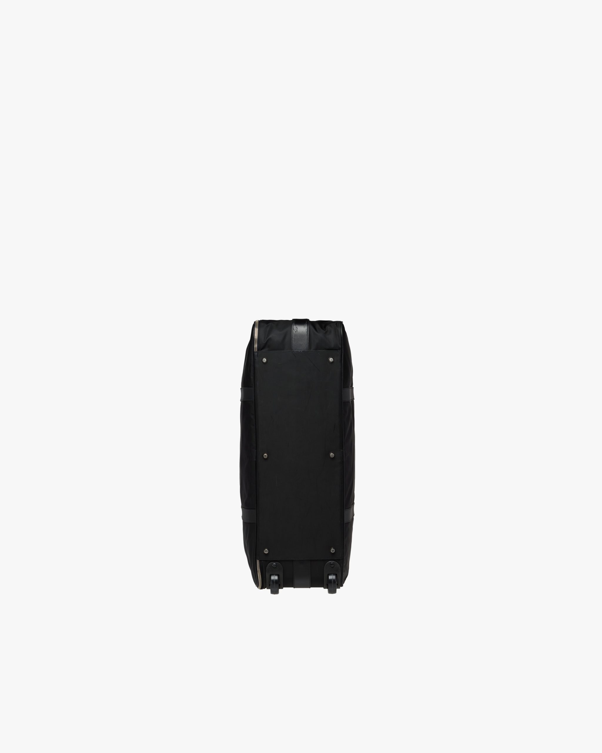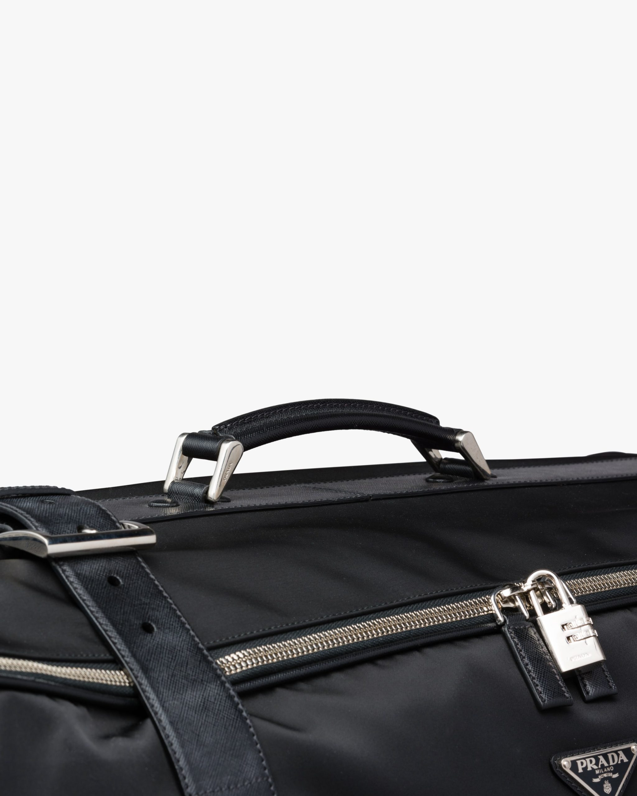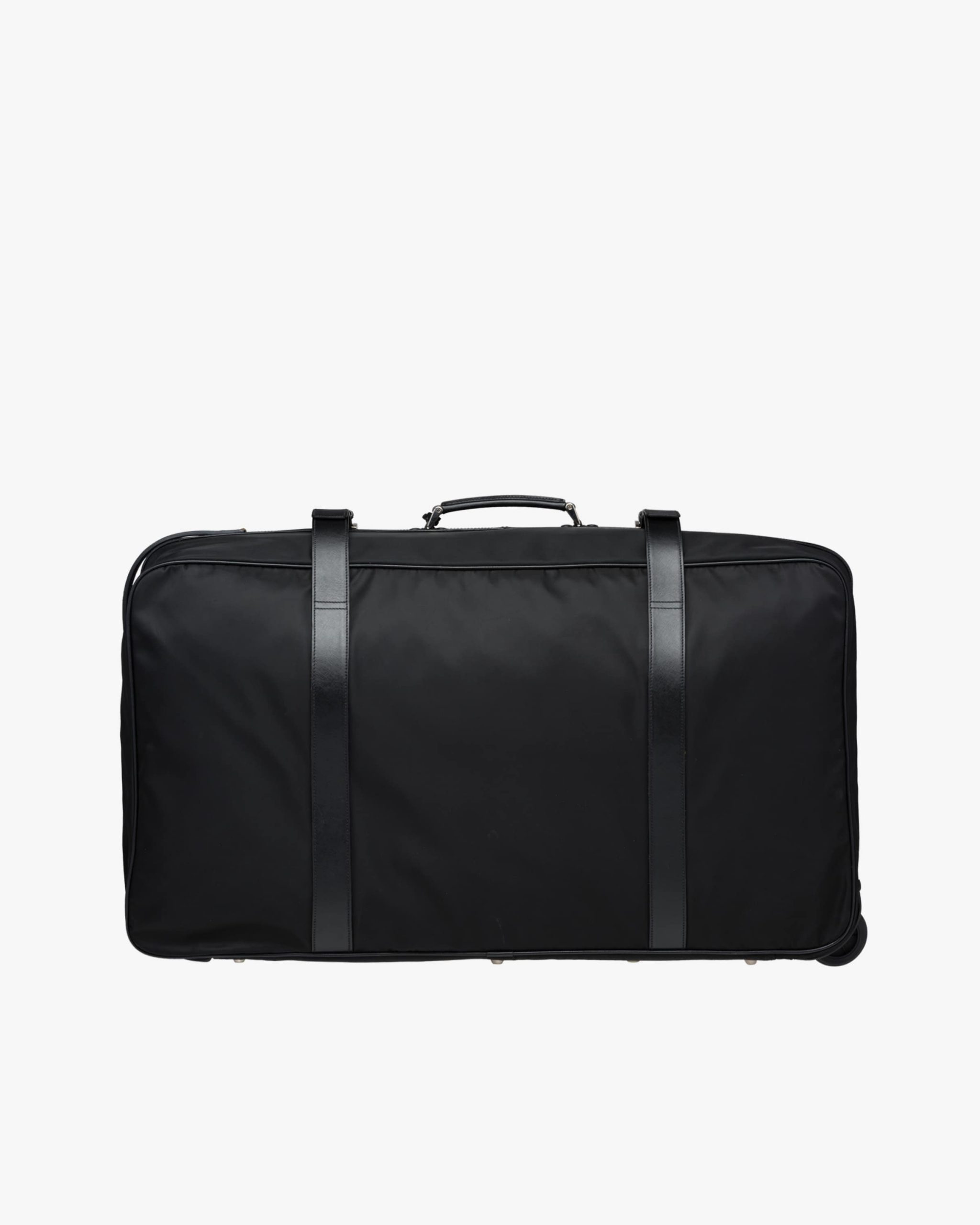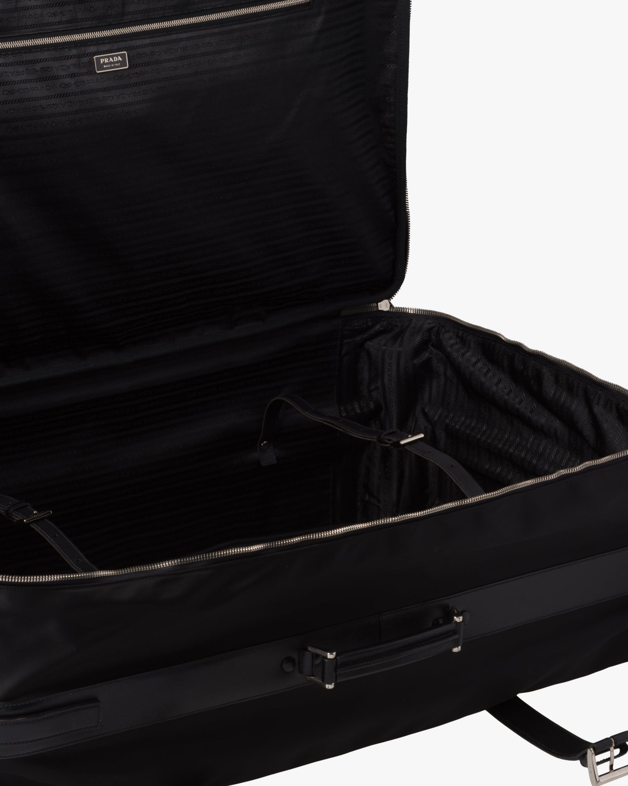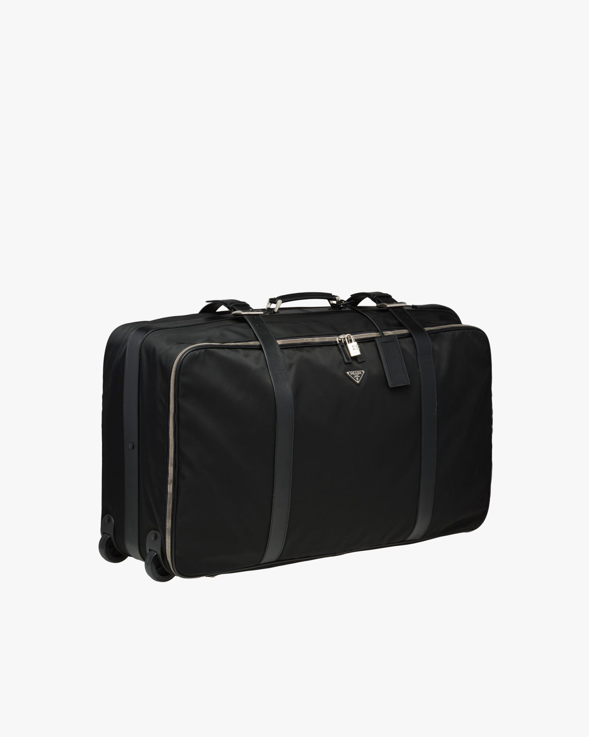A semi-hardsided suitcase detailed with Prada logo, combination lock and name tag. The two-way zipper opens onto one compartment with straps for securing clothes. There are two wheels and a detachable strap.