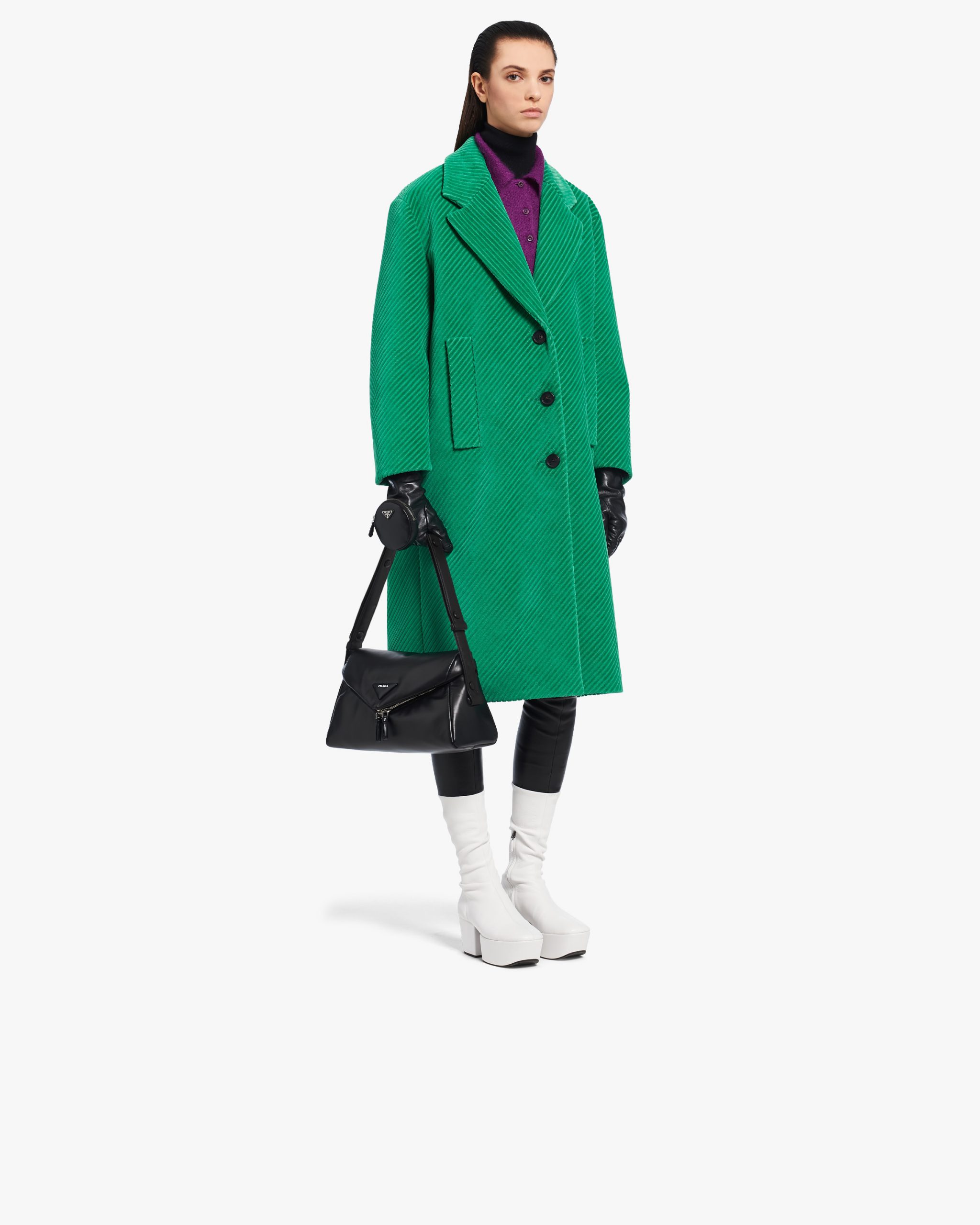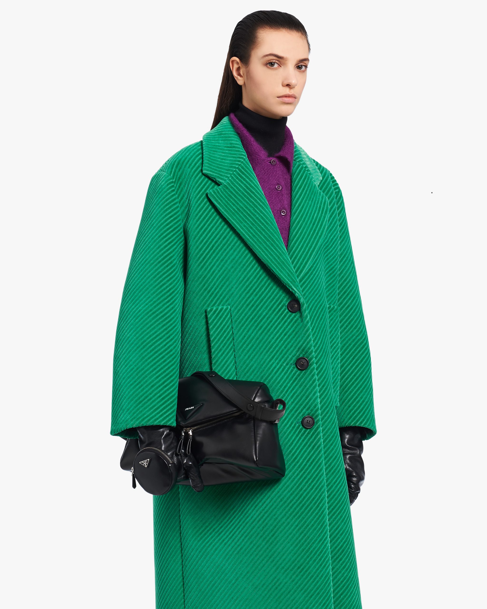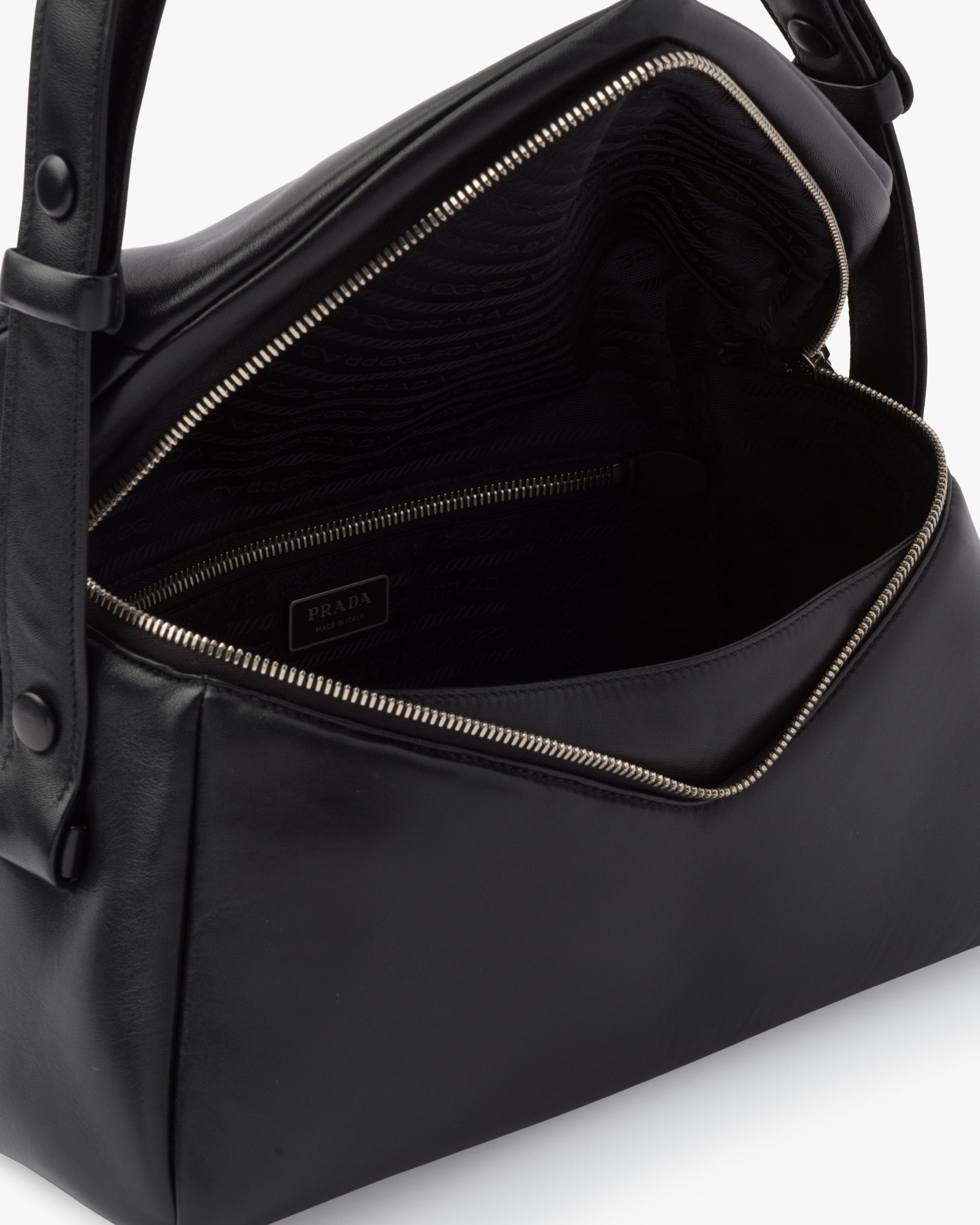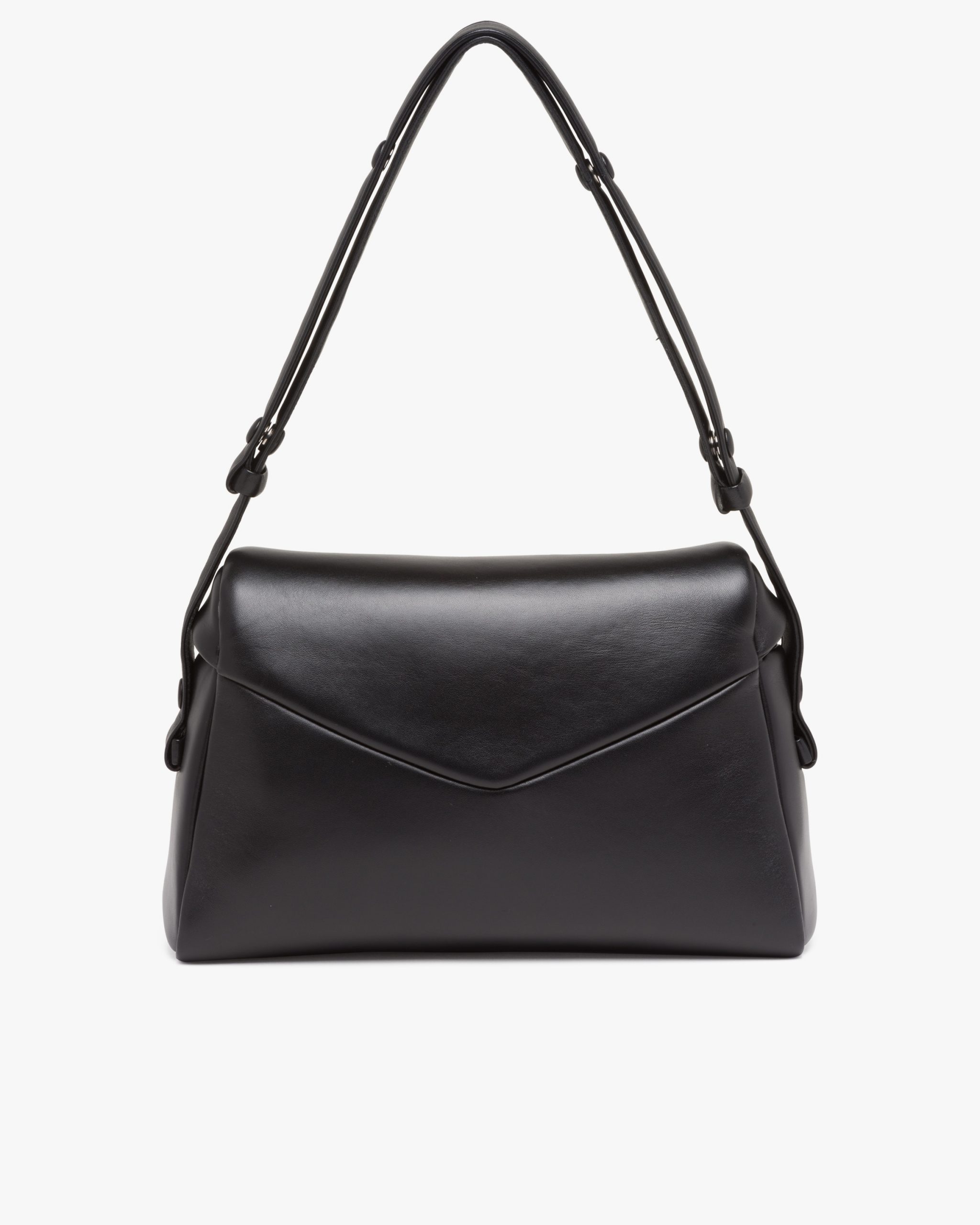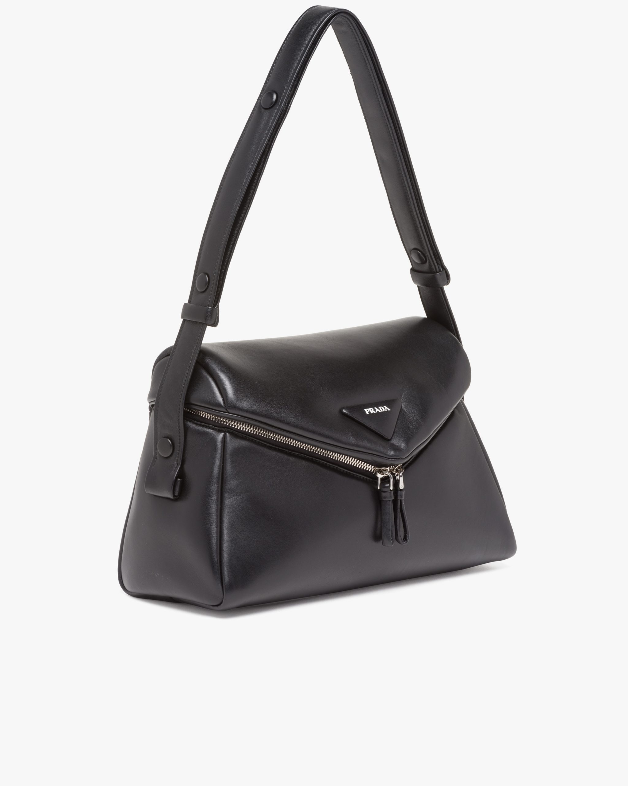 This soft nappa leather shoulder bag with sleek, minimalist lines has a contemporary attitude and a special reverse stitch construction. A study of the triangle inspires new geometric details and unique interpretations of the historic Prada logo. The iconic shape is reworked in the wide flap of this slightly padded accessory, completed by an adjustable leather handle that lets it be worn in different ways.