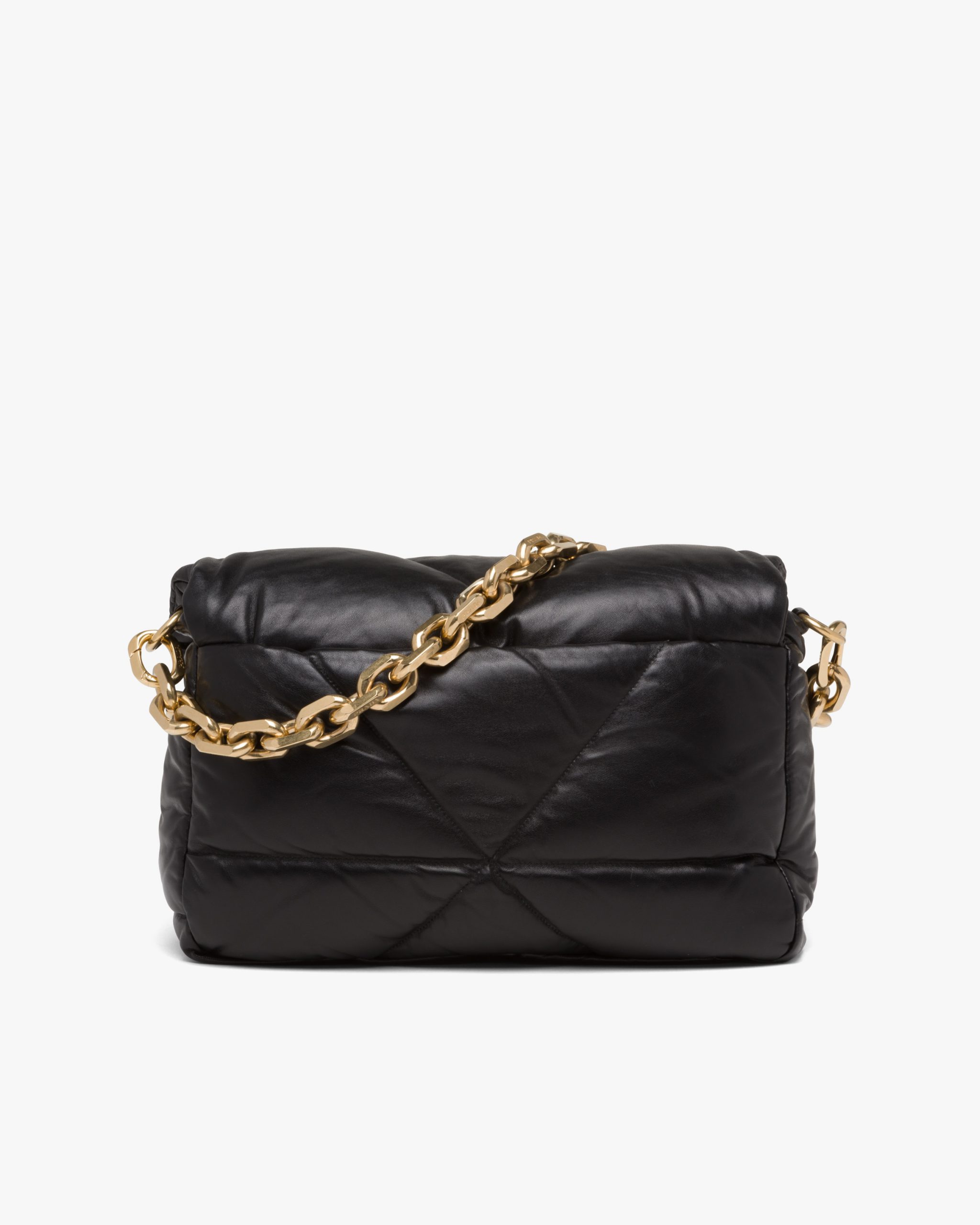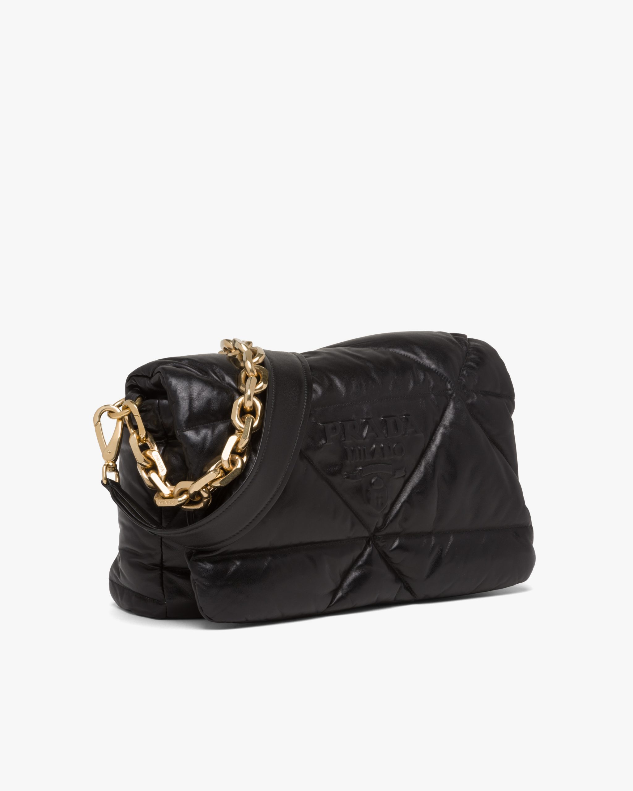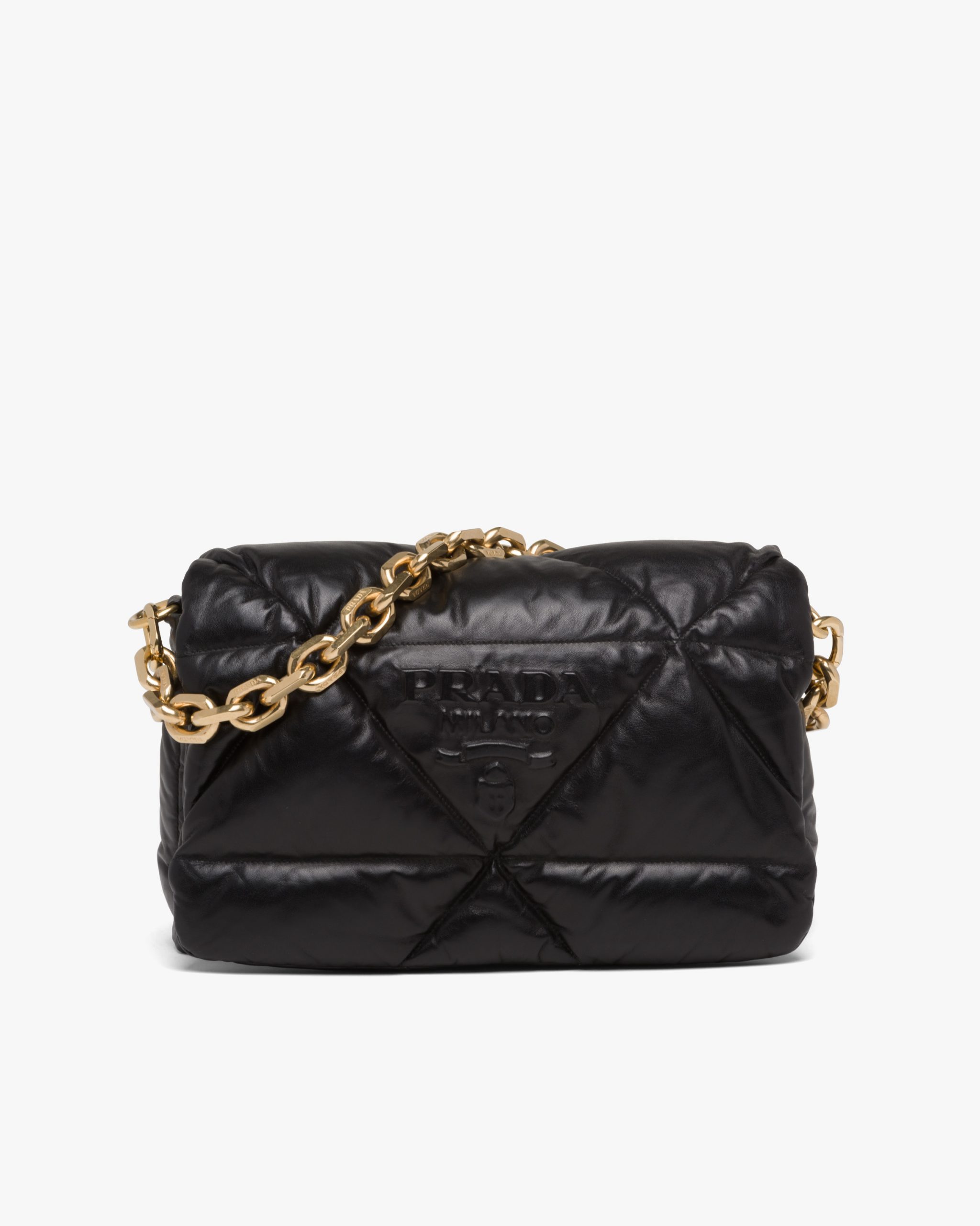 Reinterpreted in always new ways, Prada’s iconic triangle is repeated in the quilted motif of this soft padded nappa leather bag to create a patchwork motif. The chain handle is decorated with the engraved lettering logo.