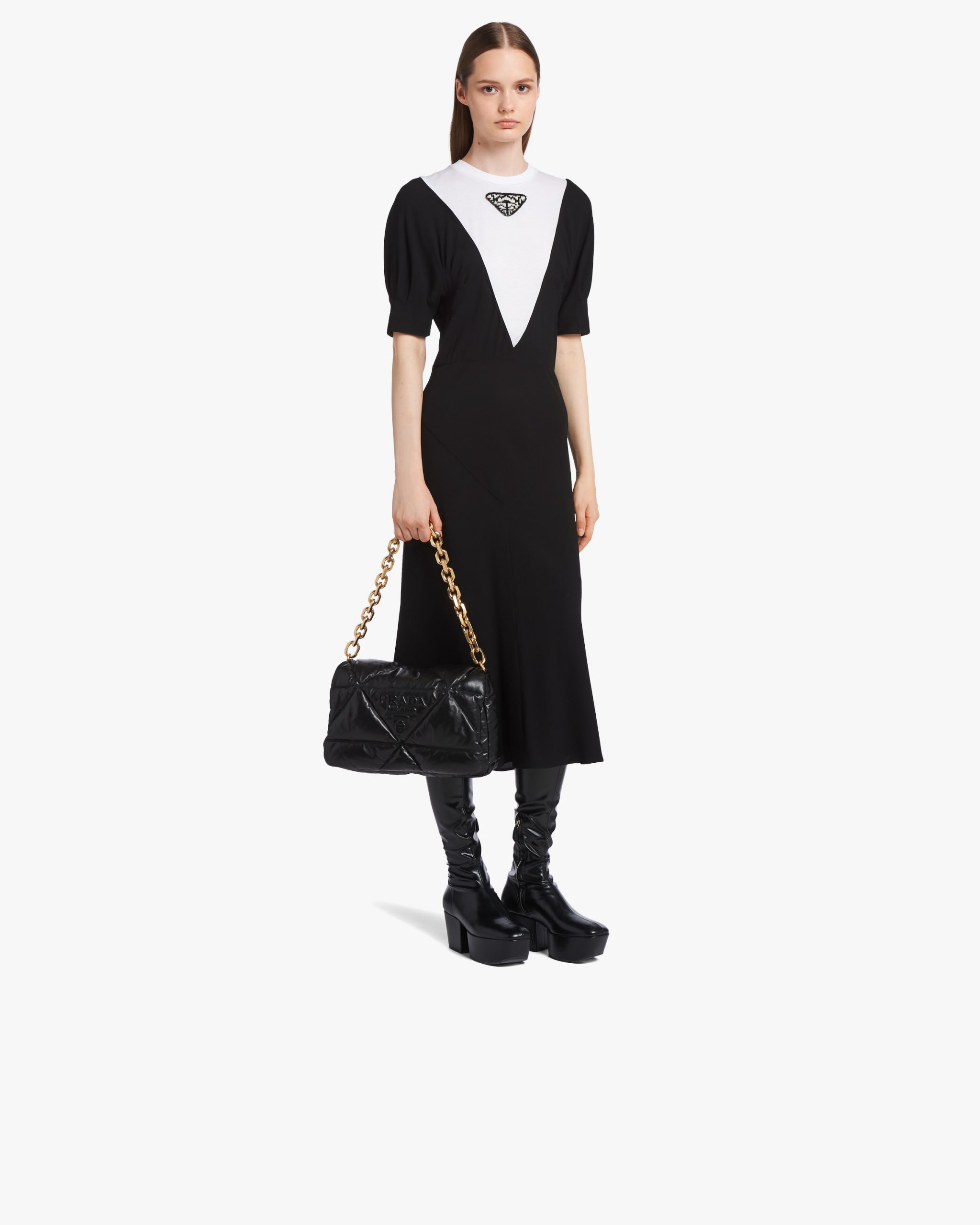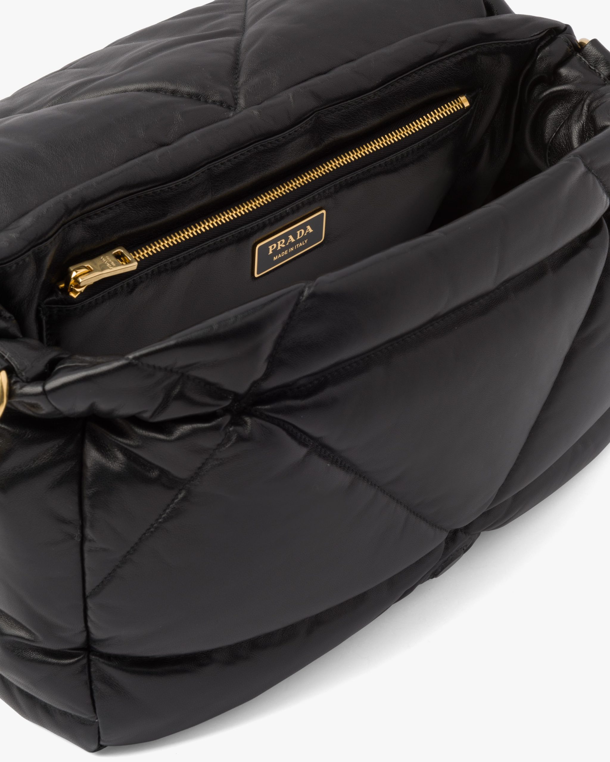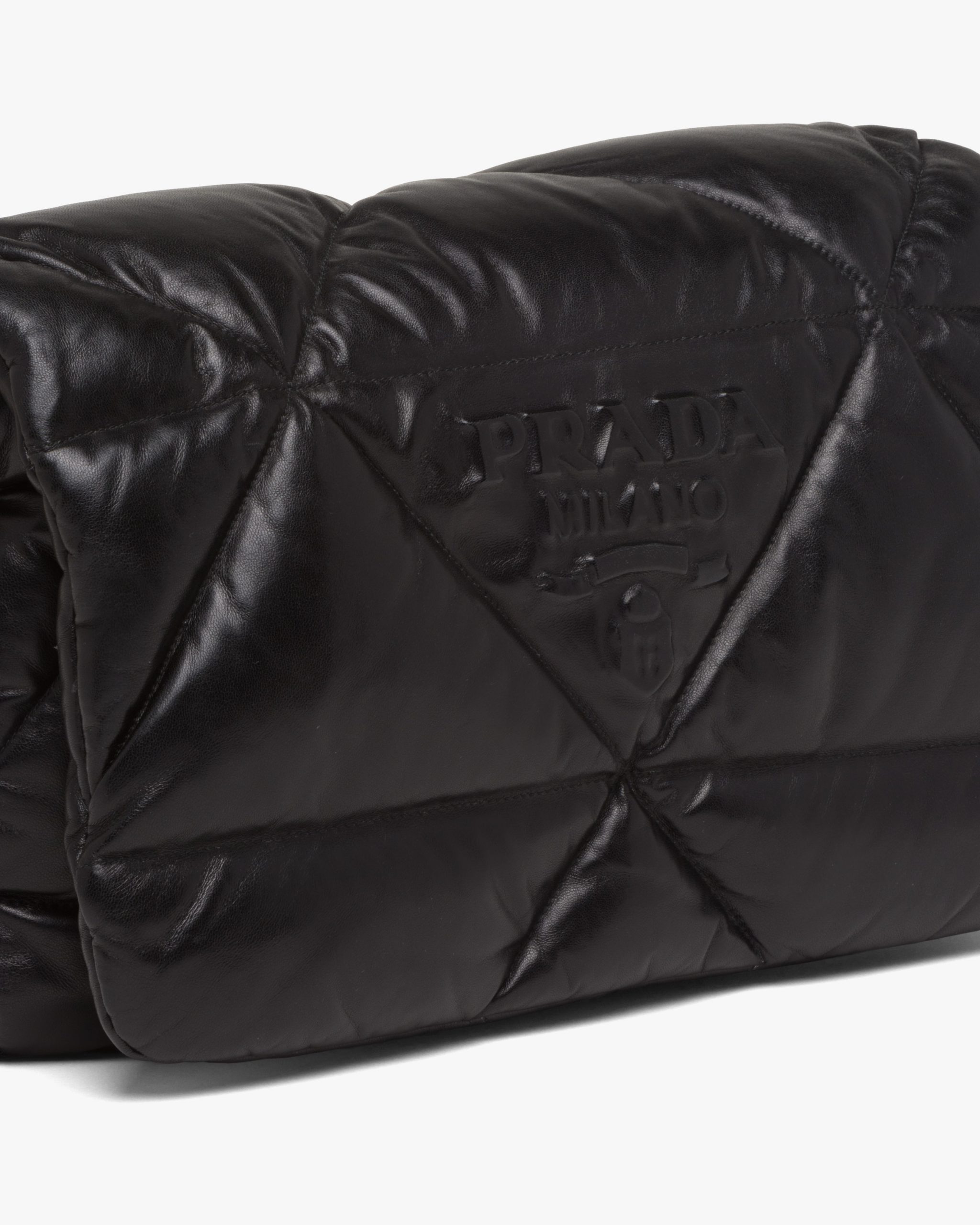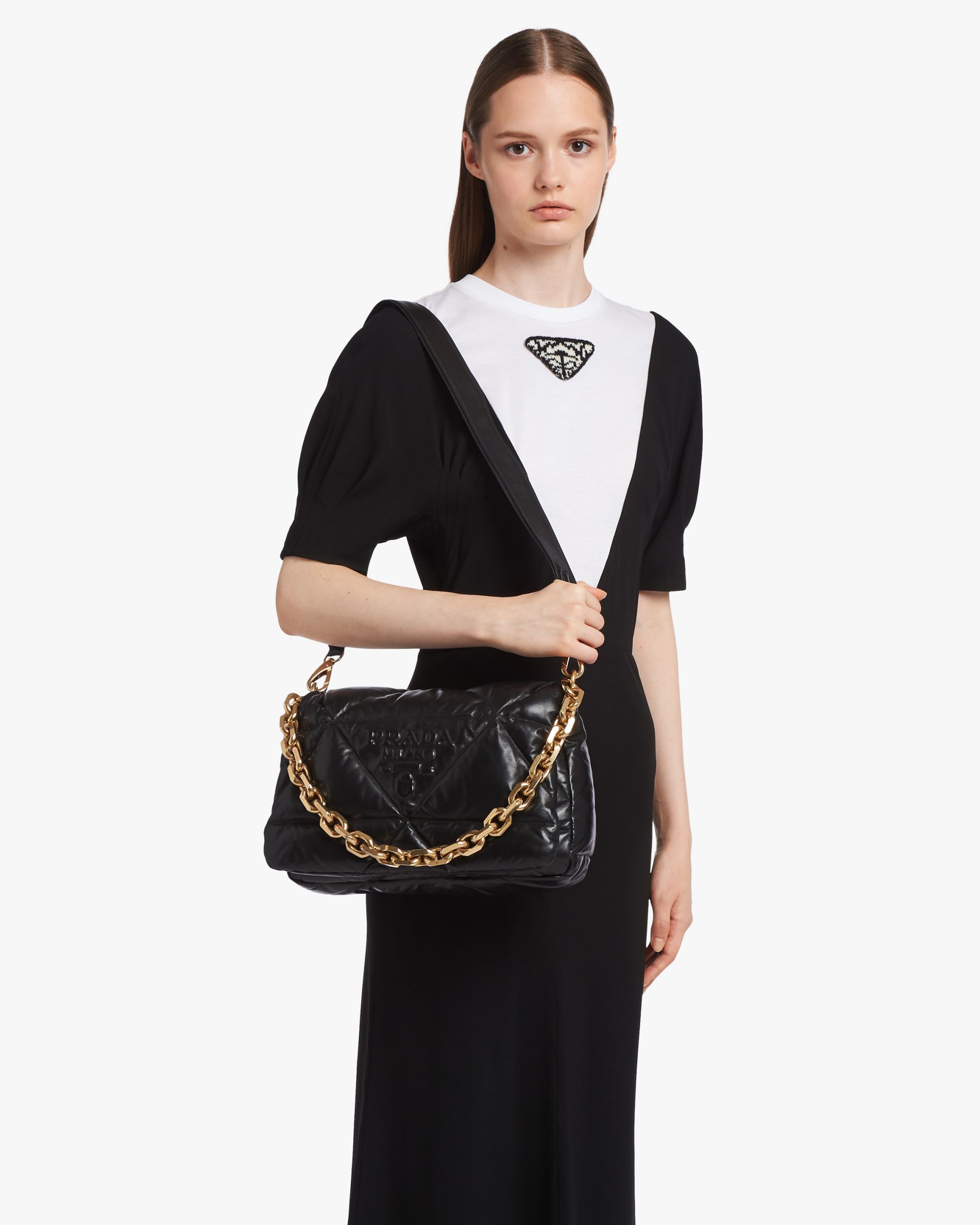 Reinterpreted in always new ways, Prada’s iconic triangle is repeated in the quilted motif of this soft padded nappa leather bag to create a patchwork motif. The chain handle is decorated with the engraved lettering logo.