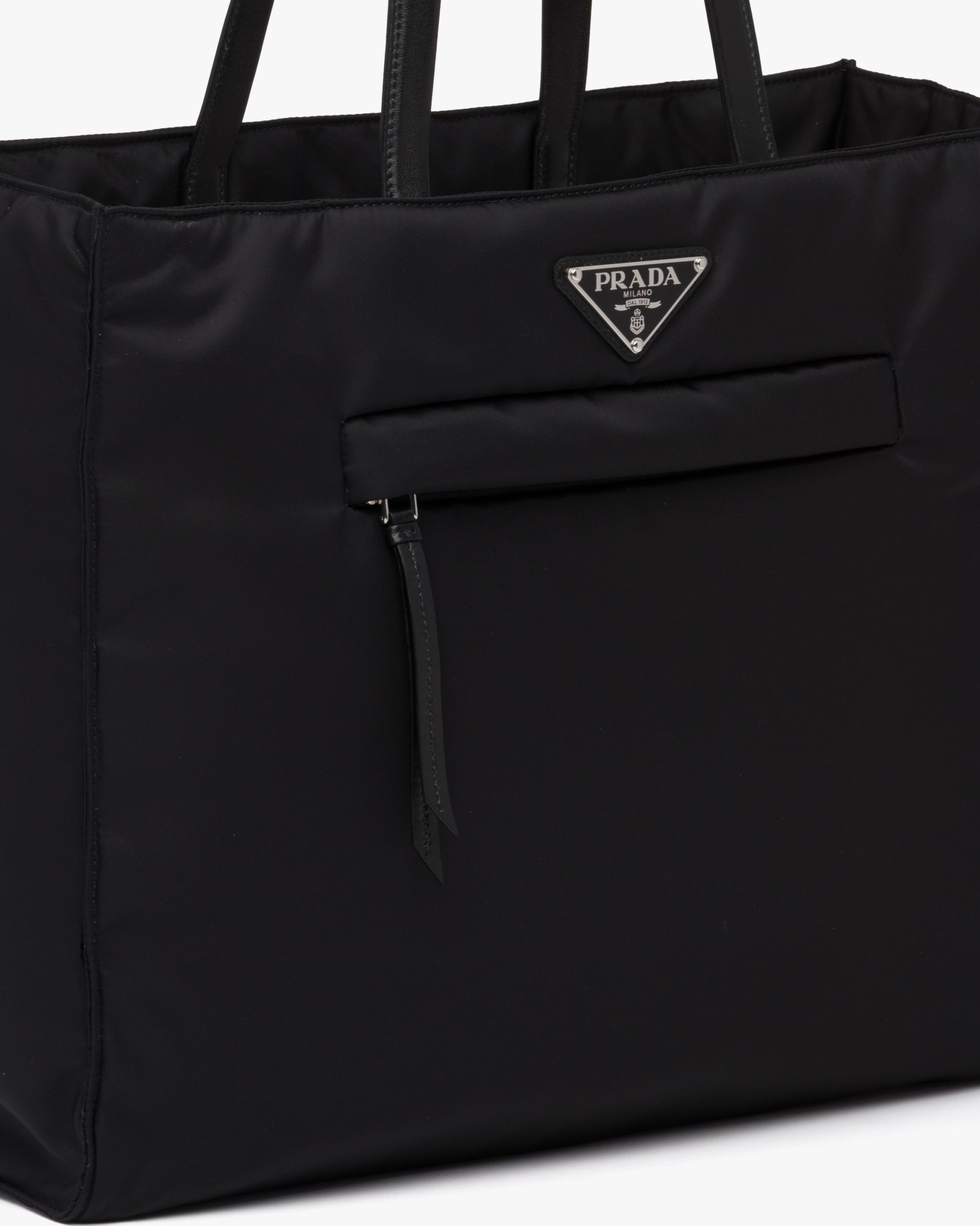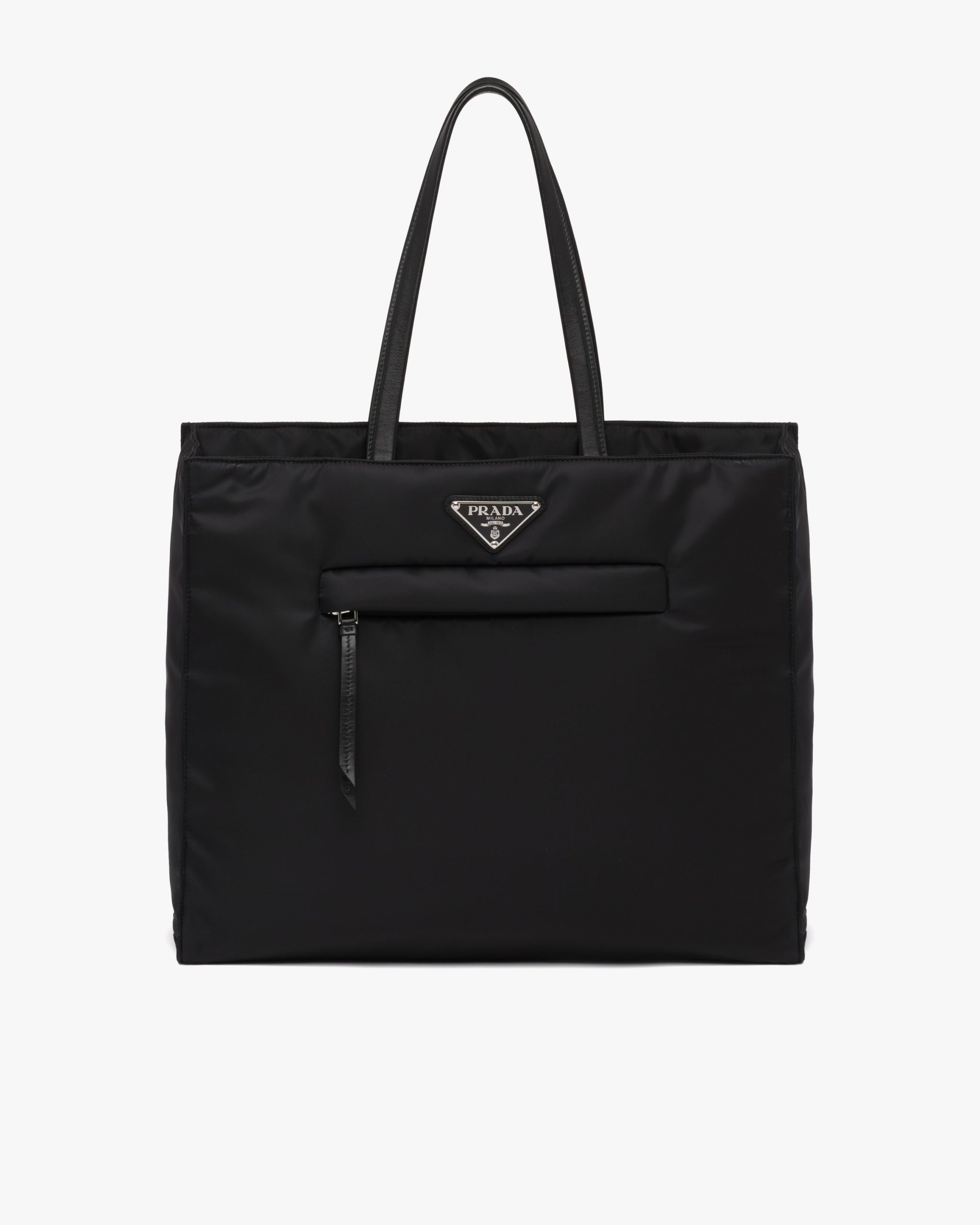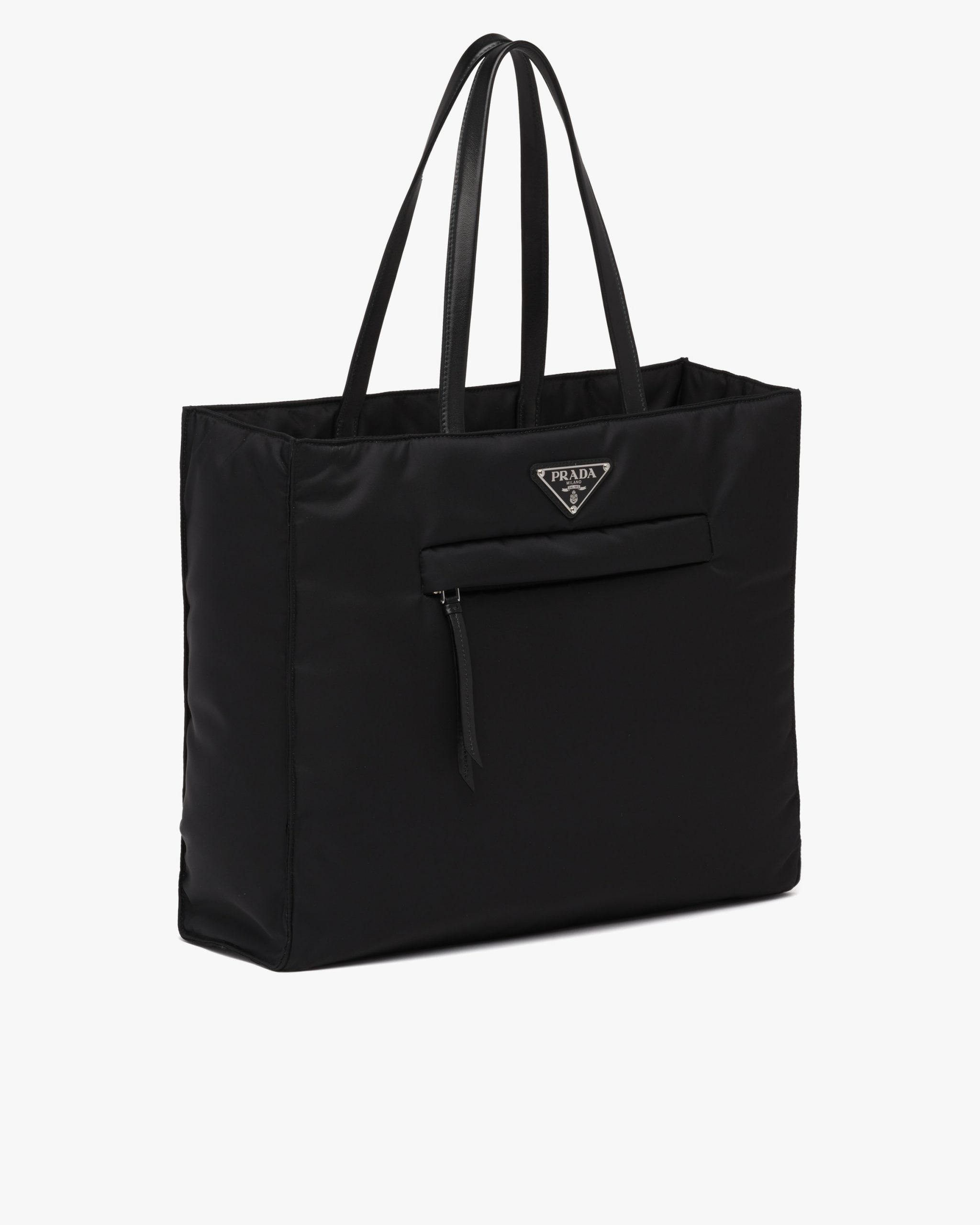 This padded tote bag with a sleek, geometric design is made of innovative recycled Re-Nylon, the sustainable evolution of Prada’s iconic industrial fabric. Narrow nappa leather handles accent the design featuring the enameled metal triangle logo and a practical front zipper pocket.