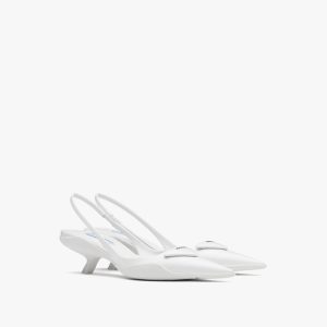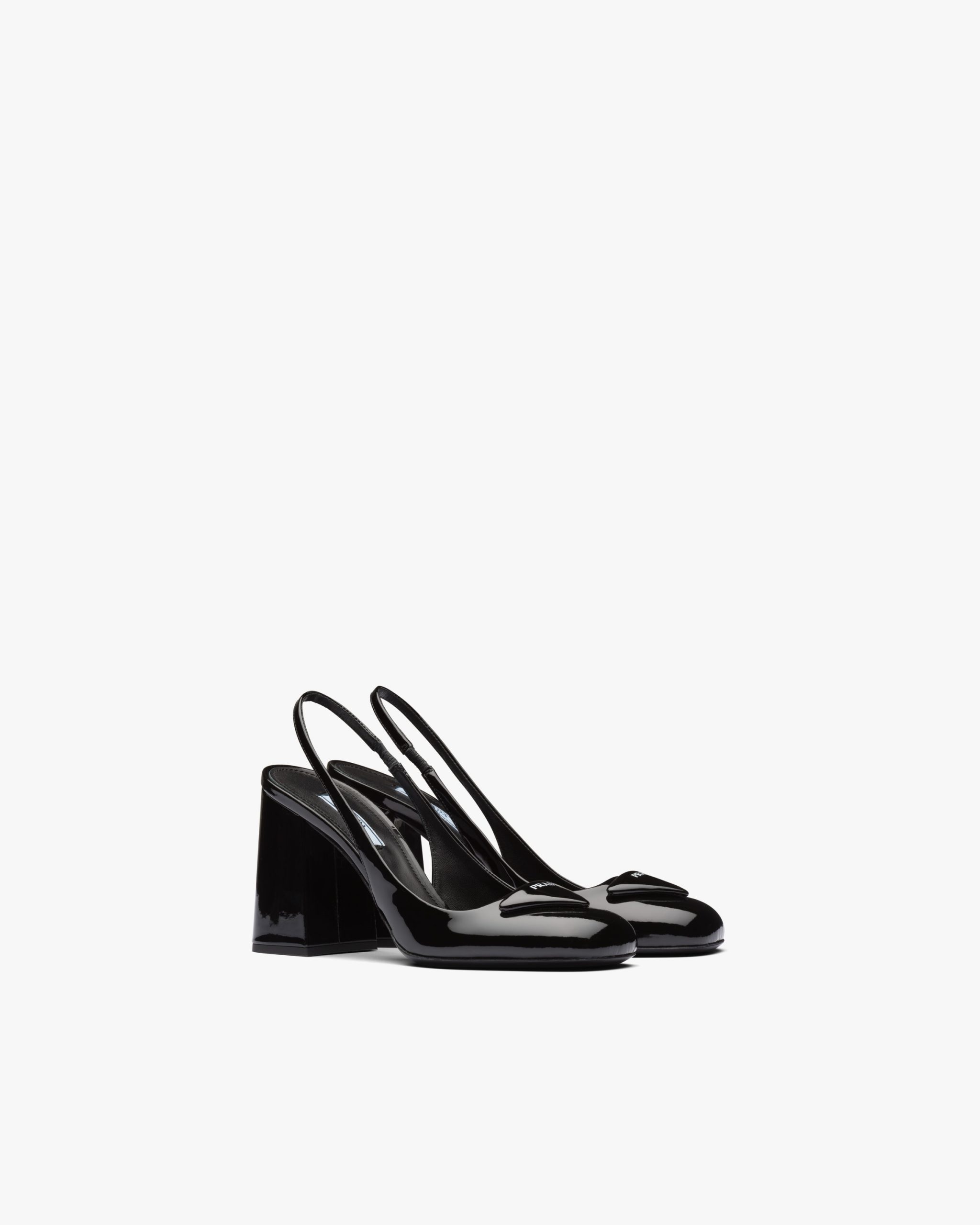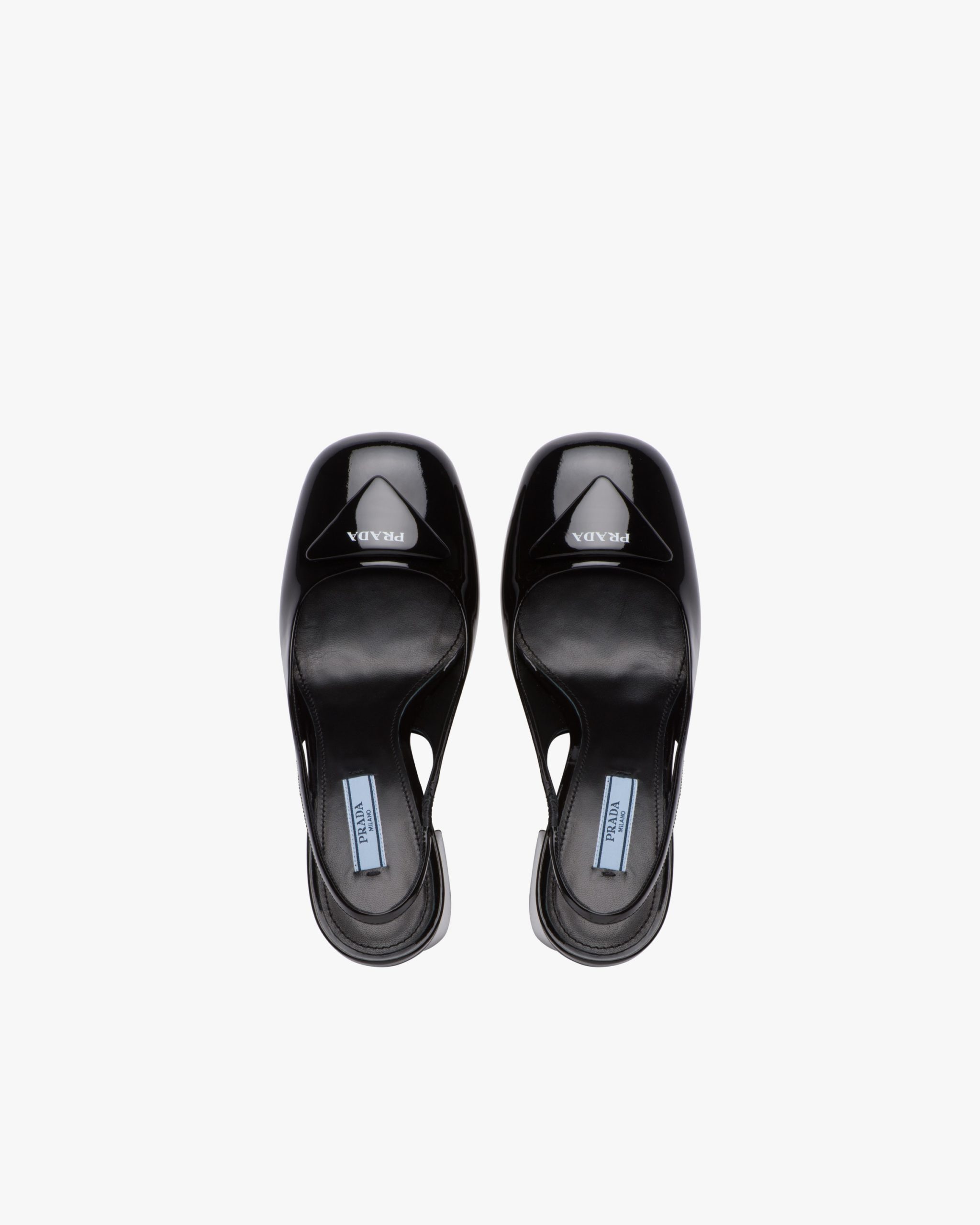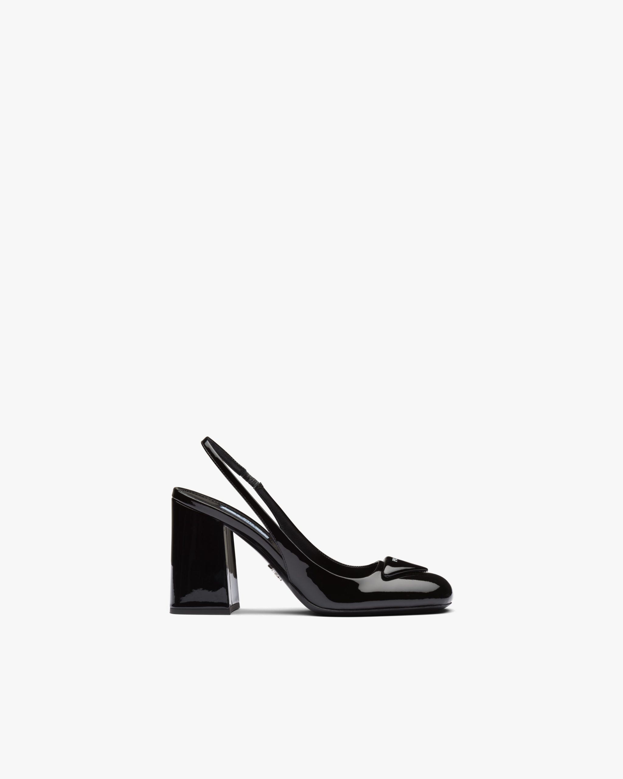A new variation transforms the brand’s iconic triangle into a slightly padded leather detail and is accented with the screen-printed Prada logo. The geometric element decorates the toe of these patent leather slingback pumps characterized by a sophisticated silhouette and elegant charm.
