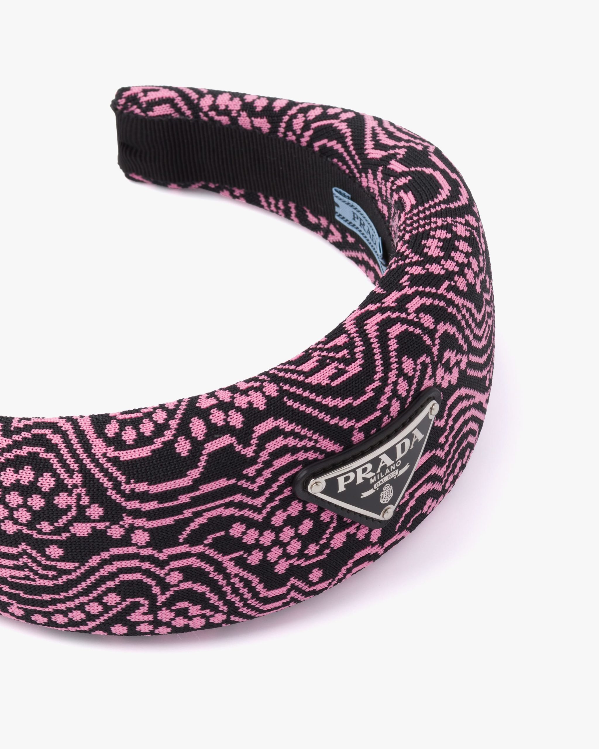 Geometric jacquard patterns that evoke sixties design animate the volumes of this puffy headband characterized by its fine workmanship. A sophisticated and emblematic accessory of Prada collectsions, it is decorated with the iconic triangle logo.