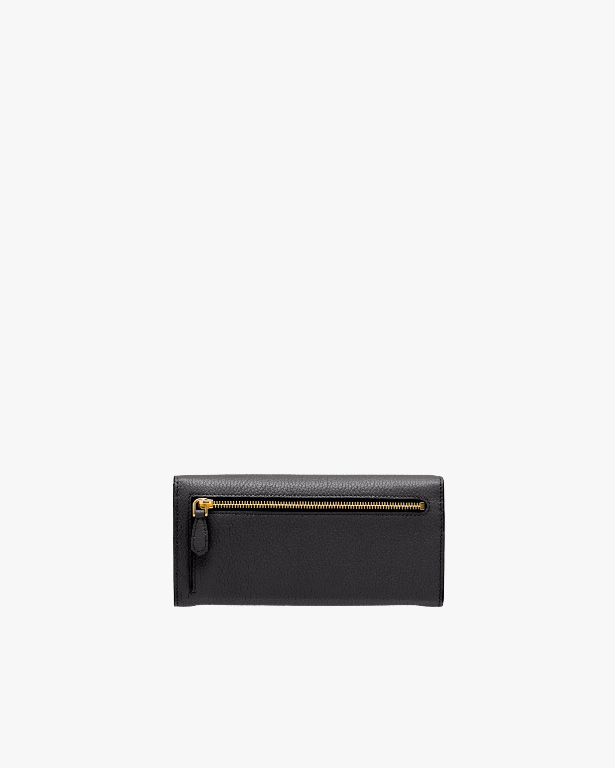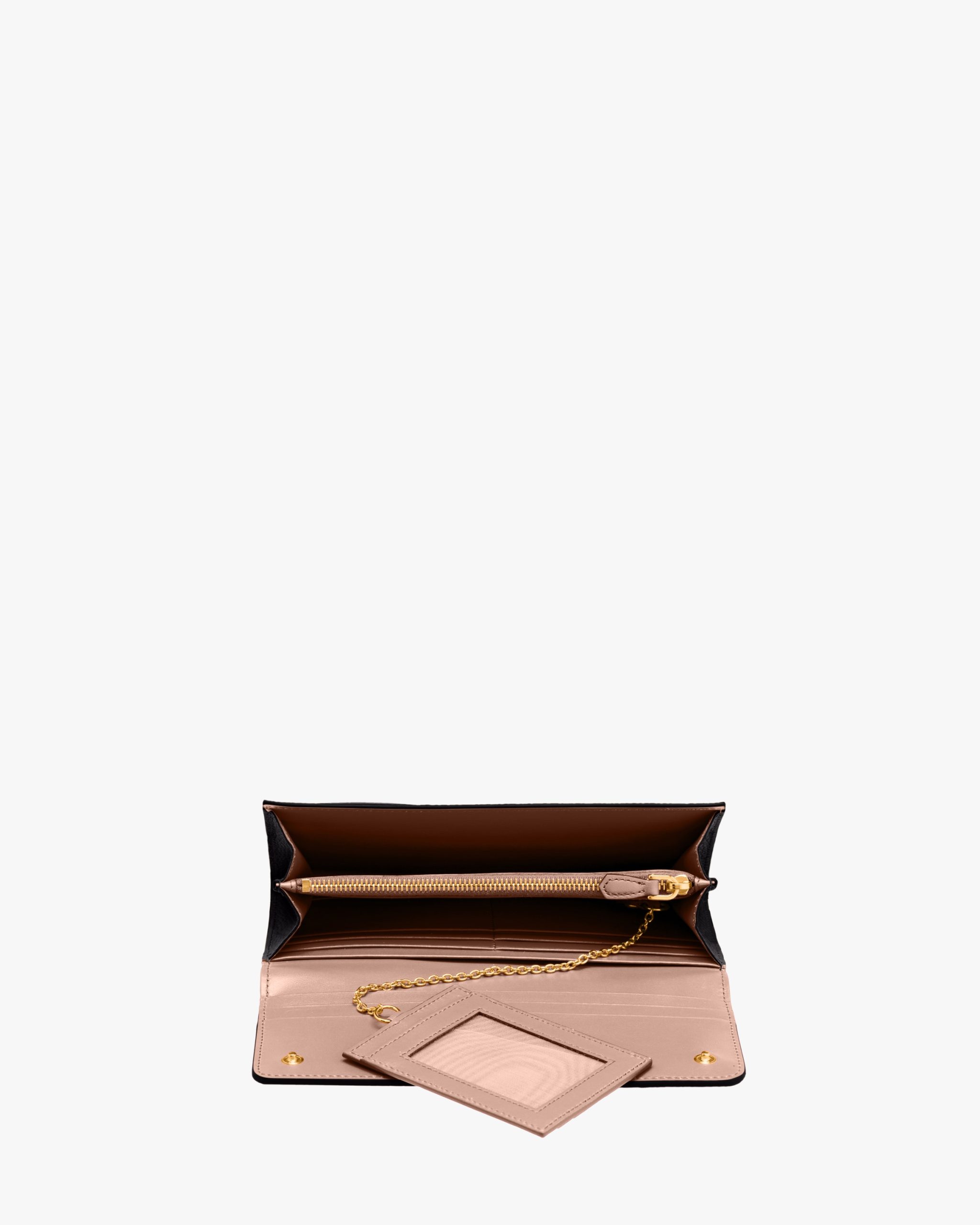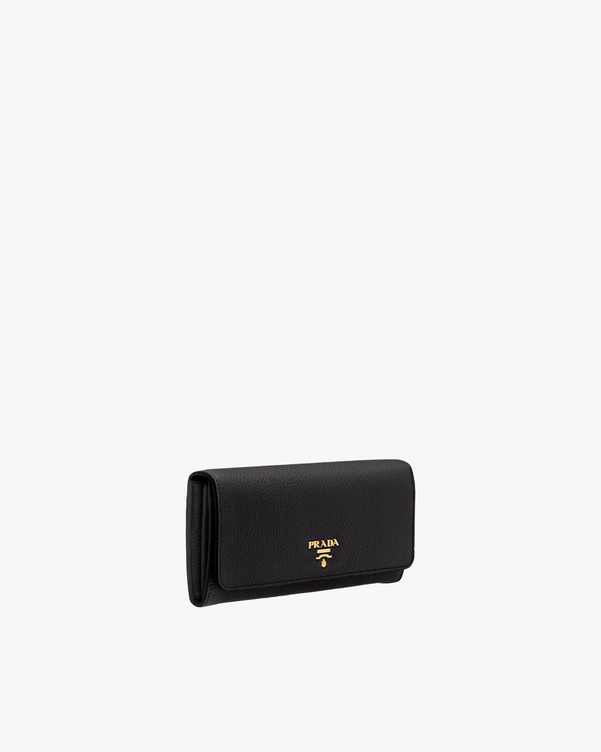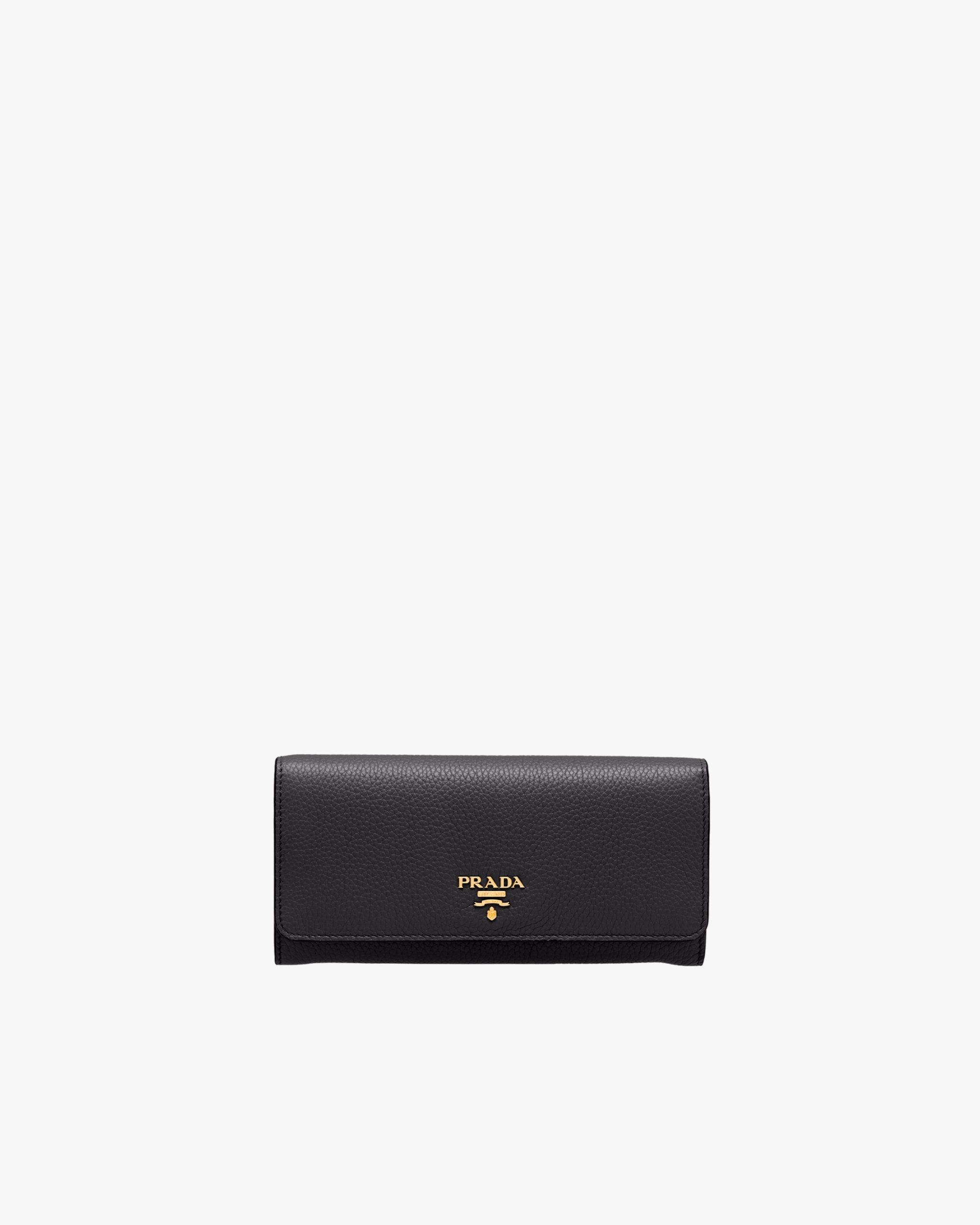 This flap wallet features lining in a contrasting color. The inside contains pockets, compartments and slots, as well as an extractable badge holder, while the outside is embellished with gold-toned Prada lettering.
