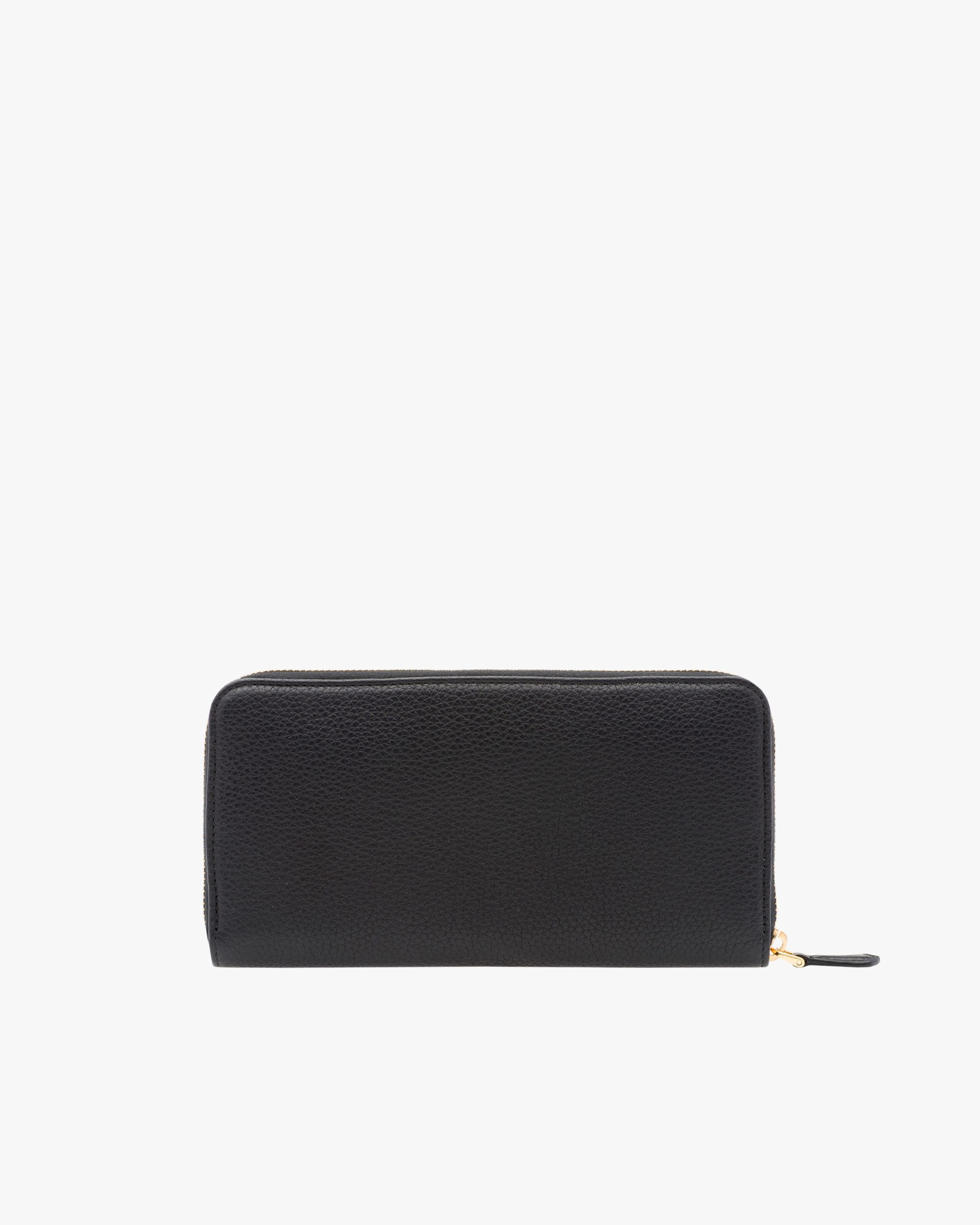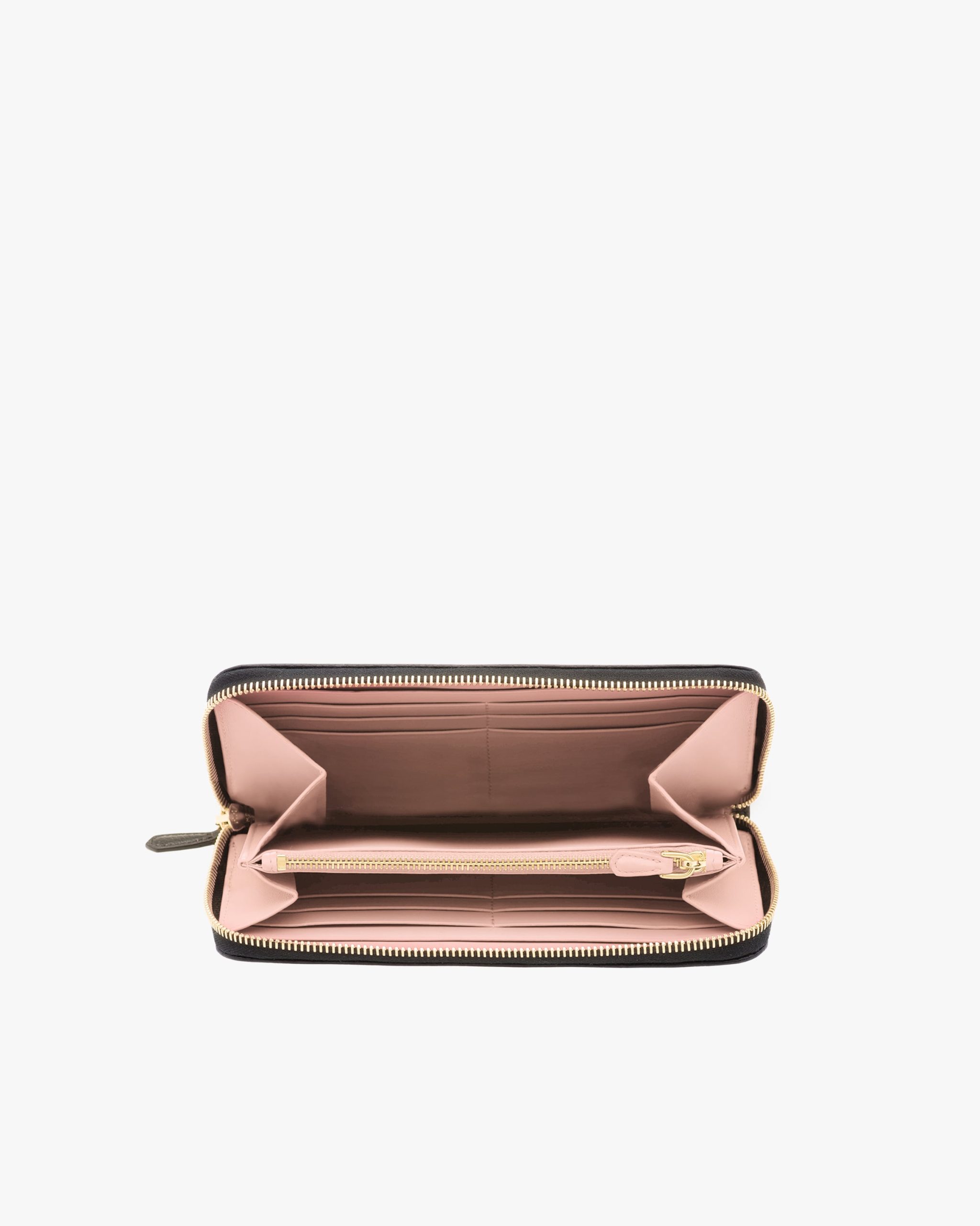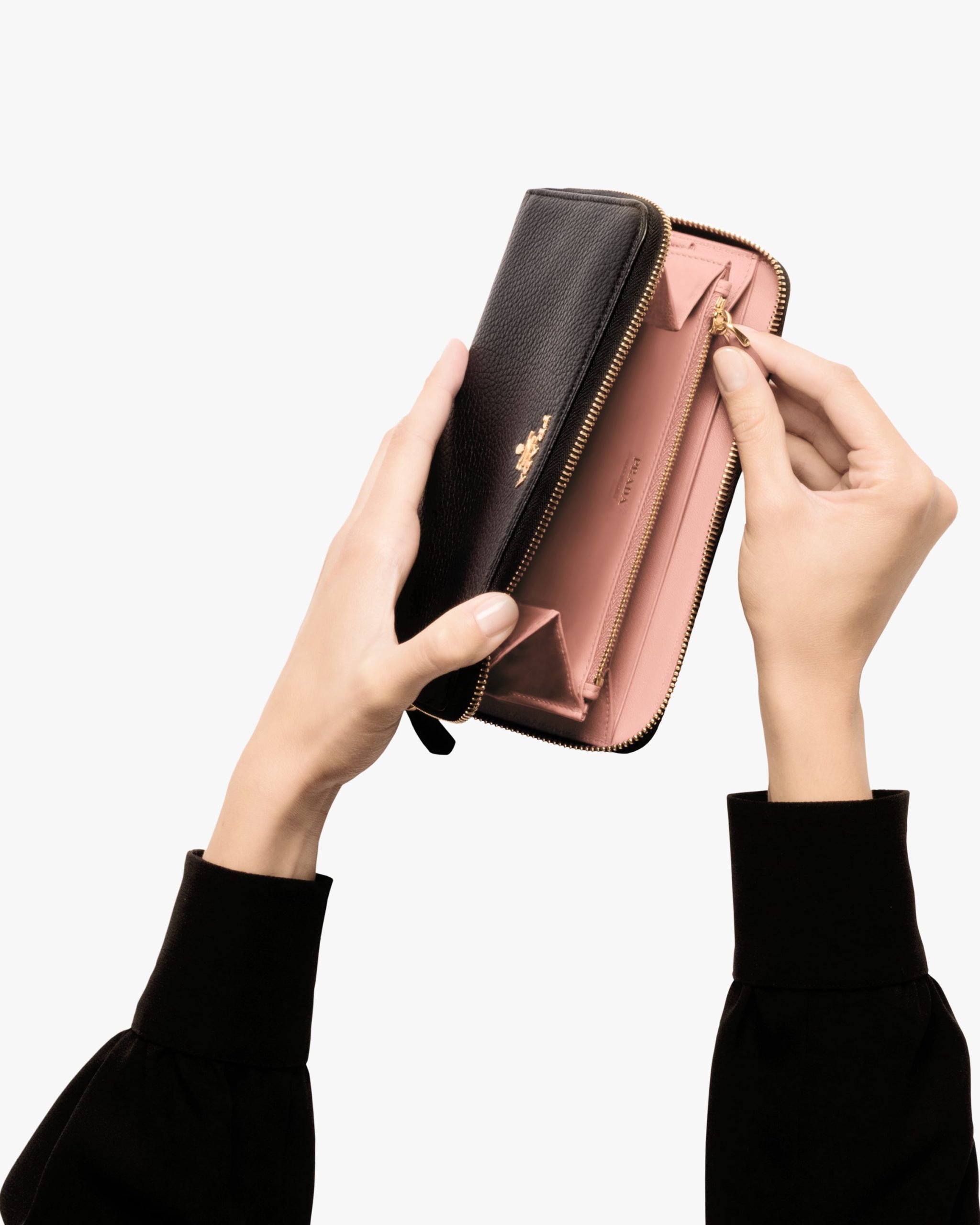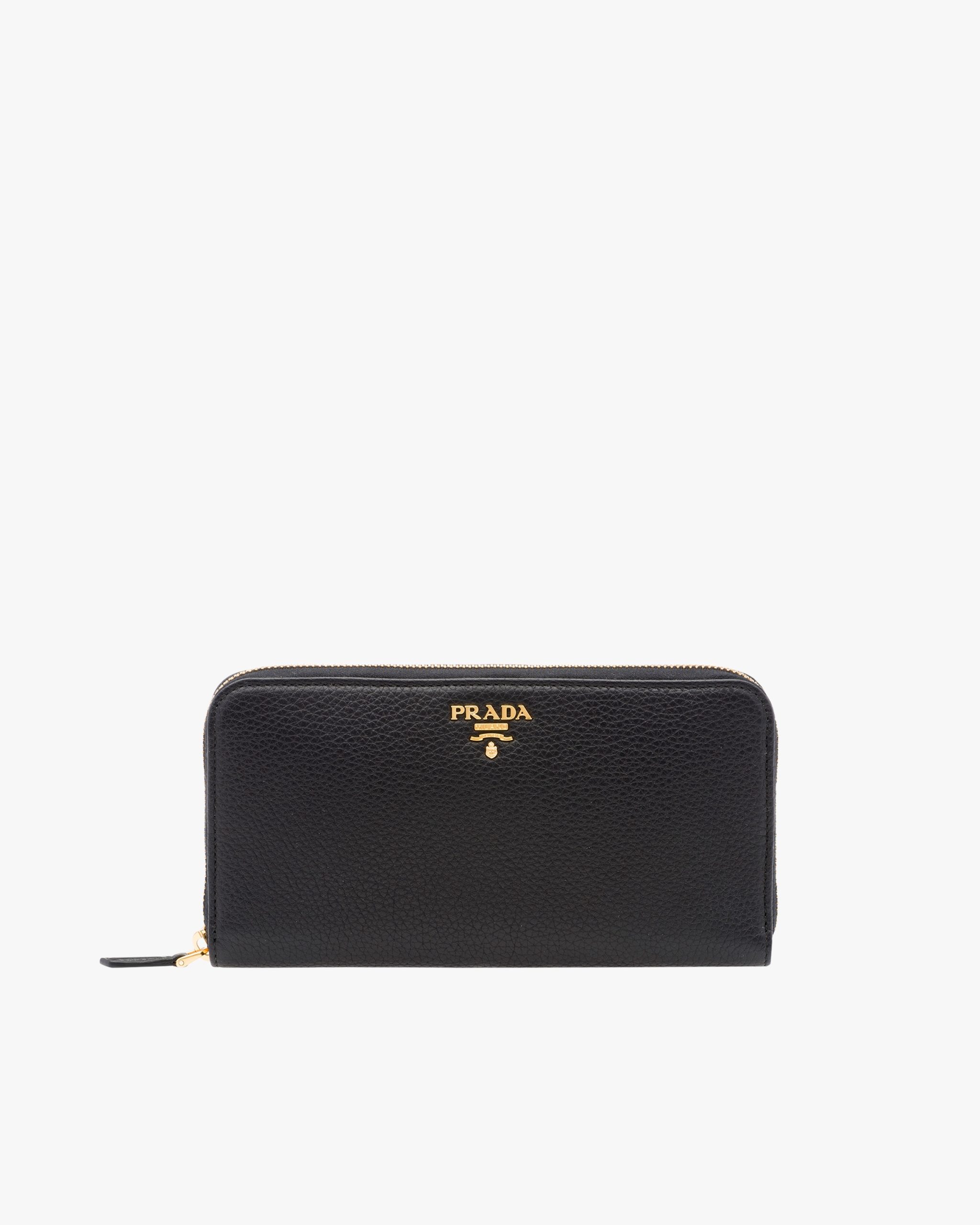 This zip-around calf leather wallet is defined by its contrasting color lining. Inside are various compartments, pockets and slots, and the outside is decorated with gold-toned Prada lettering.