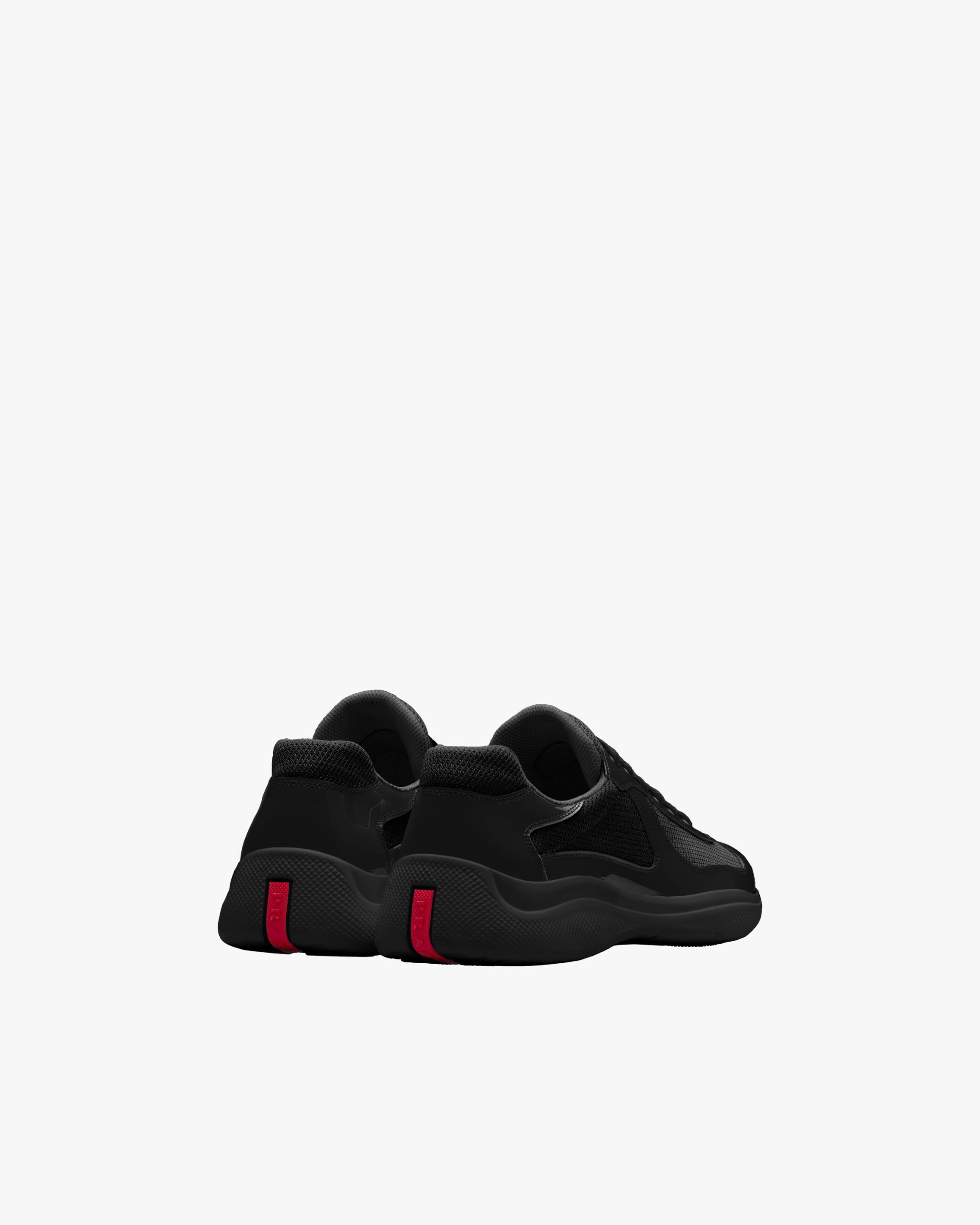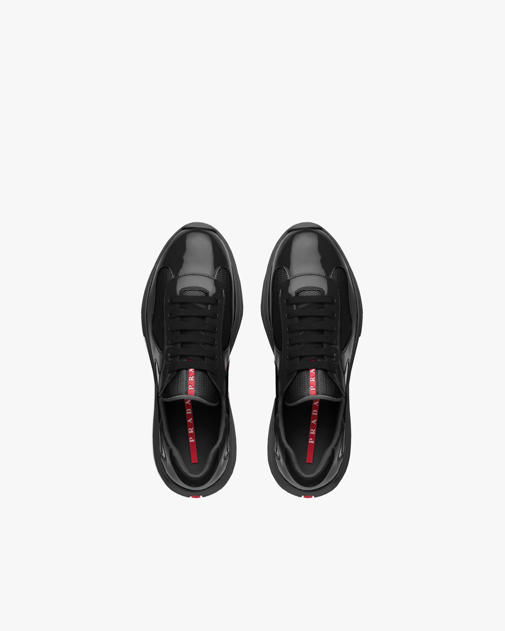 These patent leather sneakers with bike fabric inserts are inspired by an iconic aesthetic. The unmistakable Prada Linea Rossa logo on the tongue and sole enhances the design.