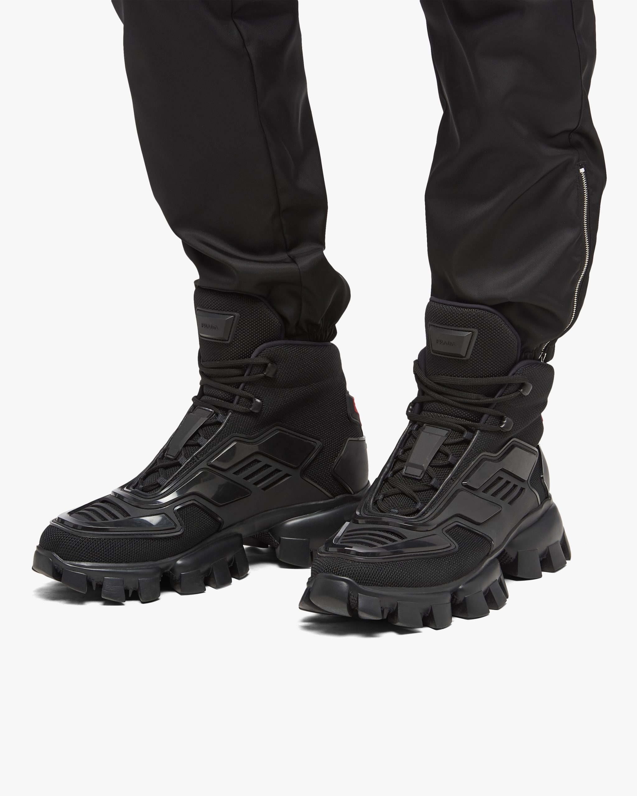 These Cloudbust Thunder sneakers, one of Prada’s iconic styles, have a complex, sculptural design. The knit fabric shoe is characterized by the voluminous light rubber sole animated by a three-dimensional design.
