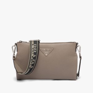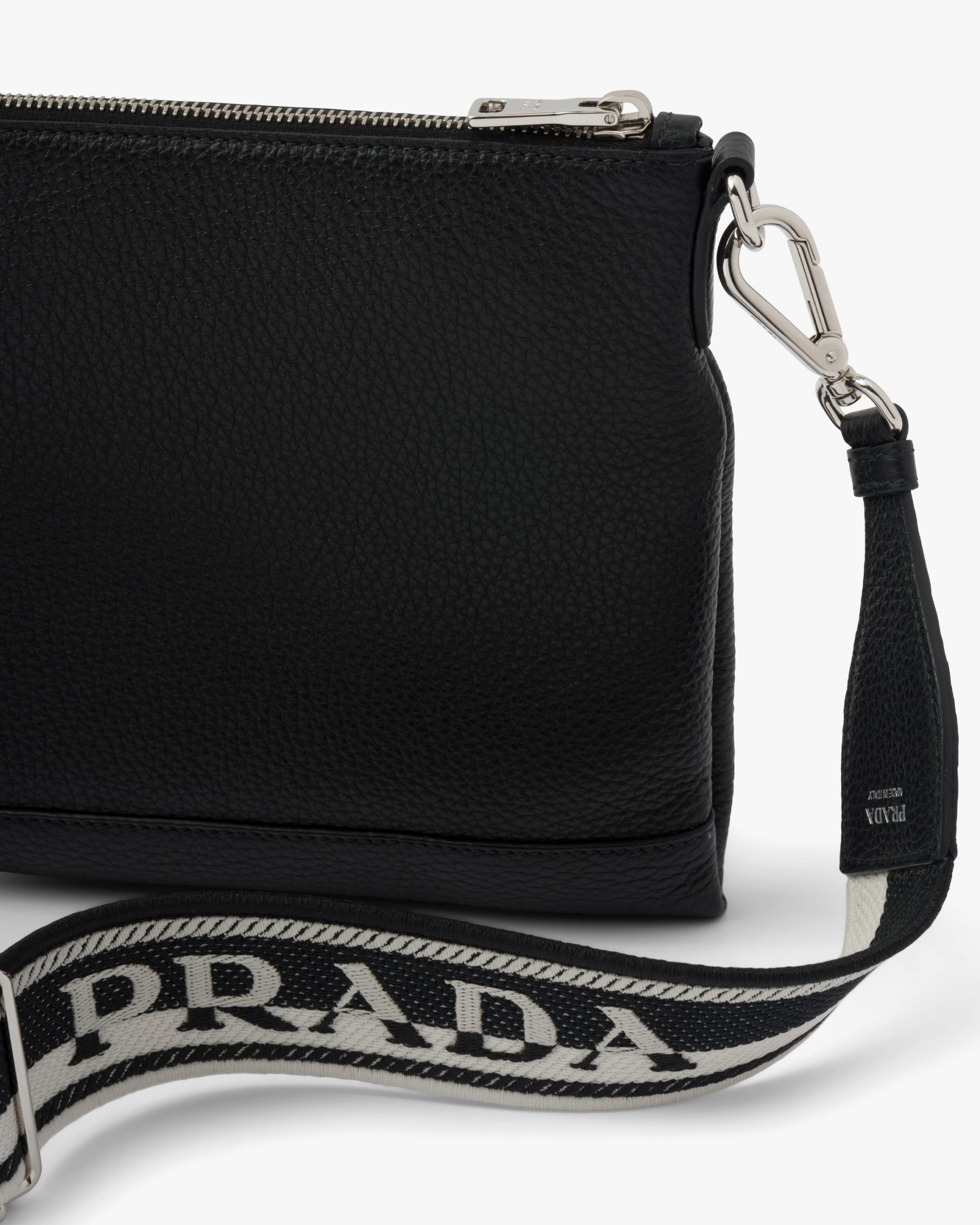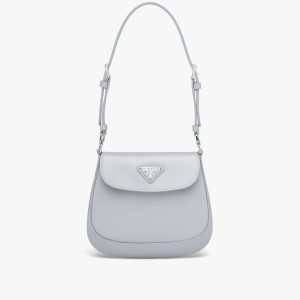 A geometric minimalist shape characterizes this Prada Flou small leather bag illuminated with the metal lettering logo on the front. The accessory is completed by the detachable woven tape shoulder strap embroidered with the logo in a contrasting color, that makes it wearable as a crossbody or shoulder bag.