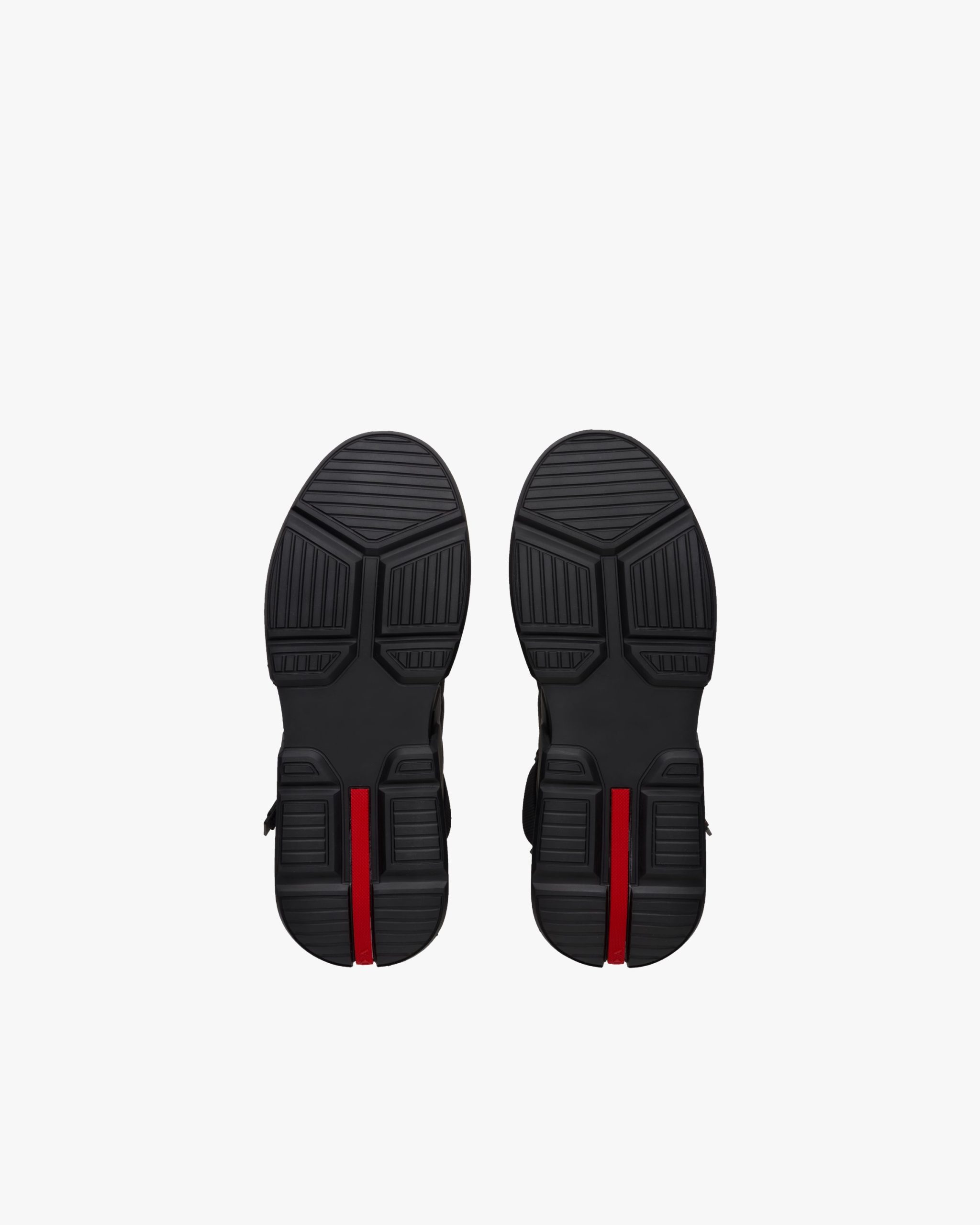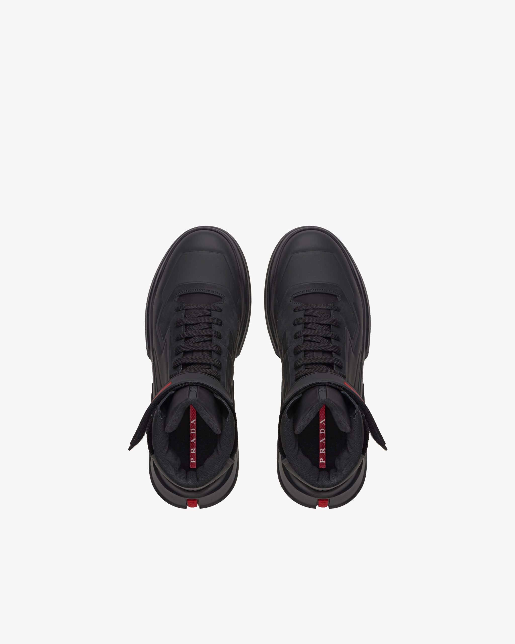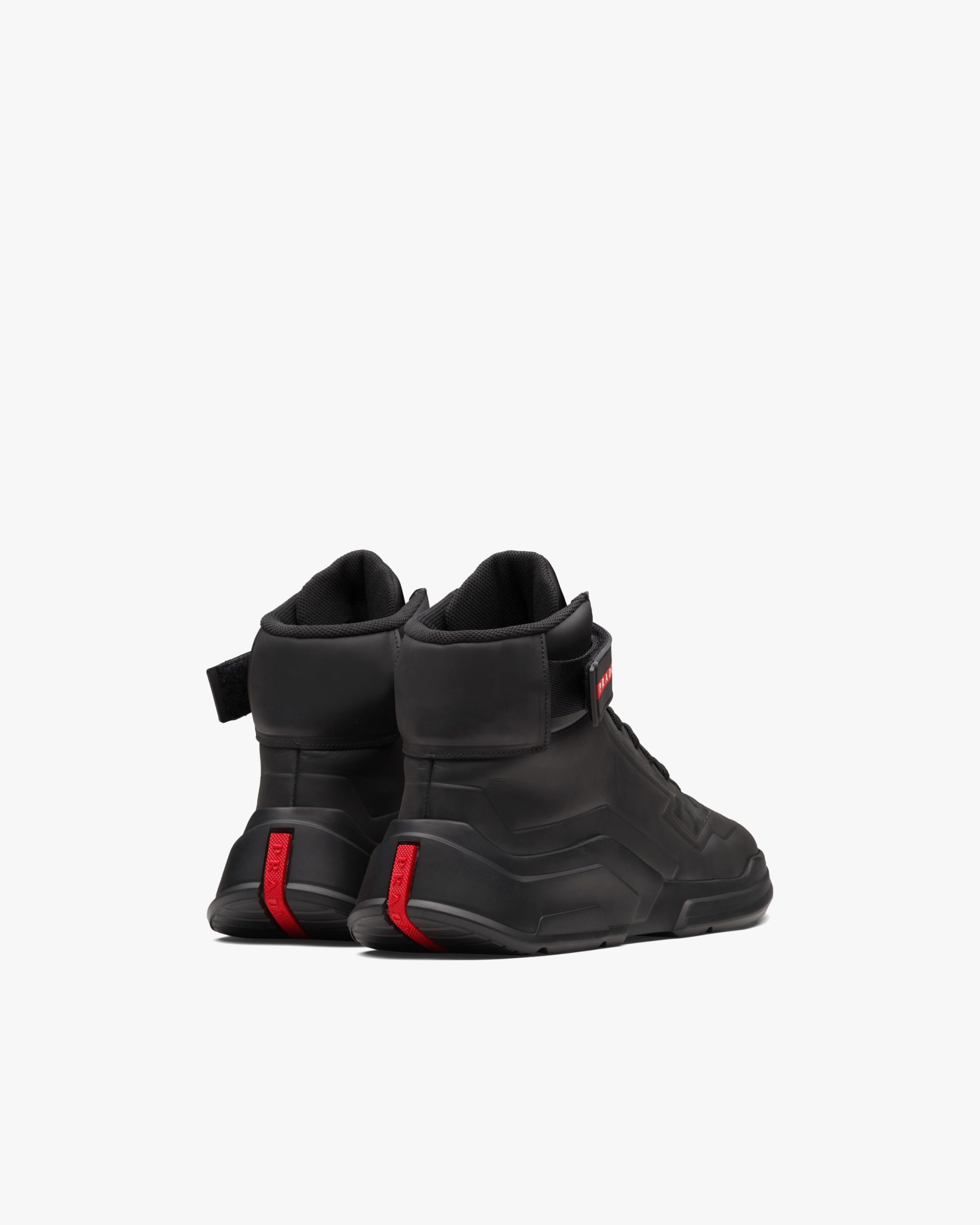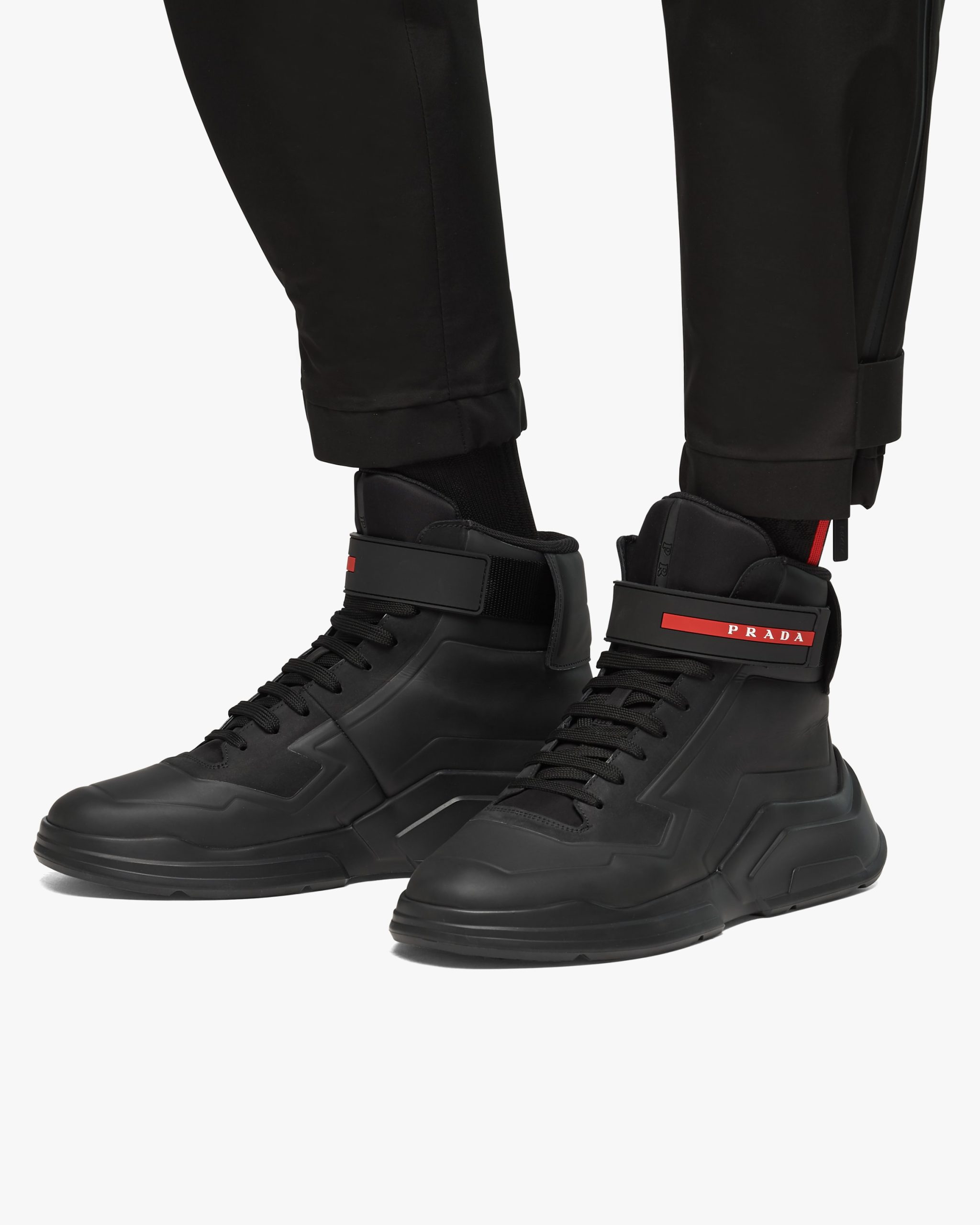 These leather high-top sneakers characterized by the hook and loop fastener strap with Prada Linea Rossa logo have a futuristic design.