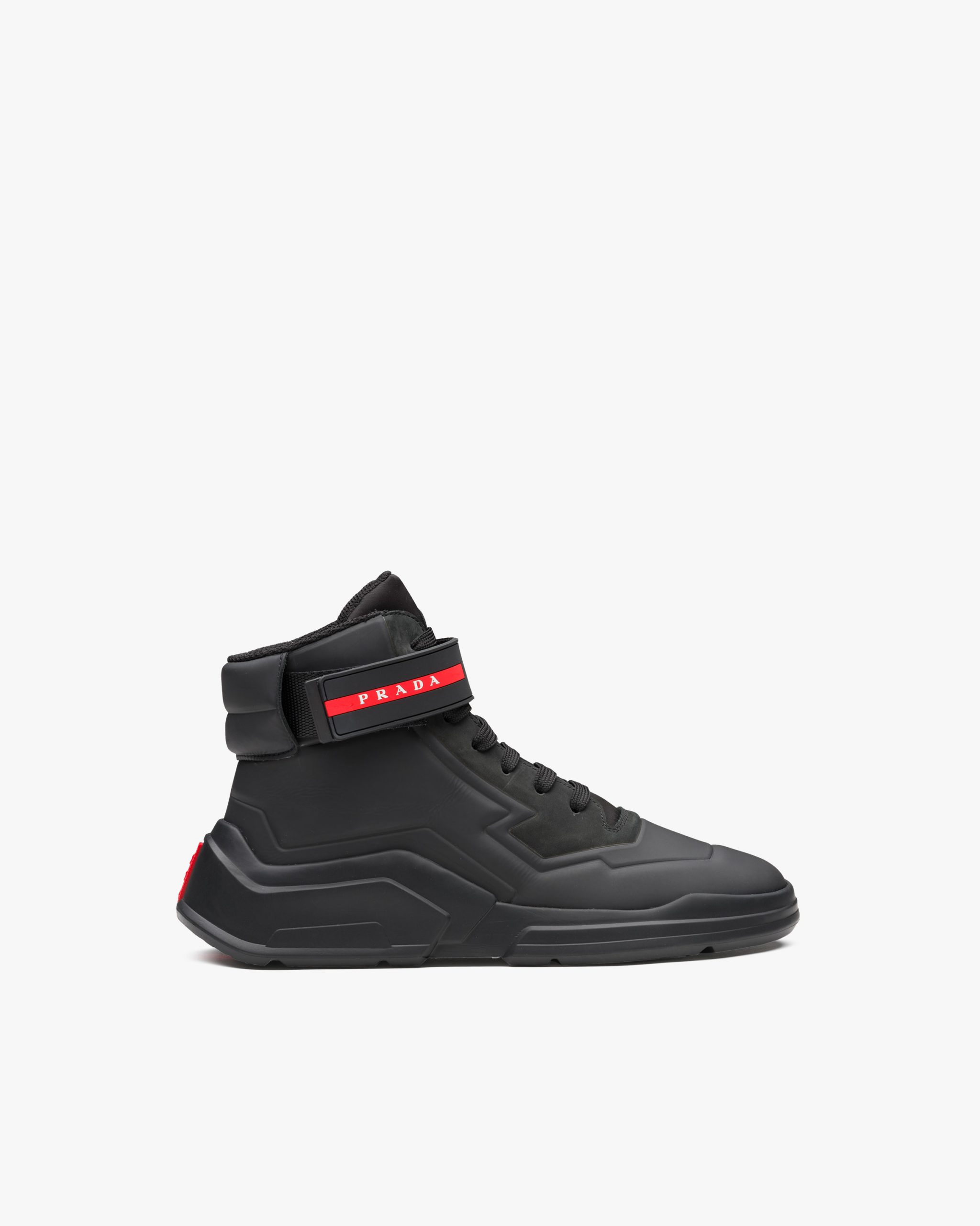 These leather high-top sneakers characterized by the hook and loop fastener strap with Prada Linea Rossa logo have a futuristic design.