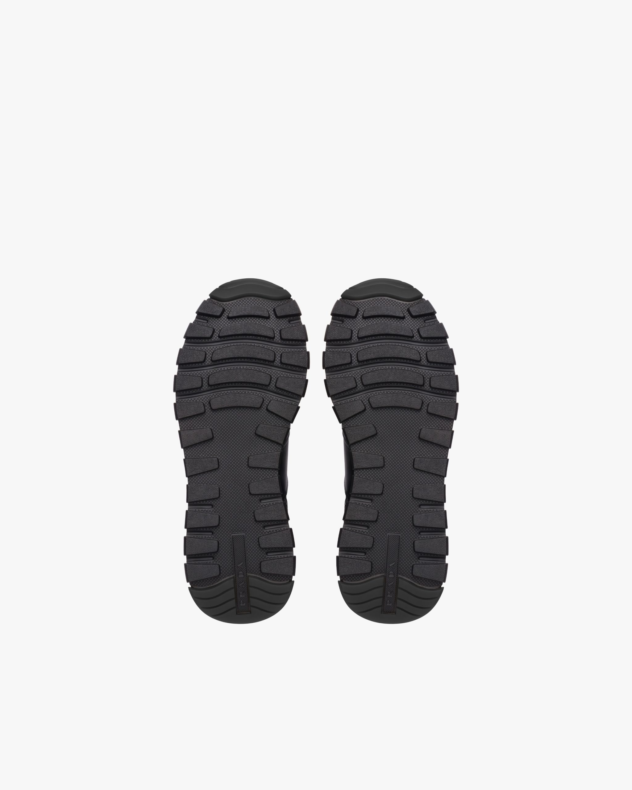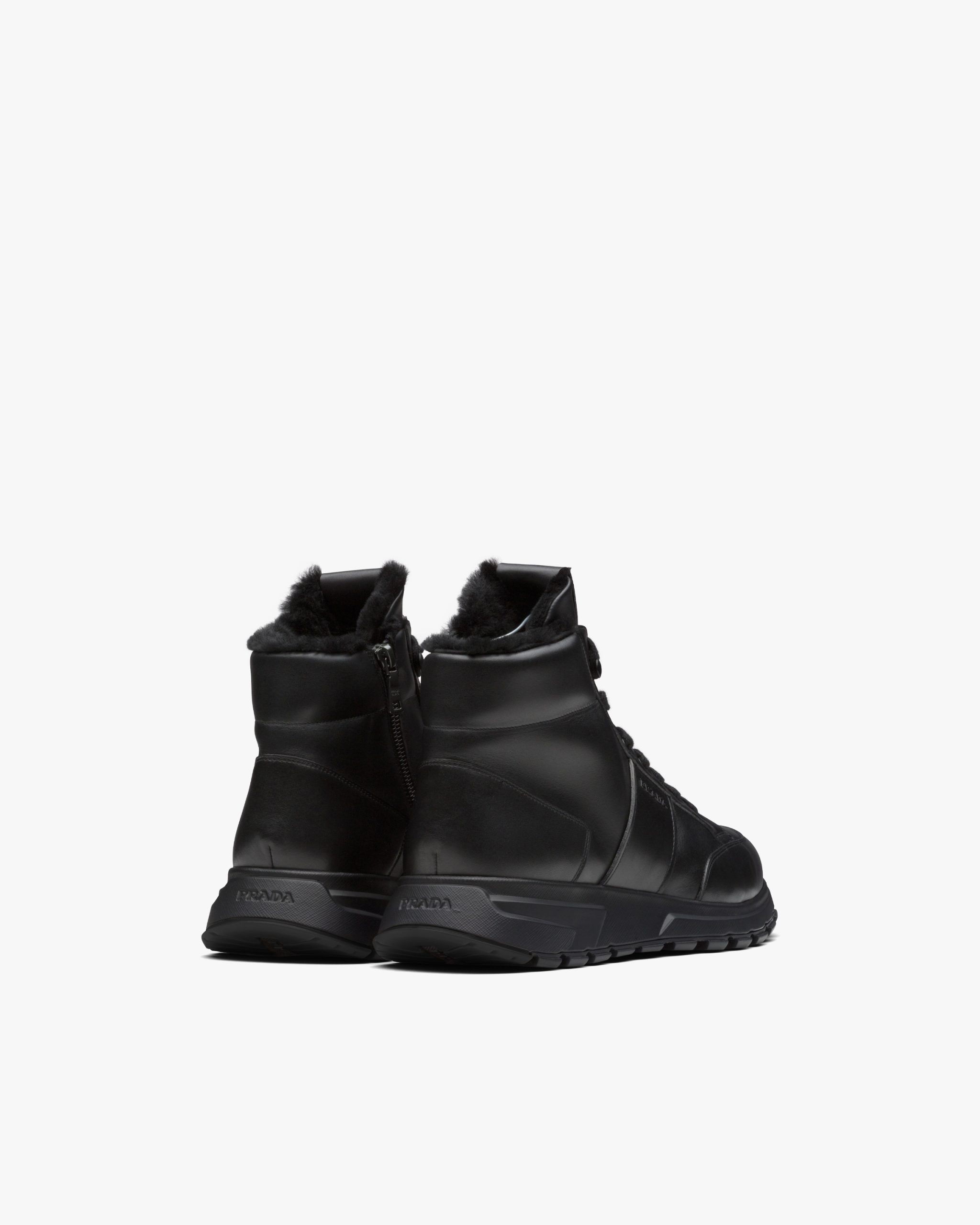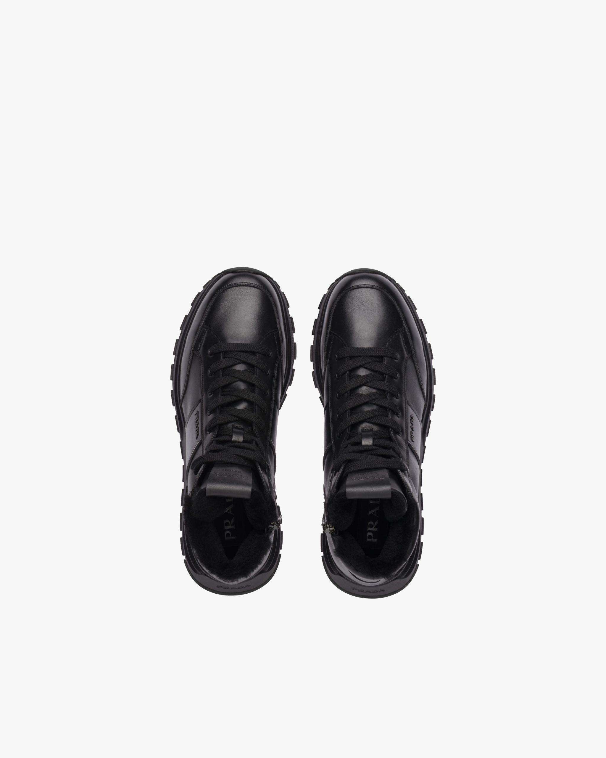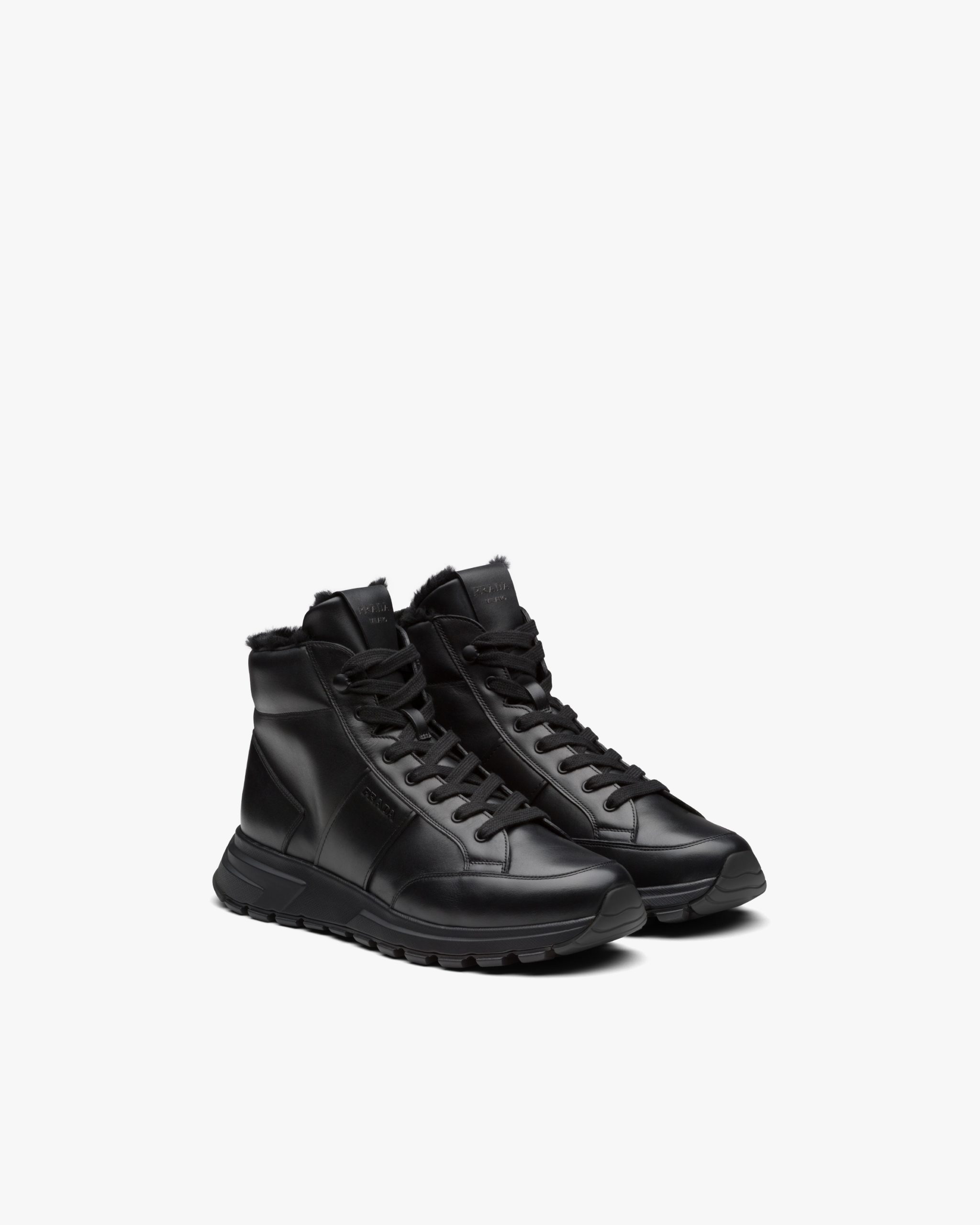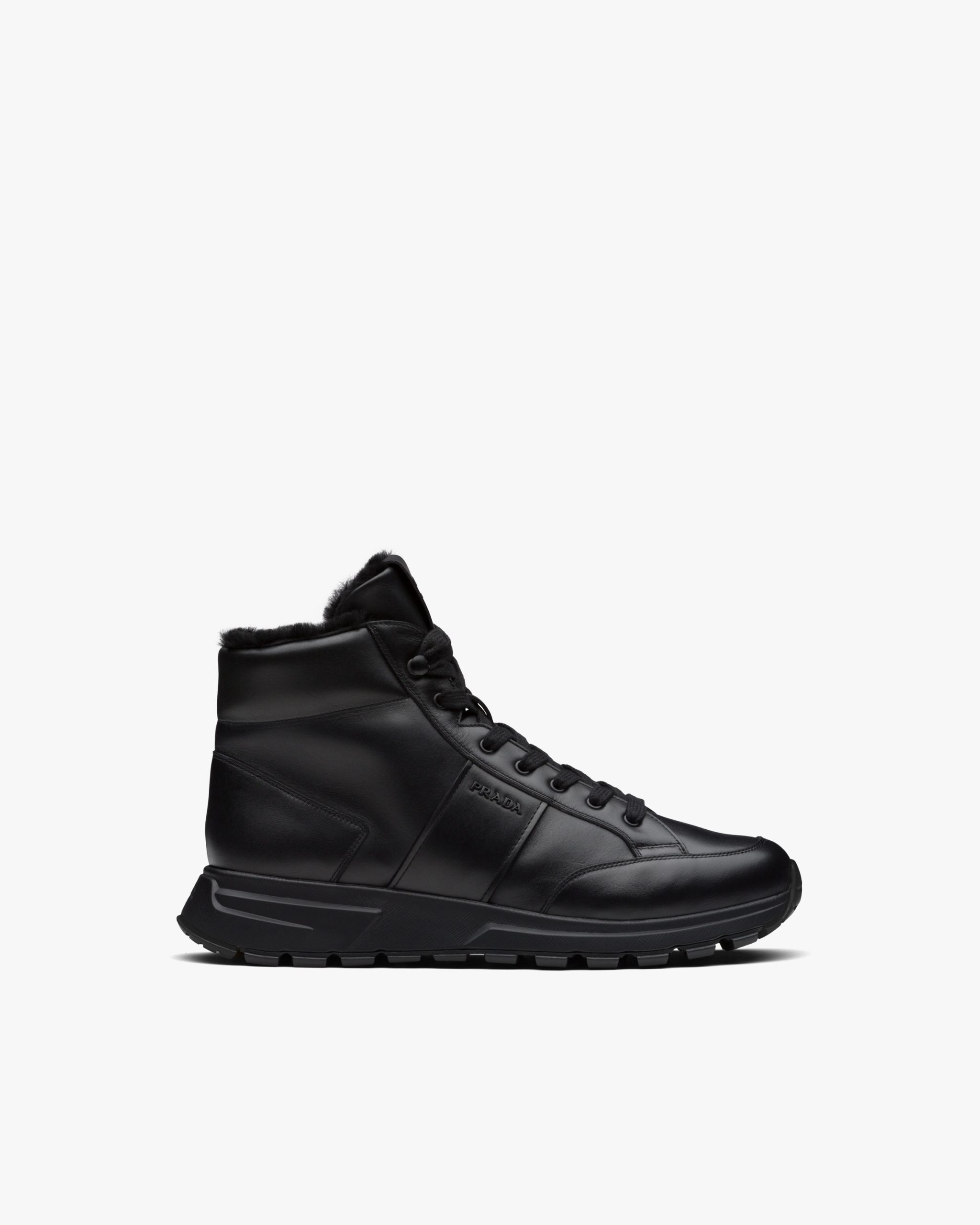Prada PRAX 01 sneakers combine an elegant yet innovative design with typical elements of Prada collectsions. These shearling-lined leather high-tops are accented with the enameled metal logo that decorates the upper, contrasted by a thick sole with rubber lug tread.