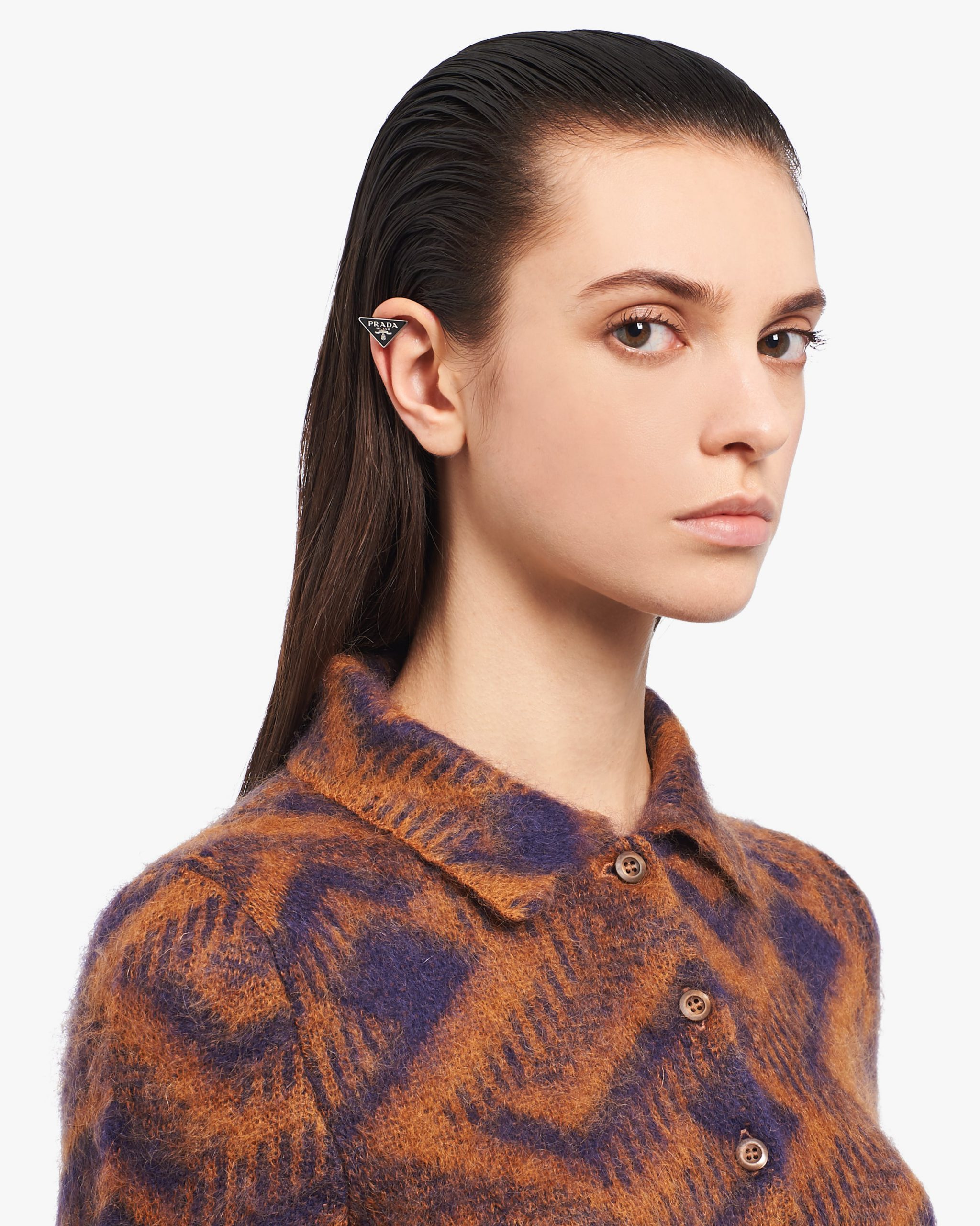 The sleek, iconic triangle logo is the protagonist of a new jewelry line made of 925 sterling silver that reinterprets punk influences in a modern way. Prada’s historic code with an enamel finish defines this single clip earring.
