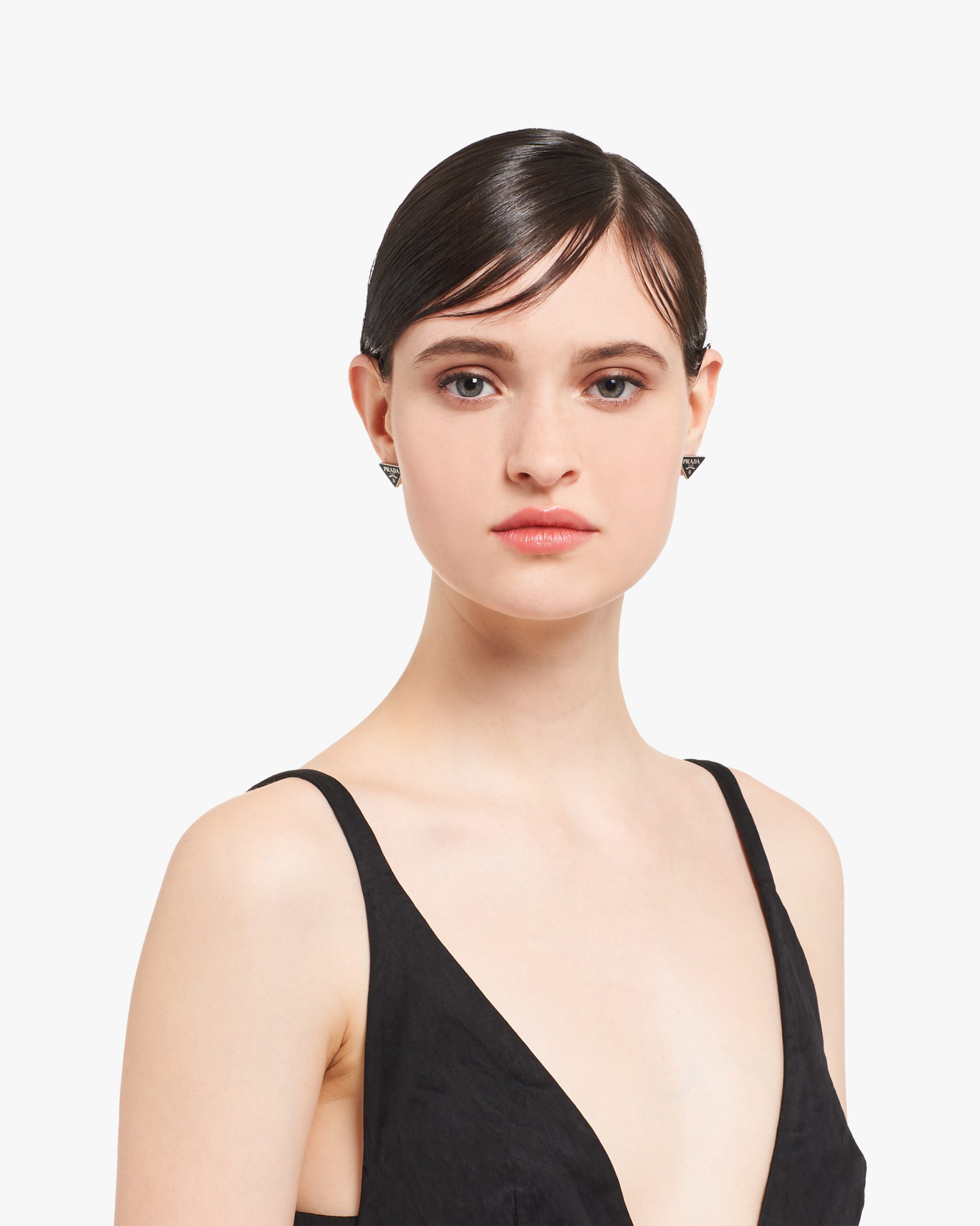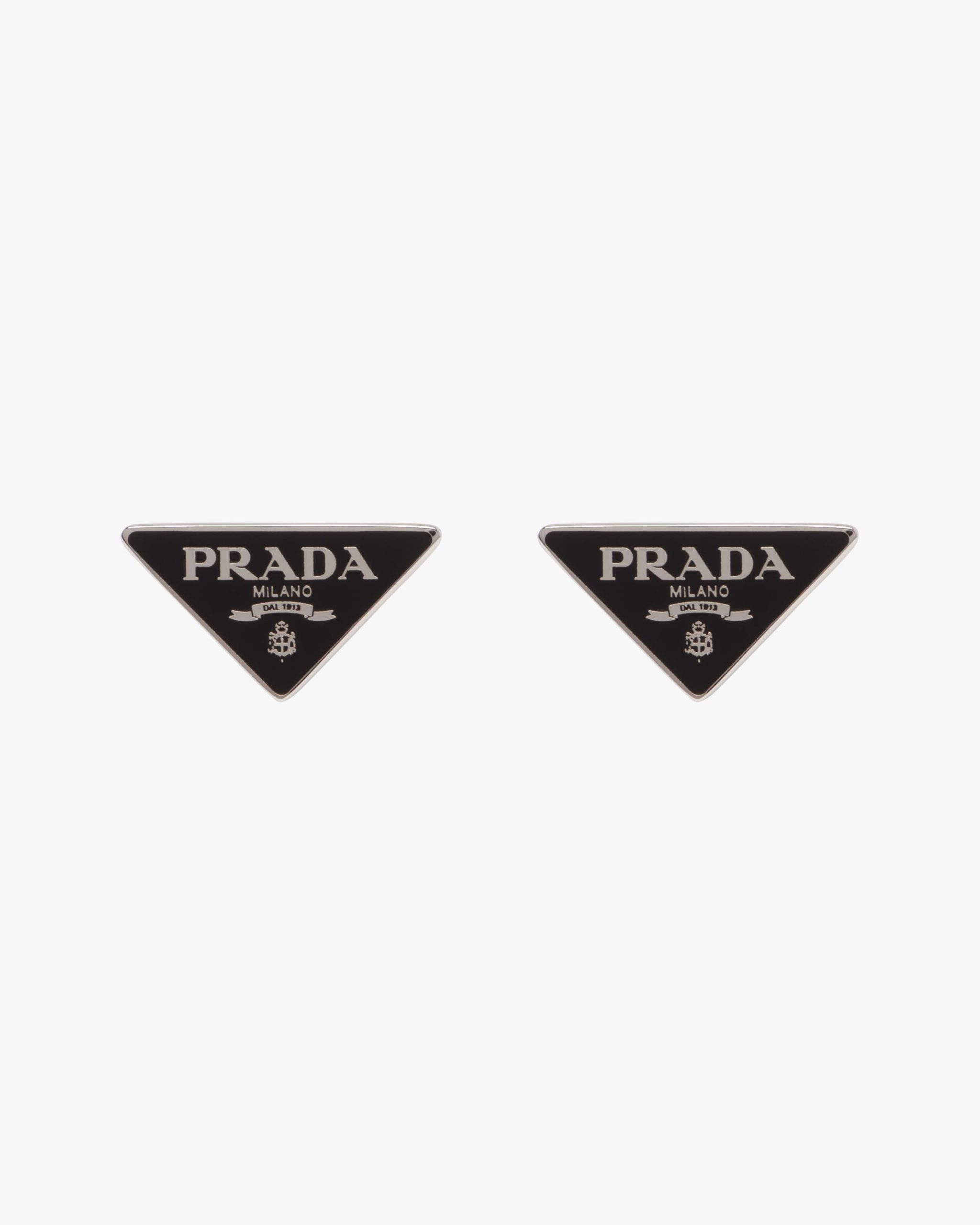 Prada’s historic symbol decorated with enamel defines this pair of earrings. Iconic and sleek, the triangle logo is the protagonist of a new line of jewelry made of 925 sterling silver that reinterprets punk influences in a modern way.