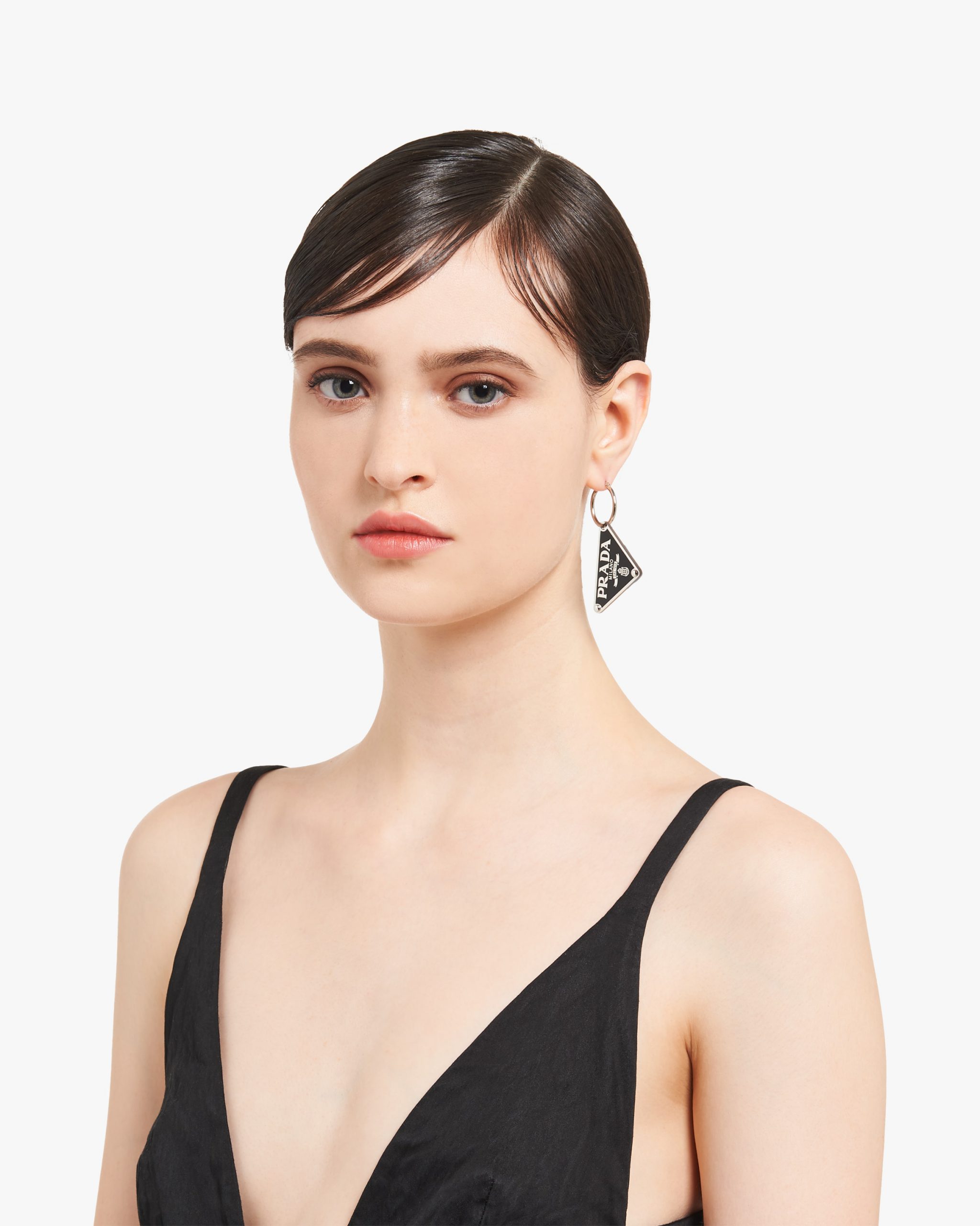 Iconic and sleek, the triangle logo is the protagonist of a new line of jewelry made of 925 sterling silver that reinterprets punk influences in a modern way. Prada’s historic symbol decorated with enamel defines this single earring.