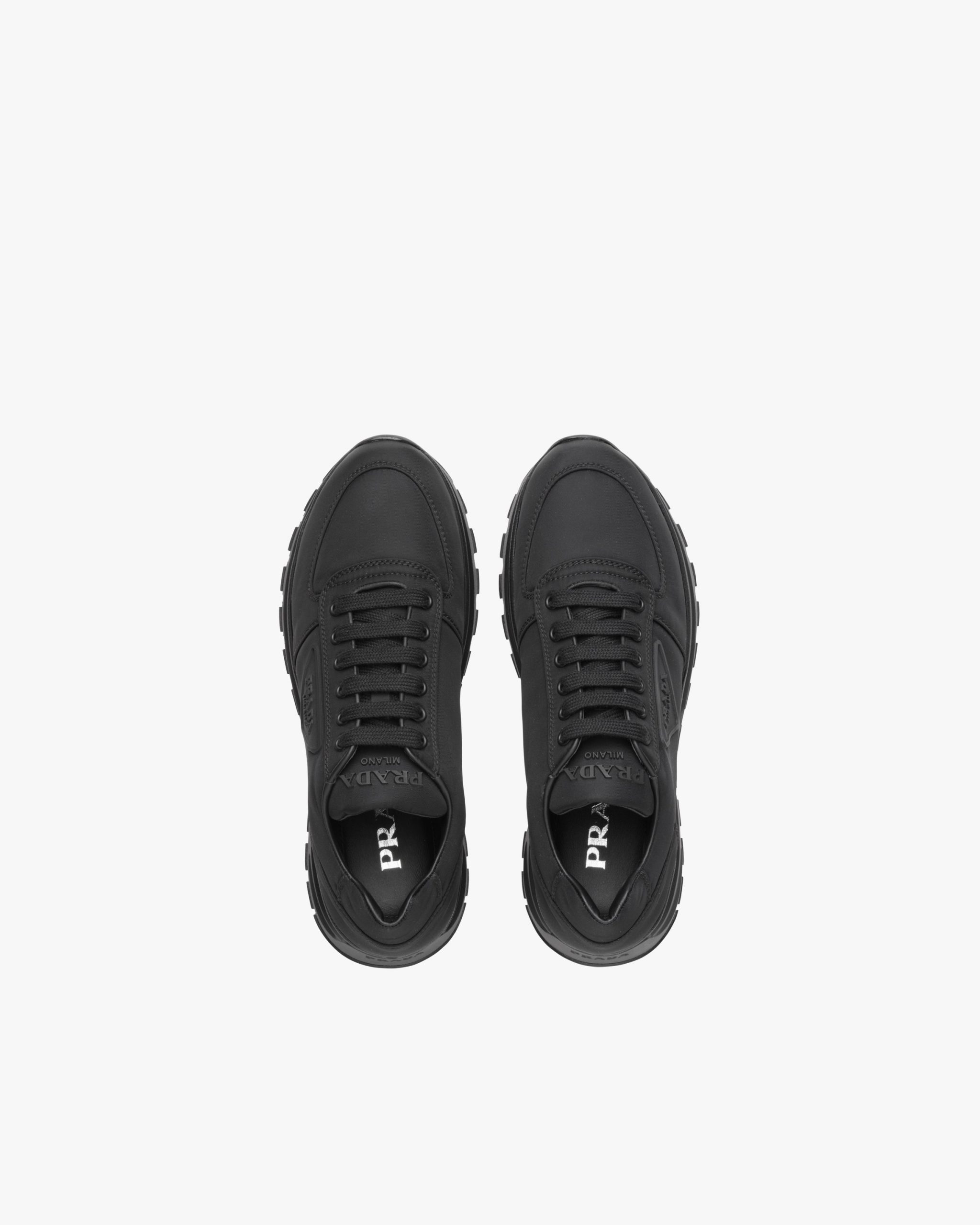 These Prada Prax sneakers made of Re-Nylon Gabardine fabric have a distinctive sporty design. The upper features decorative stitching and the iconic rubber triangle logo in relief. The sole has a distinctive geometric design.