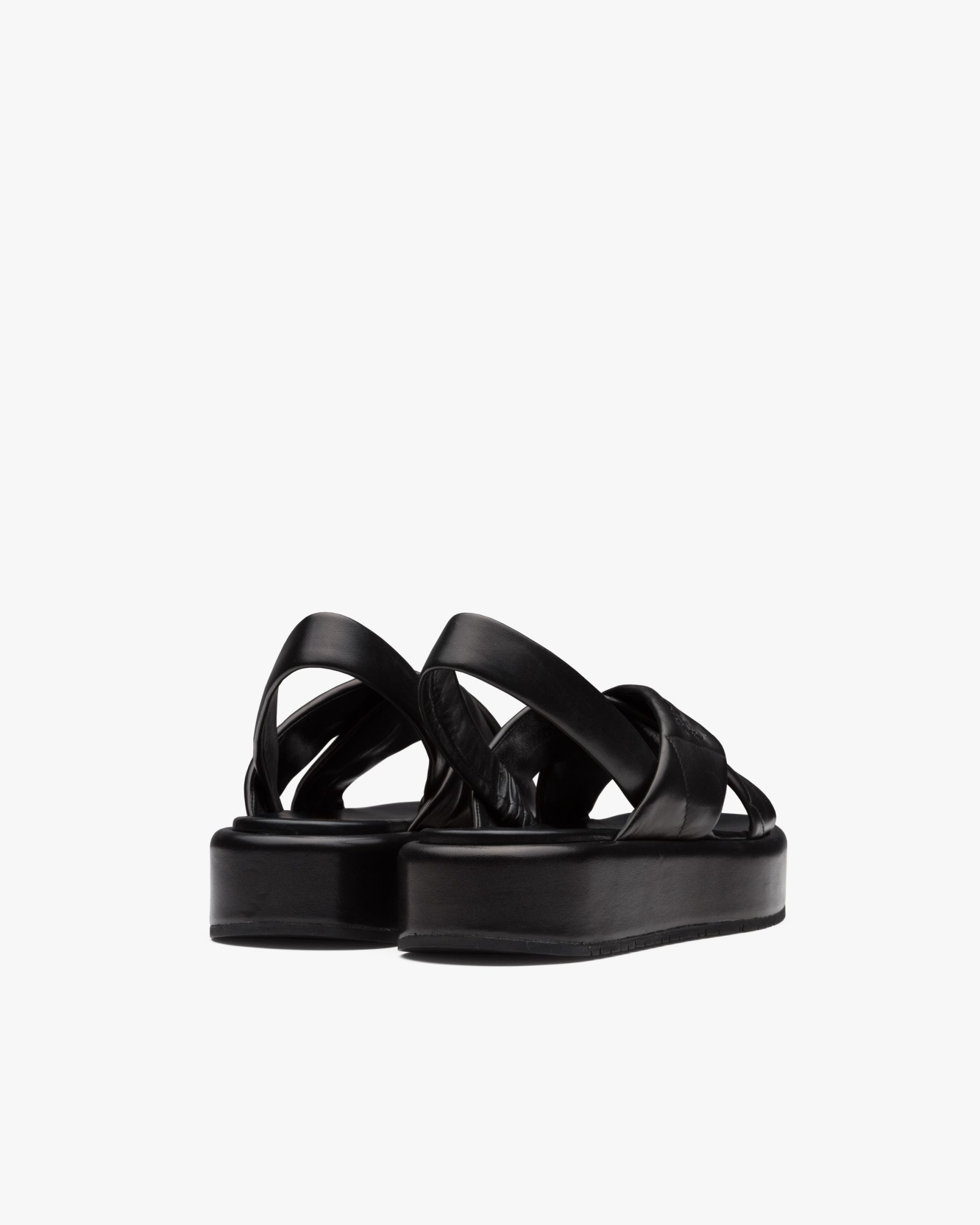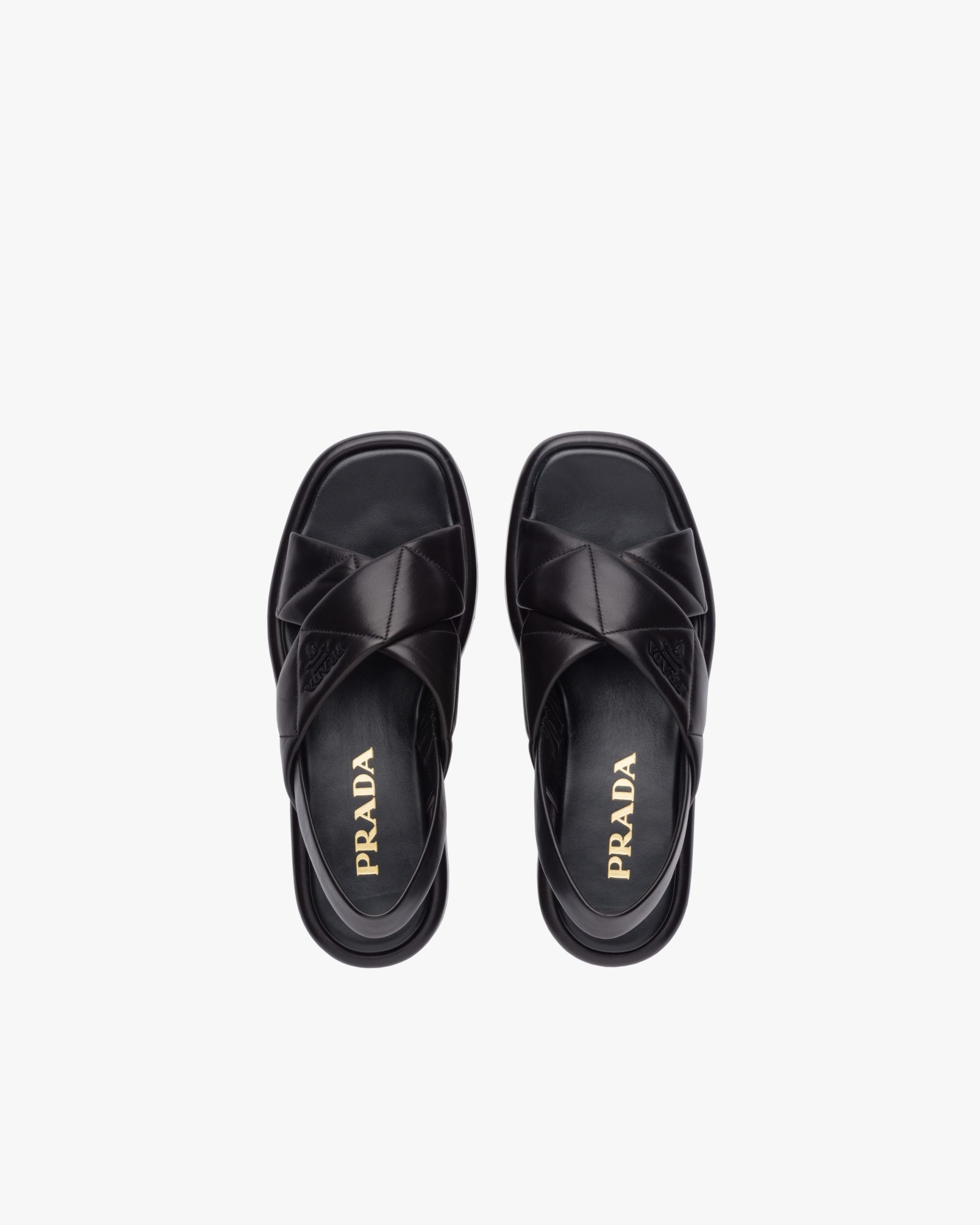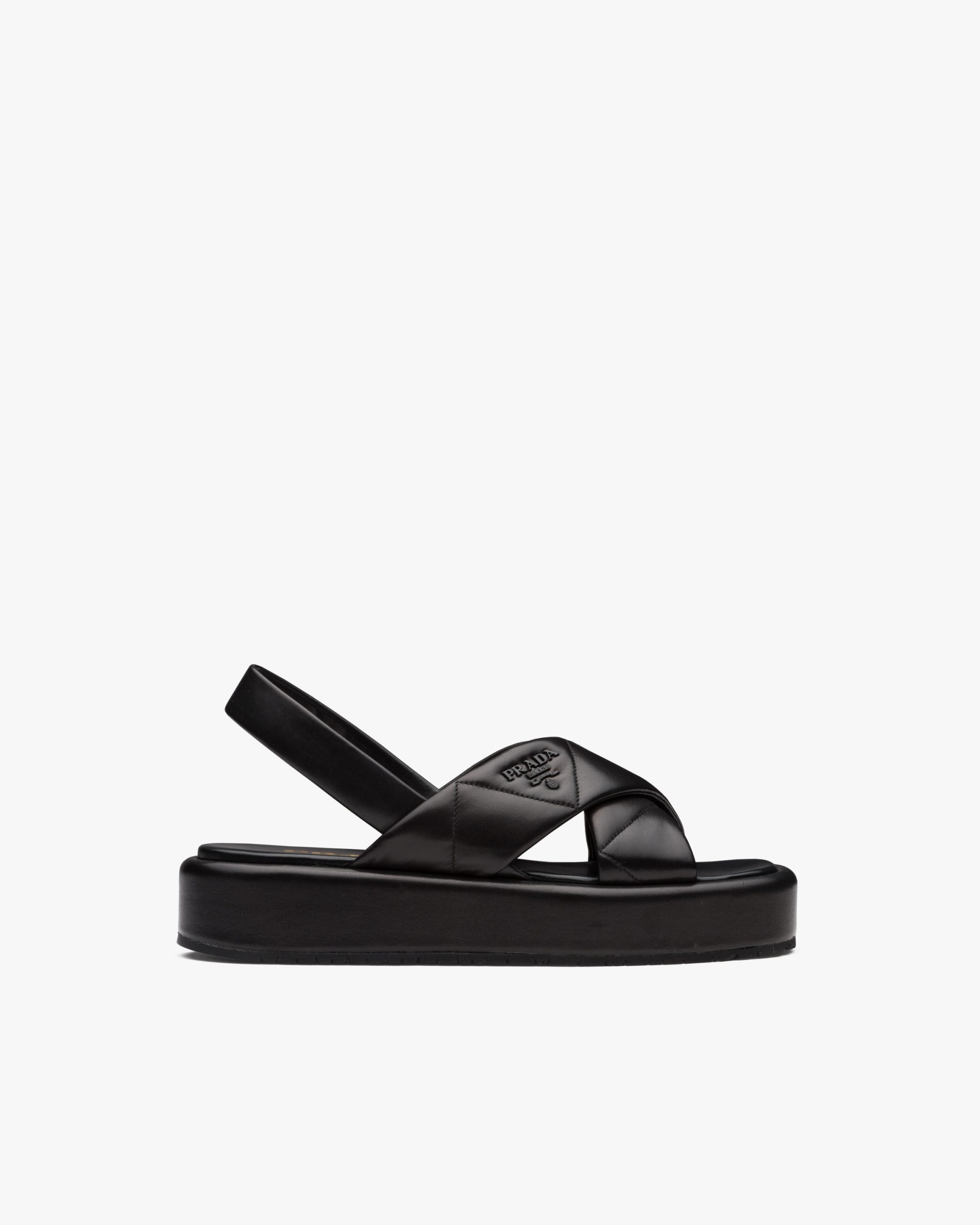 Volume, soft lines and references to the 90s define these sandals on a leather-covered flatform sole. The iconic Prada triangle is echoed in the quilted motif of the soft nappa leather of these sandals accented by the lettering logo.