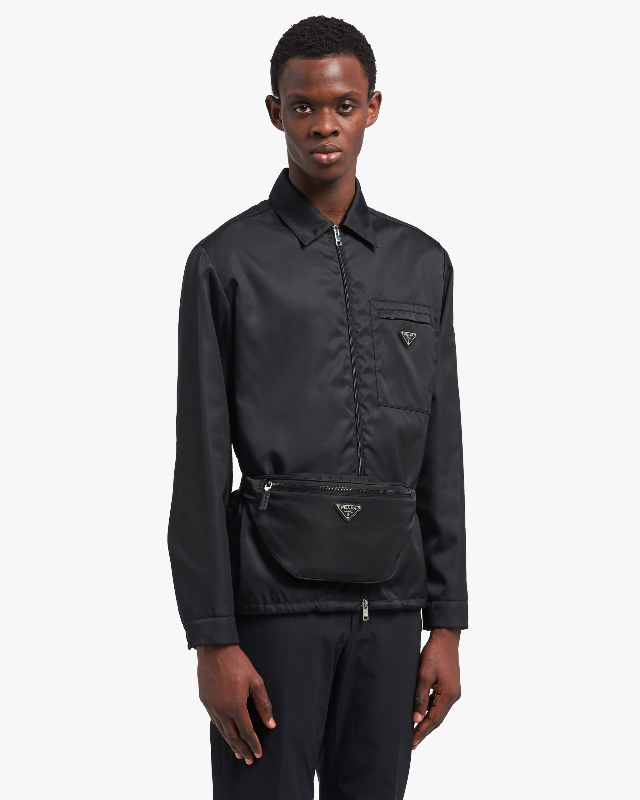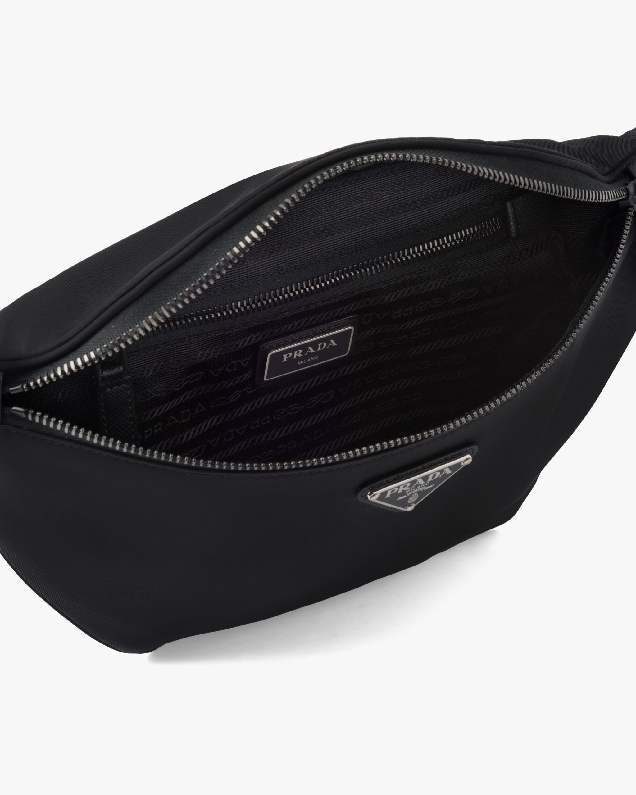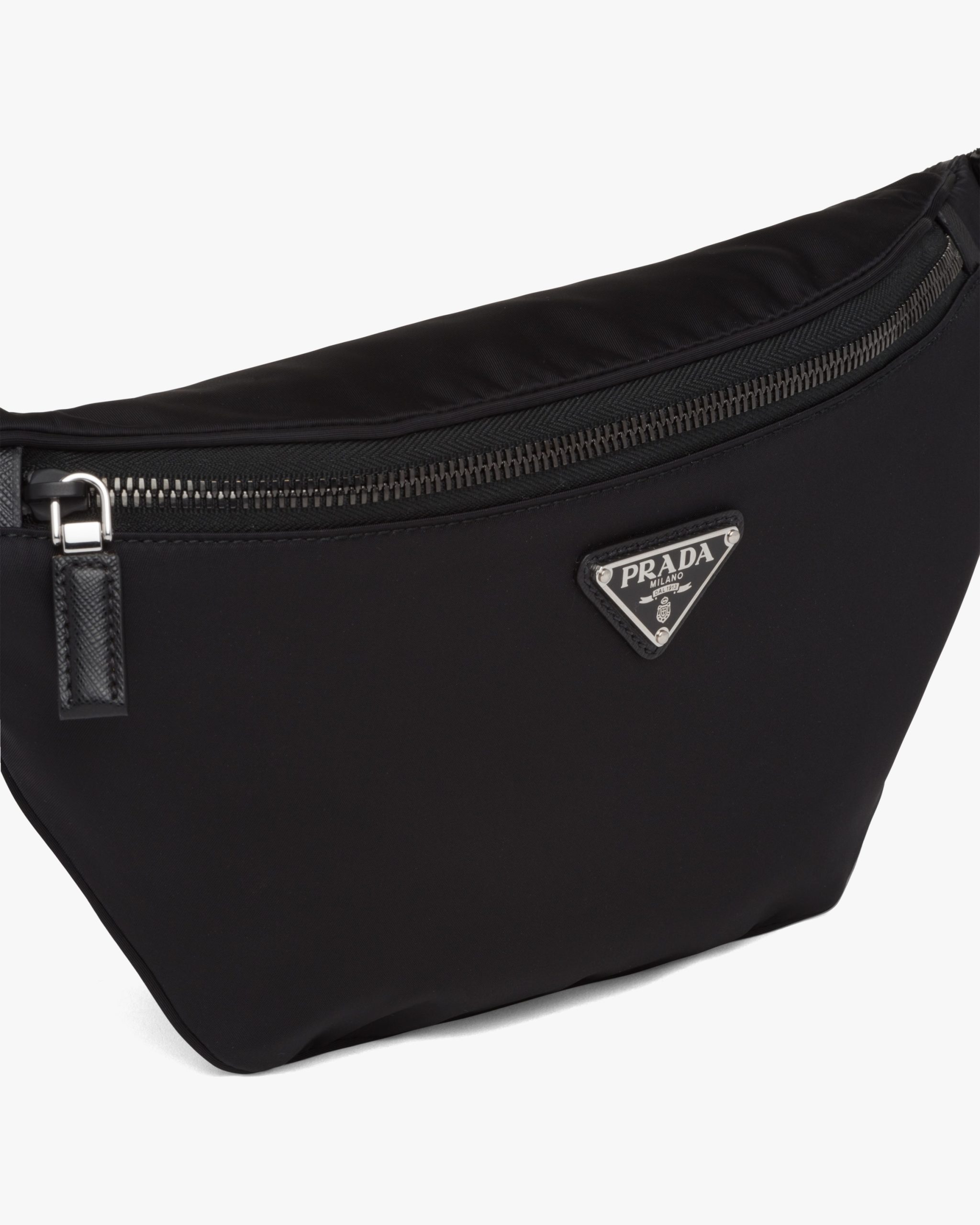 A contemporary design with references to the streetwear world defines this belt bag in Saffiano leather and Re-Nylon, a regenerated yarn produced from recycled plastic trash collectsed in the ocean. The accessory is decorated with a tonal Prada triangle logo. An adjustable nylon tape belt completes the design, defined by a zipper closure and logo-print Re-Nylon lining.