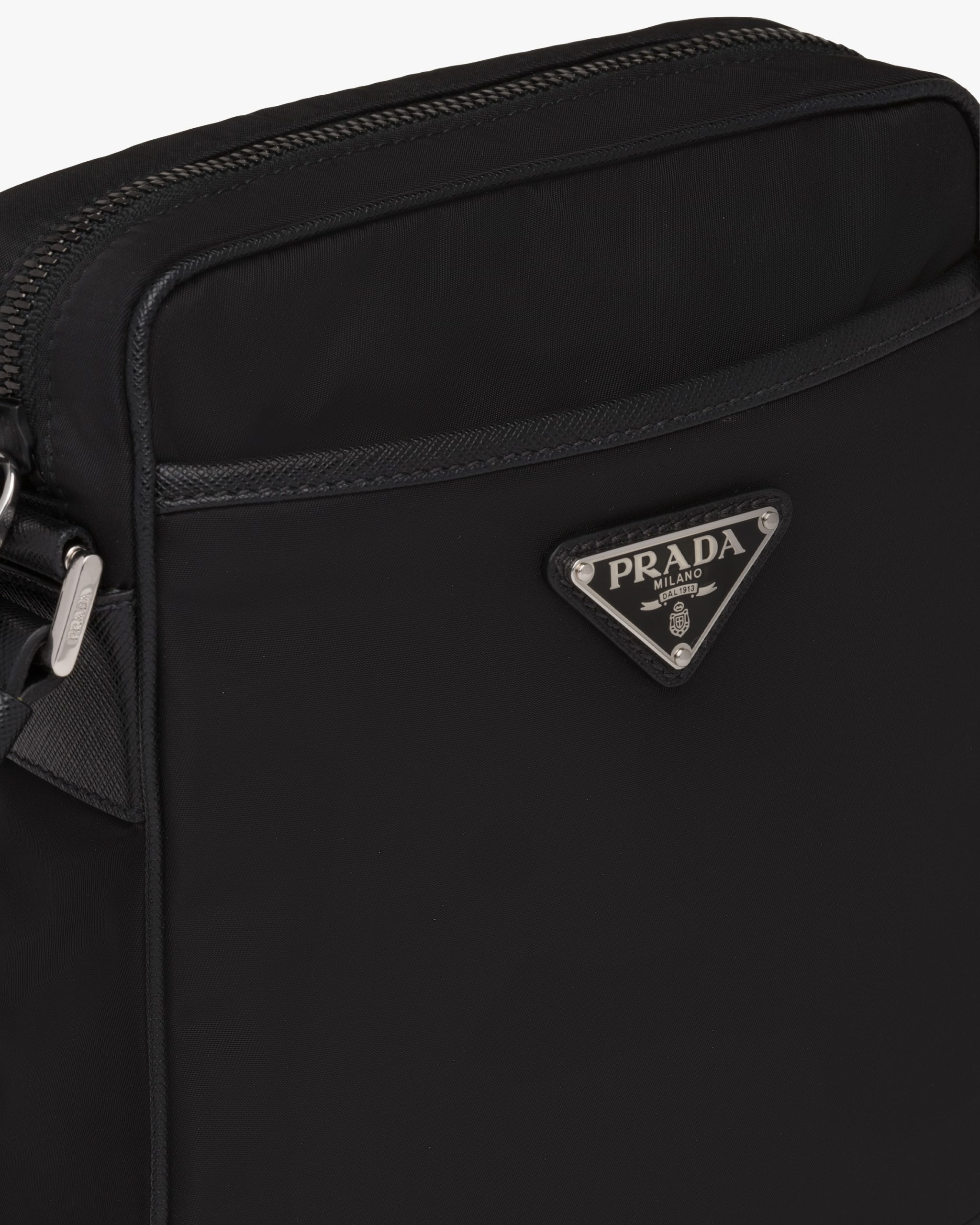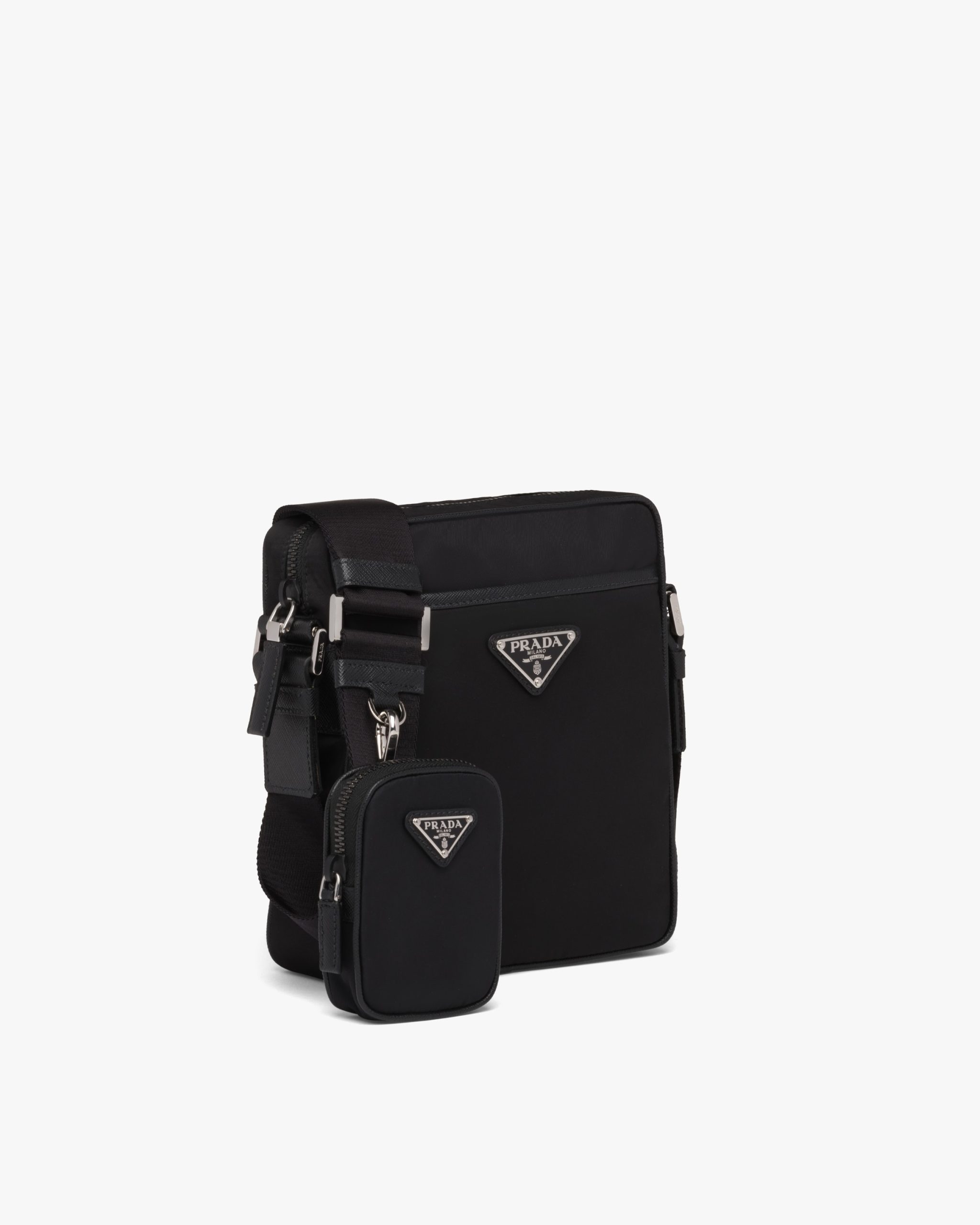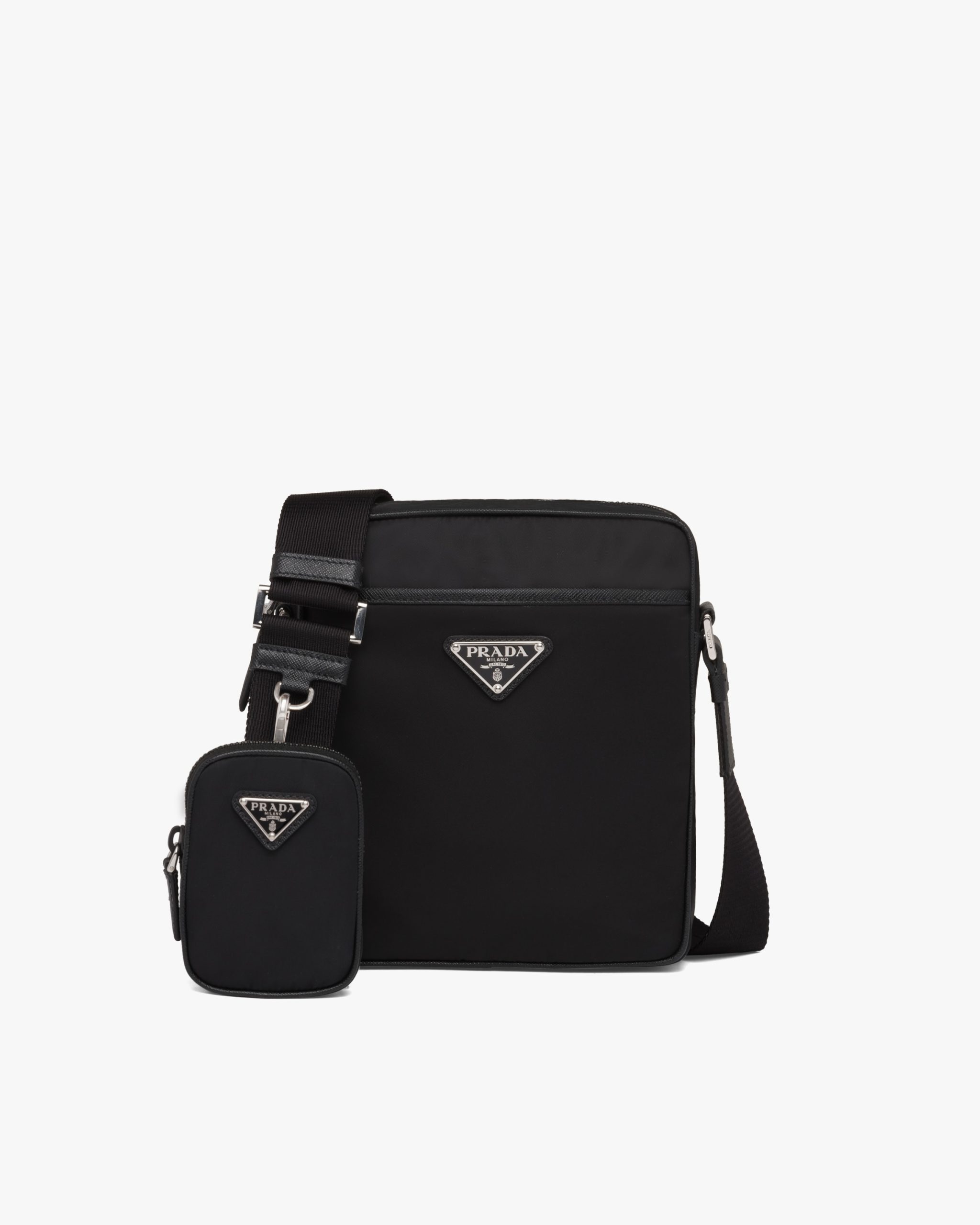 This shoulder bag with a functional, modern design made of Saffiano leather and Re-Nylon, a regenerated yarn produced from recycled plastic trash collectsed in the ocean, stands out for its removable pouch and versatile internal compartments. The accessory is decorated with the enameled metal triangle logo.